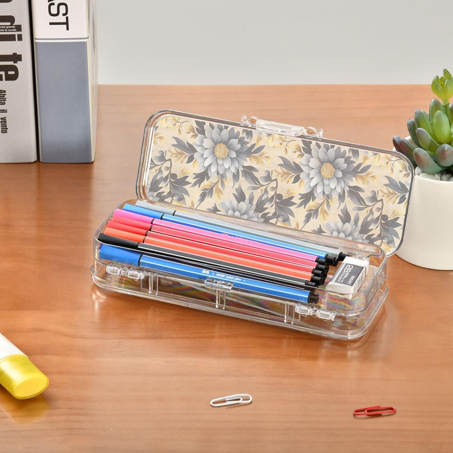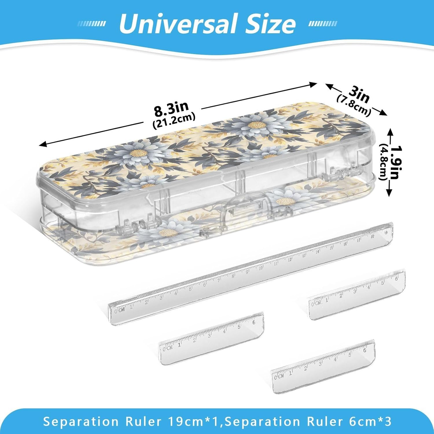 Plastica PET. Resistenza: presenta una struttura robusta e trasparente in PET. Facile da pulire; si consiglia il lavaggio a mano (non lavare in lavatrice/candeggina). Mantiene la chiarezza e resiste all'uso quotidiano negli zaini per l'apprendimento, il lavoro o i viaggi. Grande capacità: la scatola di plastica trasparente ha due strati per riporre penne, pennarelli, forniture artigianali o piccoli oggetti (gomme, clip, graffette). È perfetto per organizzare materiale scolastico. Consigliato per bambini dai 3 anni in su. Divisori regolabili: la scatola trasparente per matite presenta 3 divisori corti (6 cm) e 1 lungo (19 cm). Rimuovili liberamente per creare 6 scomparti, mantenendo tutti gli articoli di cancelleria organizzati e prevenendo perdite e disordine disordinato. Righelli di separazione multiuso: ogni divisore rimovibile funge da pratico righello piccolo (6 cm o 19 cm) per misurazioni rapide in classe o in viaggio. Coperchio affidabile: la chiusura a scatto assicura che entrambi gli strati rimangano al sicuro. Il contenuto rimane protetto e perfettamente posizionato.