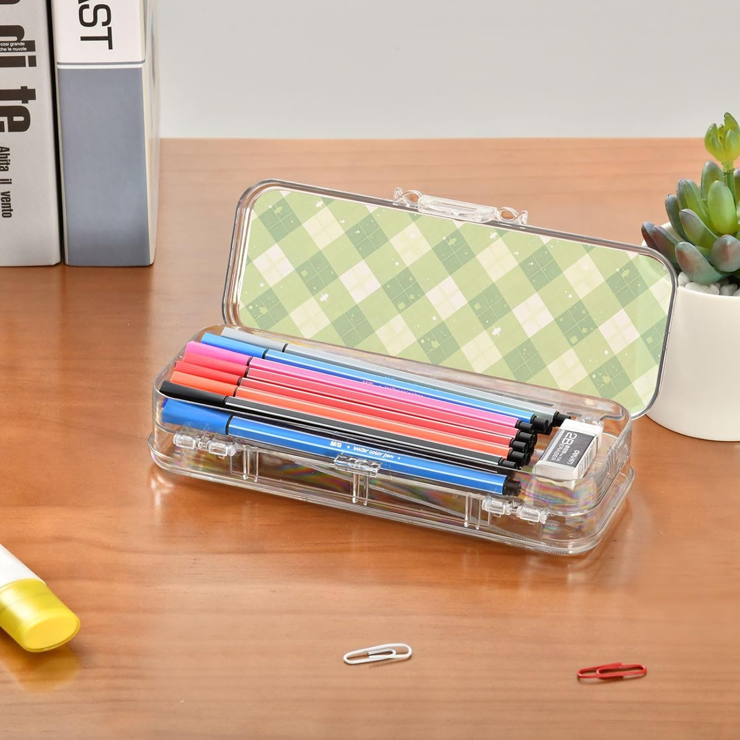 Trasparente e portatile: la scatola trasparente per matite è realizzata in plastica PET trasparente per una visibilità istantanea del contenuto. Dimensioni compatte (21,1 x 7,6 x 4,8 cm) per scuola, ufficio, viaggi o avventure di schizzi all'aperto. Grande capacità: la scatola di plastica per matite ha due strati per riporre penne, pennarelli, forniture artigianali o piccoli oggetti (gomme, clip, graffette). È perfetto per organizzare materiale scolastico. Consigliato per bambini dai 3 anni in su. Conservazione personalizzabile: la scatola trasparente include 3 divisori corti (6 cm) e 1 lungo (19 cm). Rimuovili facilmente per progettare 6 sezioni, risolvendo la disorganizzazione e mantenendo ogni piccolo oggetto classificato. Portatile e sicuro: custodia compatta per scuola, ufficio, gite o viaggi. La chiusura a scatto mantiene il contenuto al sicuro durante . Trasporta oggetti artistici, articoli di cancelleria o oggetti essenziali da viaggio ordinatamente organizzati Soluzione versatile per l'organizzazione: design di archiviazione su due lati. Separa facilmente diversi oggetti (matite contro gomme). Aiutare bambini e adulti a mantenere in ordine scrivanie, borse o kit di attività.