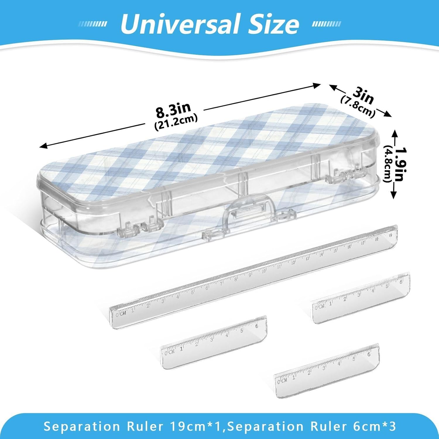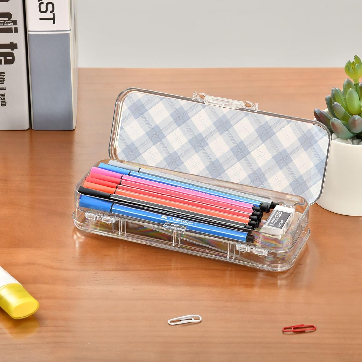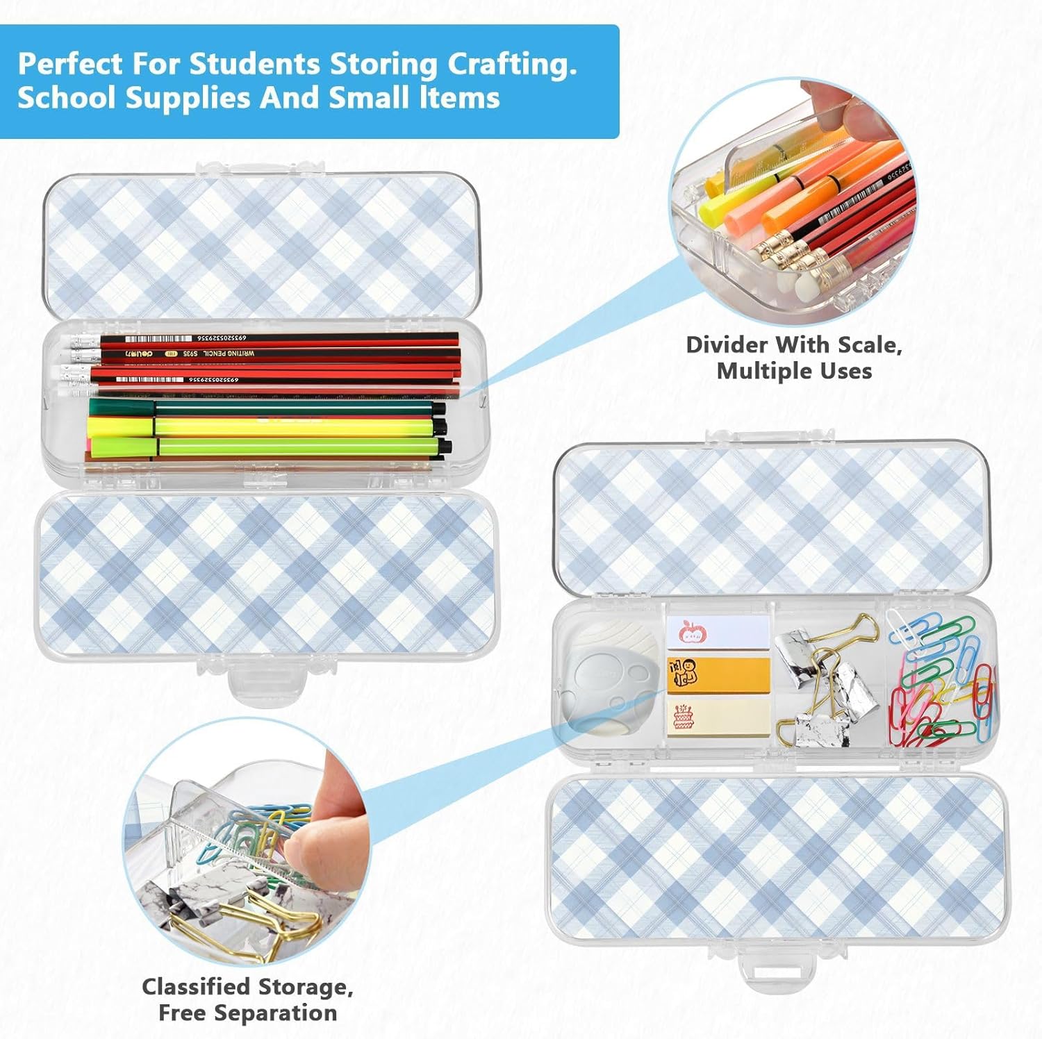 Trasparente e portatile: la scatola trasparente è realizzata in plastica PET trasparente per una visibilità istantanea del contenuto. Dimensioni compatte (21,1 x 7,6 x 4,8 cm) per scuola, ufficio, viaggi o avventure di schizzi all'aperto. Grande capacità: la scatola trasparente per matite ha due strati per riporre penne, pennarelli, forniture artigianali o piccoli oggetti (gomme, clip, graffette). È perfetto per organizzare materiale scolastico. Consigliato per bambini dai 3 anni in su. Conservazione personalizzabile: la scatola di plastica include 3 divisori corti (6 cm) e 1 lungo (19 cm). Rimuovili facilmente per progettare 6 sezioni, risolvendo la disorganizzazione e mantenendo ogni piccolo oggetto classificato. Righelli di separazione multiuso: ogni divisore rimovibile funge da pratico righello piccolo (6 cm o 19 cm) per misurazioni rapide in classe o in viaggio. Coperchio affidabile: la chiusura a scatto assicura che entrambi gli strati rimangano al sicuro. Il contenuto rimane protetto e perfettamente posizionato.
