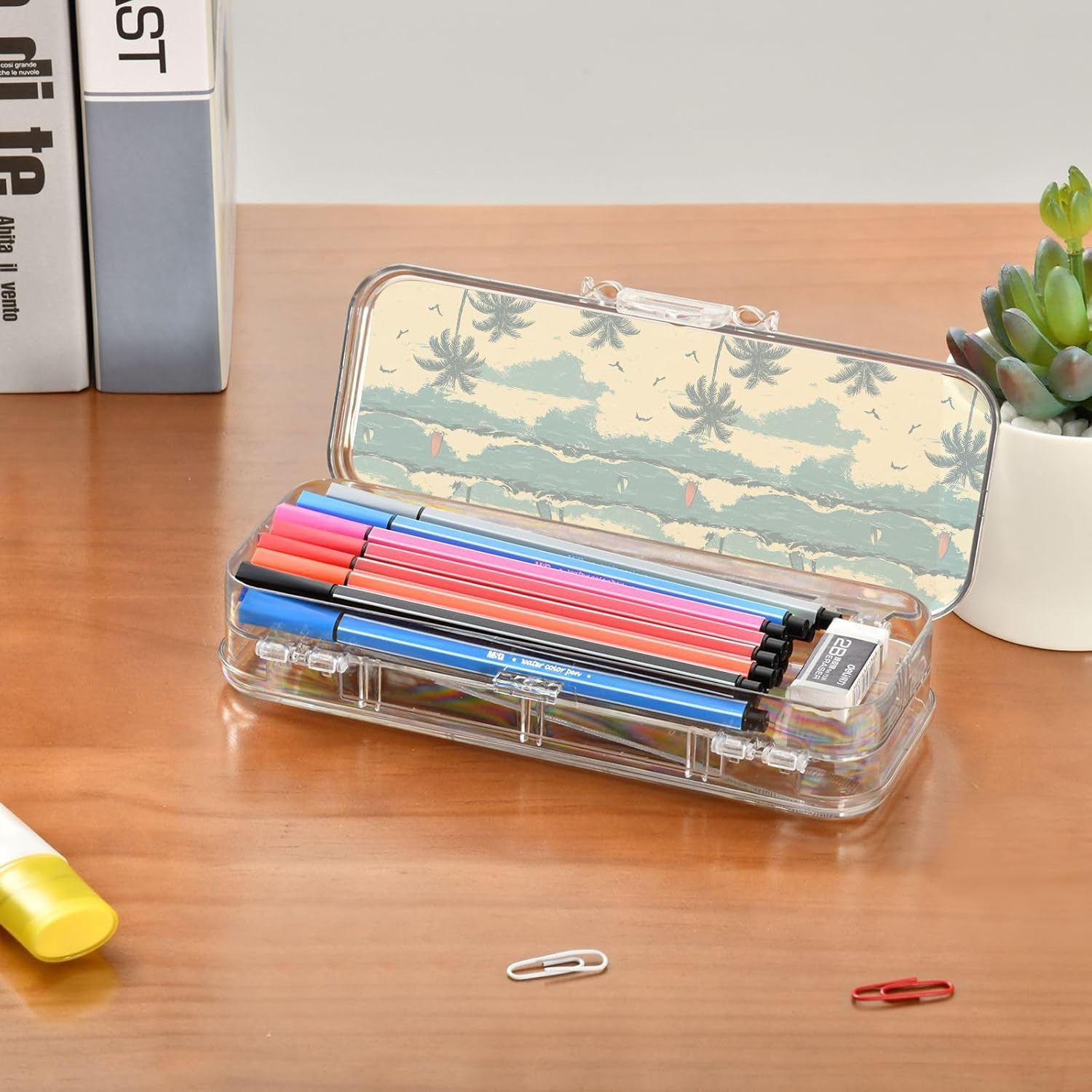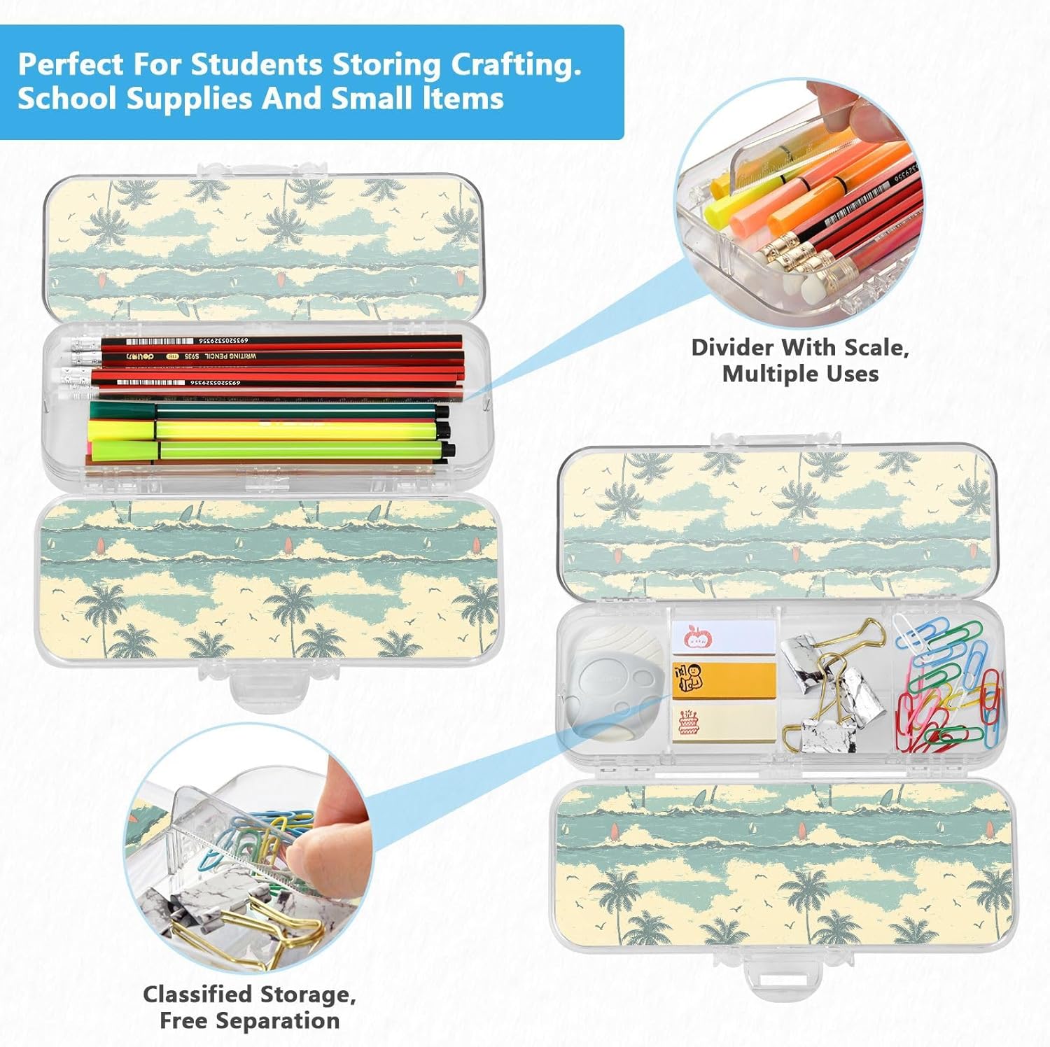 Trasparente e portatile: la scatola trasparente per matite è realizzata in plastica PET trasparente per una visibilità istantanea del contenuto. Dimensioni compatte (21,1 x 7,6 x 4,8 cm) per scuola, ufficio, viaggi o avventure di schizzi all'aperto. Design trasparente a doppio strato: massimizza lo spazio di archiviazione nel minimo spazio. Due scomparti in plastica PET trasparente per matite, pennarelli, gomme, clip e altro ancora. Perfetto per mantenere la scuola, l'ufficio o oggetti artigianali visibili e accessibili. Adatto per bambini dai 3 anni in Scomparti personalizzabili: include 3 divisori corti + 1 lungo rimovibile. Crea 6 sezioni o spazi aperti liberamente. I divisori fungono da pratici righelli. Organizza penne, piccoli oggetti in modo sicuro, evitando perdite e disordine senza sforzo. Portatile e sicuro: custodia compatta per scuola, ufficio, gite o viaggi. La chiusura a scatto mantiene il contenuto al sicuro durante . Trasporta oggetti artistici, articoli di cancelleria o oggetti essenziali da viaggio ordinatamente organizzati Soluzione versatile per l'organizzazione: design di archiviazione su due lati. Separa facilmente diversi oggetti (matite contro gomme). Aiutare bambini e adulti a mantenere in ordine scrivanie, borse o kit di attività.