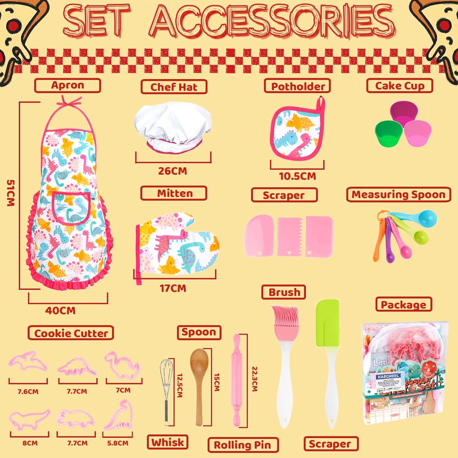 Set da forno realistico per bambini: che si tratti di cuocere al forno, biscotti o stendere l'impasto, il tuo bambino sperimenterà una varietà di attività culinarie con questo set da forno. Il nostro set di costumi per giochi di ruolo per bambini è realizzato con materiali di alta qualità. Tutti gli accessori del set da cucina sono adatti ai bambini. Tu e i tuoi bambini vivrete esperienze più piacevoli e interessanti in cucina. Goditi i momenti in famiglia: i giocattoli di ruolo consentono ai bambini di provare il divertimento del gioco di ruolo, trascorrendo momenti felici tra genitori, figli e amici. I bambini possono vestirsi con questo simpatico grembiule rosa da dinosauro e imparare a cucinare, preparare biscotti e pasticcini, migliorando le abilità pratiche dei bambini. Incoraggia la creatività dei bambini: i bambini si divertiranno a cucinare con questo costume da chef per bambini. Lascia che tuo figlio eserciti il suo senso pratico e impari ad apprezzare il cibo e a rispettare il lavoro. Un regalo perfetto per il piccolo chef: questo costume da chef per bambini è perfetto per far iniziare a cucinare il tuo bambino. Regalo ideale per Natale, compleanno, vacanze o festival. Consigliato per ragazze e ragazzi dai 3 anni in su Set da cucina e da forno da 26 pezzi per bambini: il set comprende 26 accessori da cucina e da forno, tra cui grembiule da dinosauro, cappello da chef, presine, guanti, cucchiai, mattarello e altro ancora. Il set da cucina per bambini include tutto il necessario per il gioco di ruolo