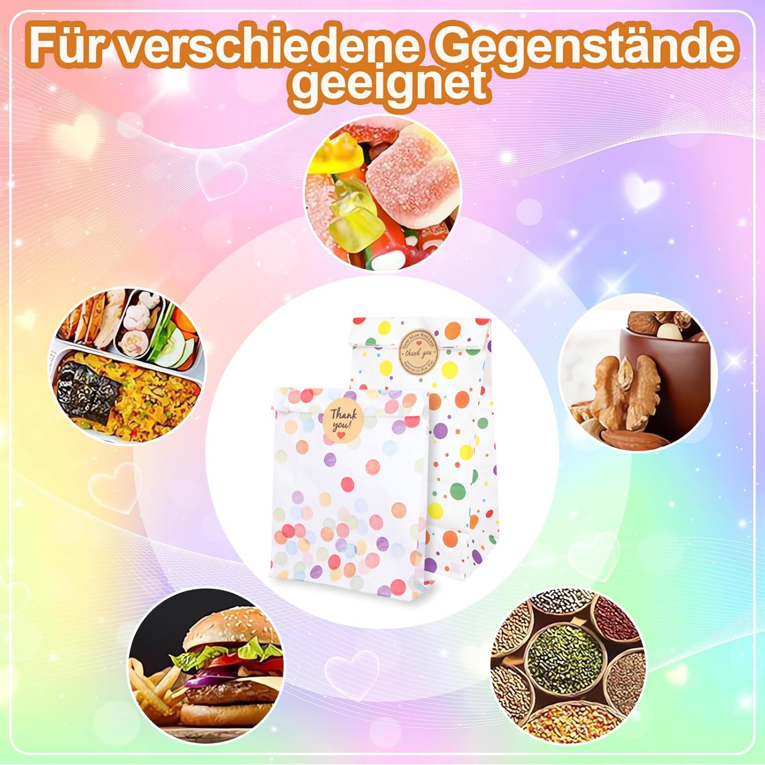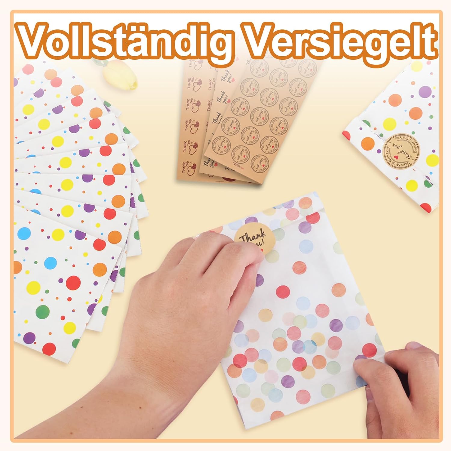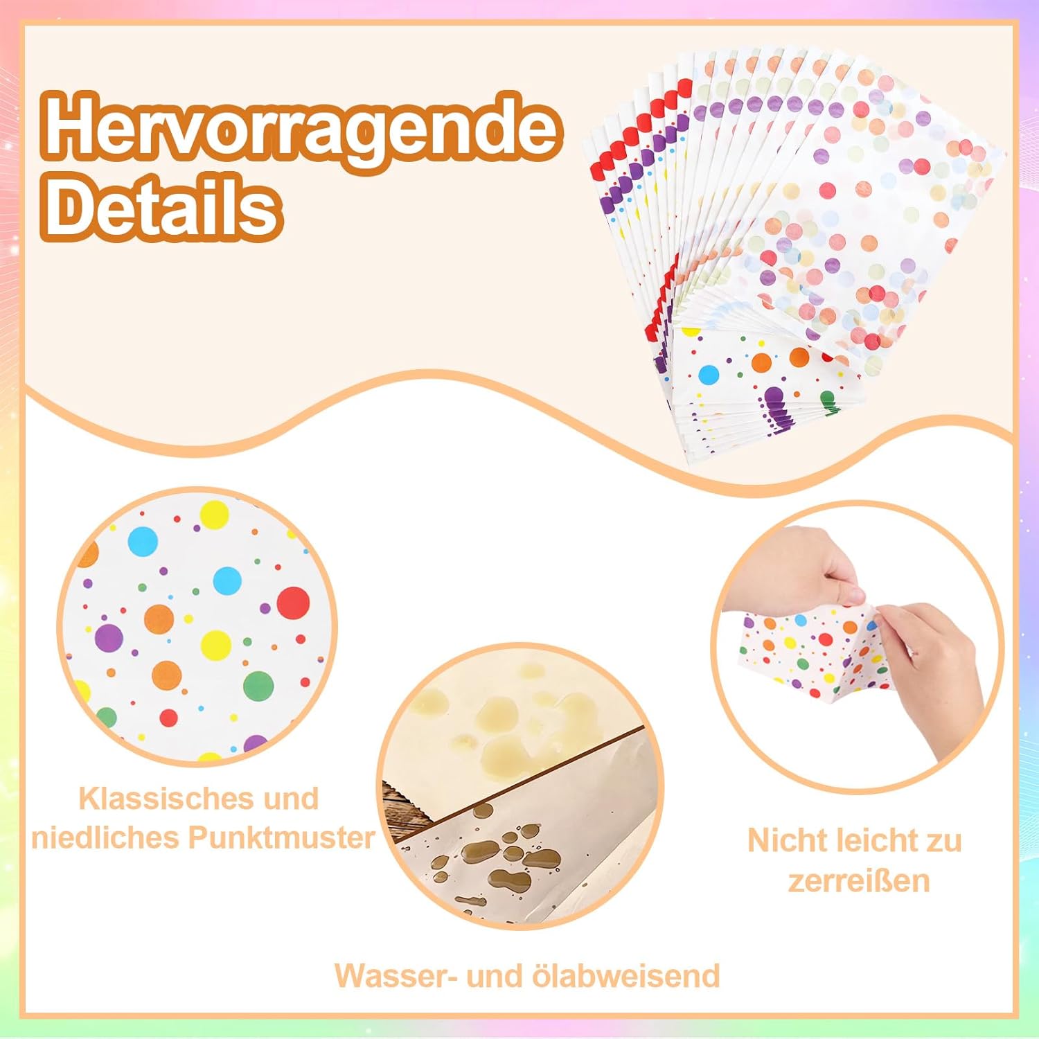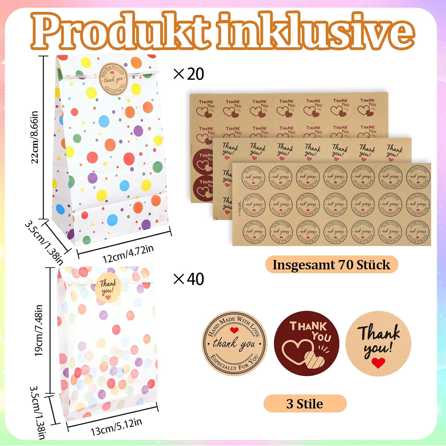 [Set confezioni regalo]: include 60 sacchetti regalo e 70 adesivi. I sacchetti regalo sono disponibili nelle misure 13×19 cm (40 pezzi) e 12×22 cm (20 pezzi), gli adesivi per la chiusura dei sacchetti regalo sono disponibili in 3 diverse fantasie. La quantità è sufficiente per le vostre esigenze e garantisce un'atmosfera di compleanno particolarmente festosa! [Design elegante]: il motivo colorato a pois conferisce a queste borse un aspetto classico e molto carino. Il design dai colori vivaci è semplice e dinamico e porta gioia e relax nell'atmosfera della festa. [Design pratico]: disponibile in due dimensioni, questa confezione è perfetta per caramelle, cioccolatini e piccoli regali. Gli adesivi garantiscono che la confezione sia chiusa saldamente. Sono ideali per confezionare regali e bomboniere. Possono anche servire come decorazioni eleganti per aggiungere colore alla festa. [Materiale affidabile]: realizzato in carta spessa resistente all'olio, è leggero, resistente e riutilizzabile. Non si strappa facilmente, è facile da aprire o piegare e può essere riutilizzato. La struttura del sacchetto di carta piegato rimane stabile in modo che possa essere posizionata in sicurezza su un tavolo. [Ampia gamma di applicazioni]: questi sacchetti sono adatti per caramelle, biscotti, ciambelle, cioccolatini, popcorn, frutta e piccoli regali e sono ideali per decorazioni per feste, bomboniere e accessori.
