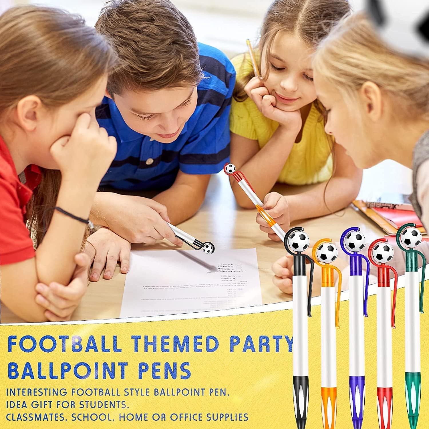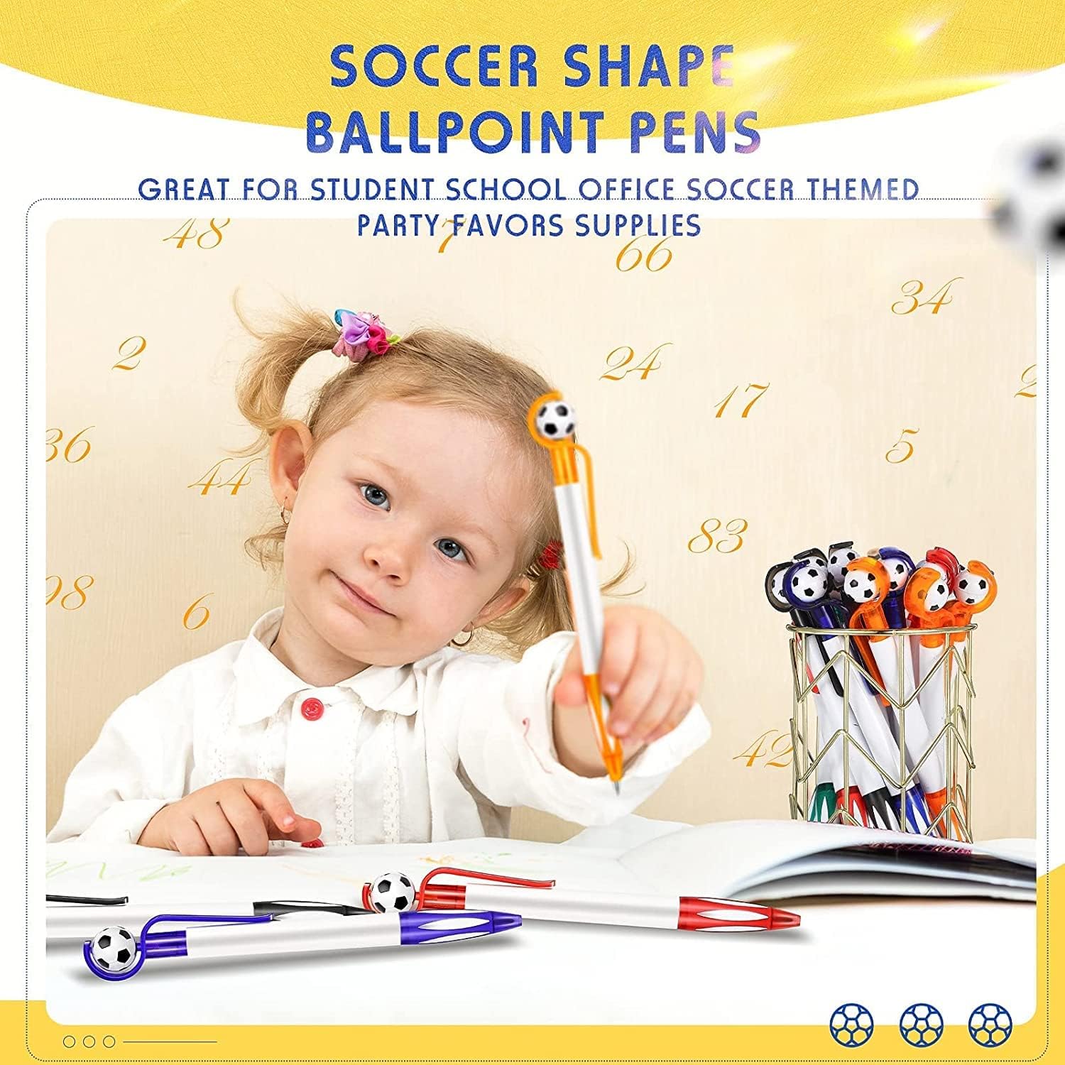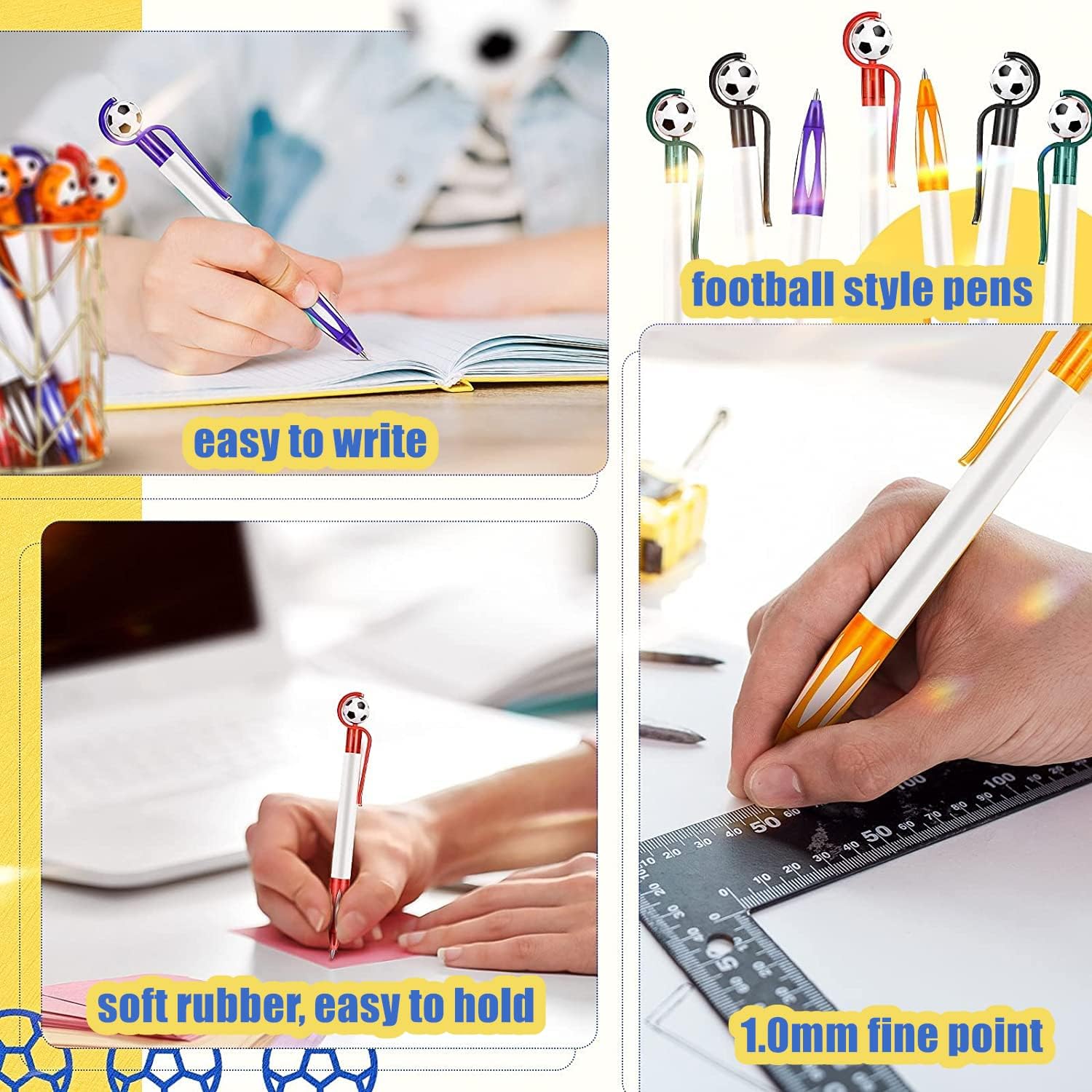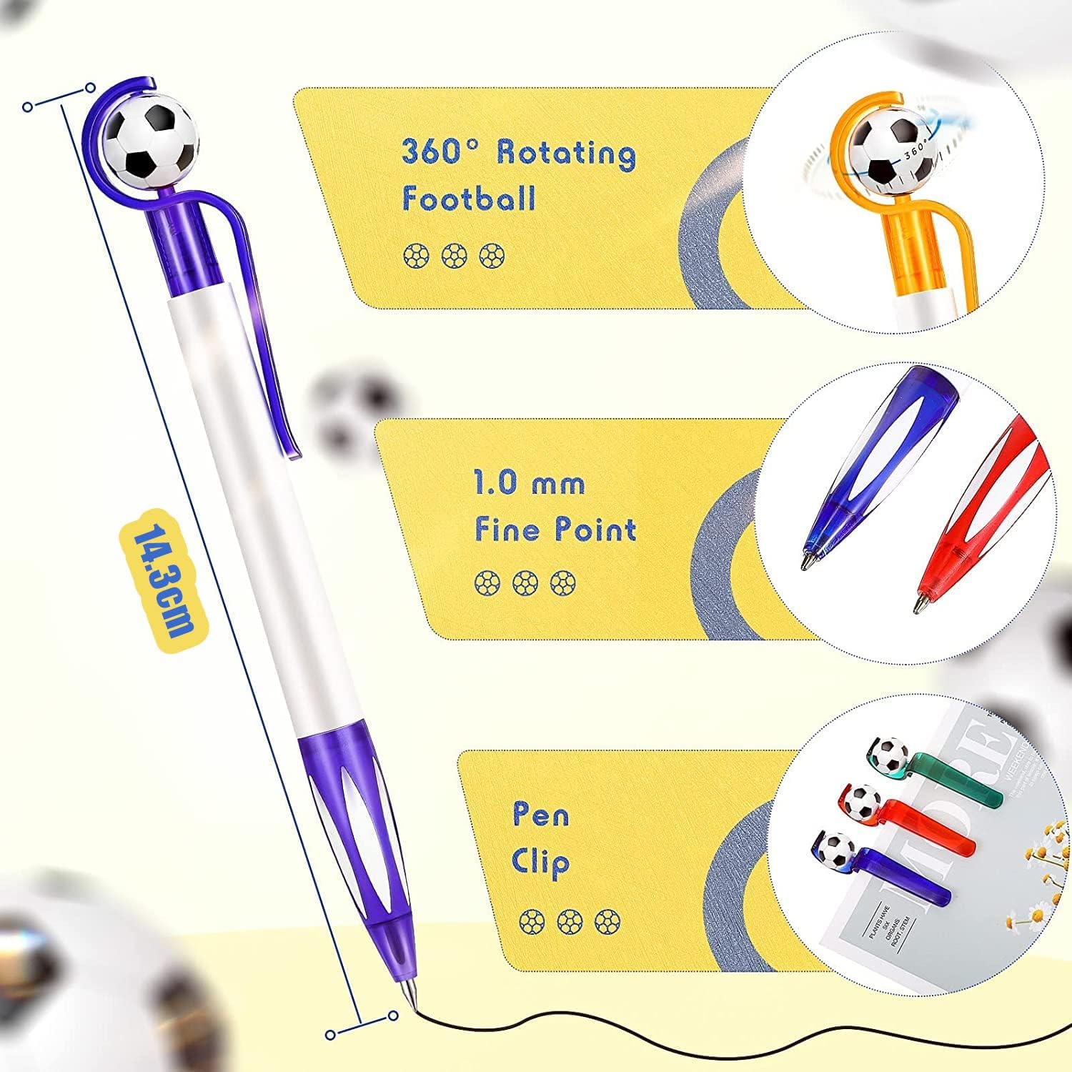 [Alta qualità] Il guscio è realizzato in plastica di alta qualità, liscio e non facile da rompere, la ricarica è realizzata con inchiostro di alta qualità, scaricato uniformemente, scrivendo liscio [Stile calcio] Vieni con 5 diversi colori di penne stile calcio: blu, nero, verde, arancione, rosso; il mini pallone da calcio sulla penna può essere ruotato di 360°, può alleviare lo stress [Facile da usare] La posizione dell'impugnatura è in gomma morbida, può aumentare l'attrito della presa, antiscivolo e confortevole; La clip della penna consente di agganciarla facilmente al libro o alla tasca, facile da trasportare e non facile da perdere [Dimensioni] Lunghezza: 14,3 cm, punta fine da 1,0 mm, 6 penne per ogni colore, 30 penne in totale, quantità e colori sufficienti possono soddisfare le esigenze di scrittura quotidiane dello scrittore, le ricariche sono sostituibili [Applicabile] Scrittura perfetta per promemoria, disegno, firma, pratica della calligrafia, schizzi, scarabocchi e prendere appunti; Un regalo ideale per studenti, bambini, impiegati, ecc.; Può anche essere usato come oggetti di scena per la fotografia, decorazioni in stile sportivo per ufficio e casa