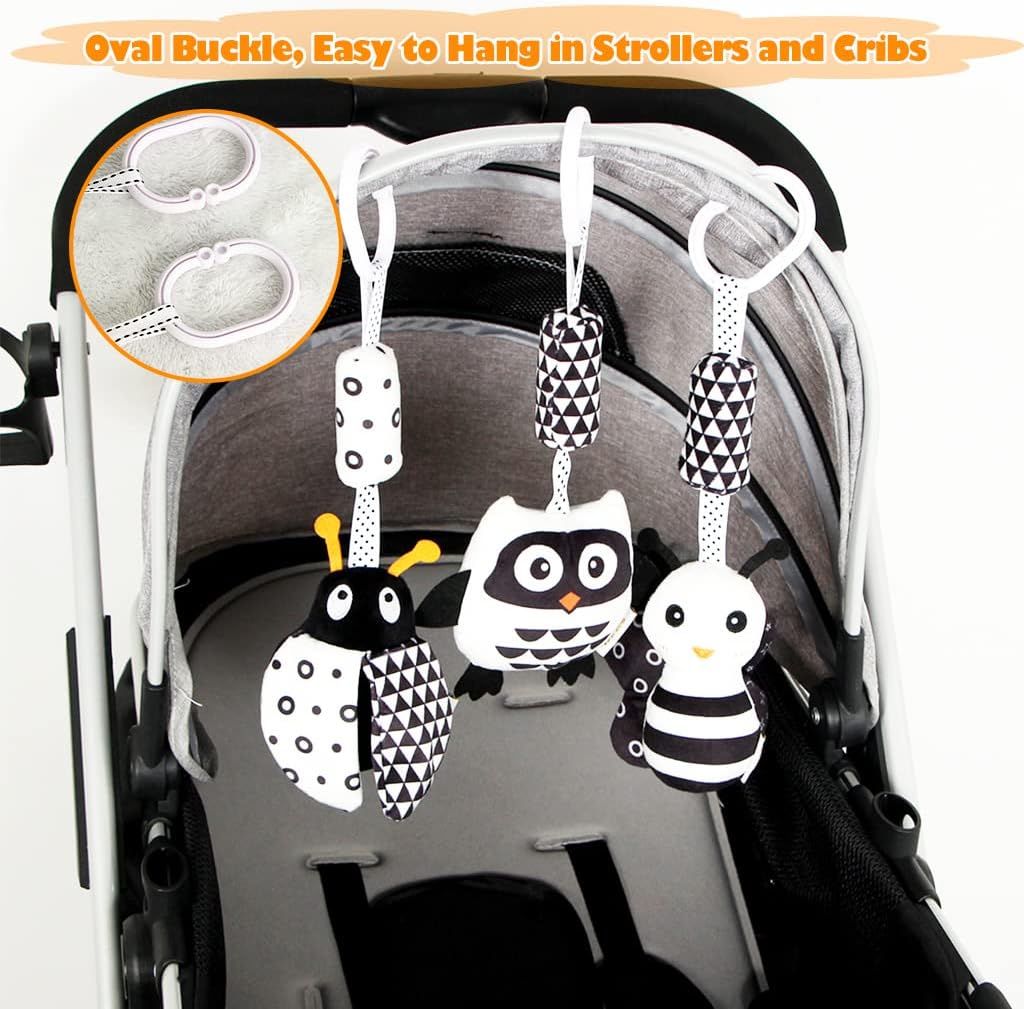 Sviluppa l'abilità visiva del bambino, il colore bianco e nero dei giocattoli per passeggino è la scelta migliore per lo sviluppo della visione del bambino, giocattolo per bambini ad alto contrasto, i nostri giocattoli da viaggio per bambini hanno 3 diversi disegni dei cartoni animati che possono coltivare la percezione del colore del bambino Migliora l'udito e la capacità di afferrare, i nostri morbidi giocattoli per bambini ad alto contrasto con campanello a vento possono migliorare il senso dell'udito e stimolare l'intenzione dei bambini di afferrare, giocattoli di peluche appesi progettati anche con carta sonora e funzioni di cigolio BB, è un buon giocattolo per seggiolino auto per la mamma per interagire con il bambino Facile da appendere ovunque, i giocattoli da appendere per neonati hanno un design con gancio a C che è facile da appendere ovunque, che si tratti di un passeggino, seggiolini auto, lettino o culla, come tappetino da palestra, tappetini da gioco, palestra, set da pavimento, ecc Materiale sicuro da usare, i giocattoli a sonaglio per bambini sono realizzati in materiale felpato super morbido, sicuro e confortevole, tutte le materie prime hanno rapporti di prova sicuri, non tossico per il bambino da usare Scelta regalo perfetta: i giocattoli da appendere per bambini sono un regalo perfetto per il tuo bambino come regalo di compleanno, regalo di Natale, regalo per neonati, regalo del Ringraziamento, regalo di Capodanno, è adatto per bambini da 0 a 3 mesi, bambino da 3 a 6 mesi, 6-12 mesi, giocattoli per bambini, giocattoli per bambini da 1 a 3 anni