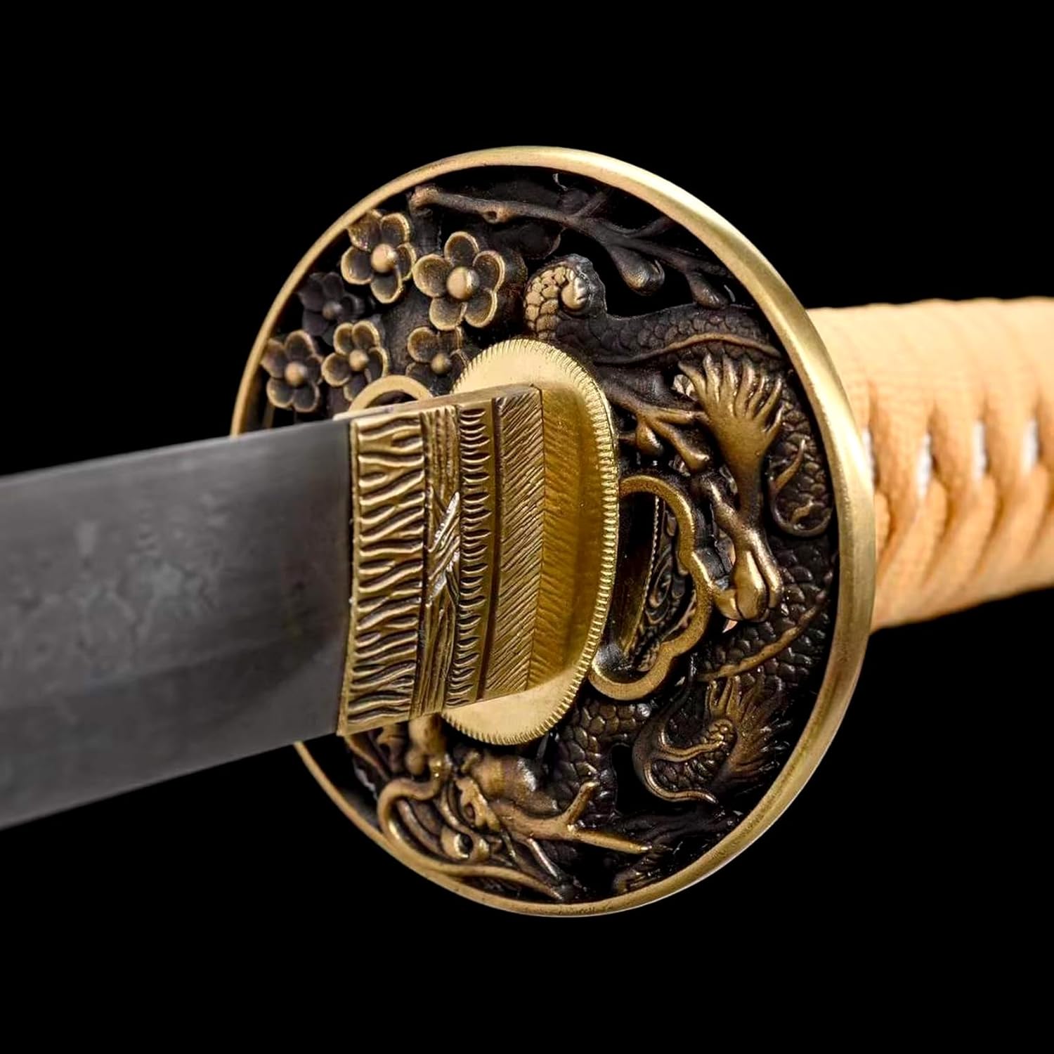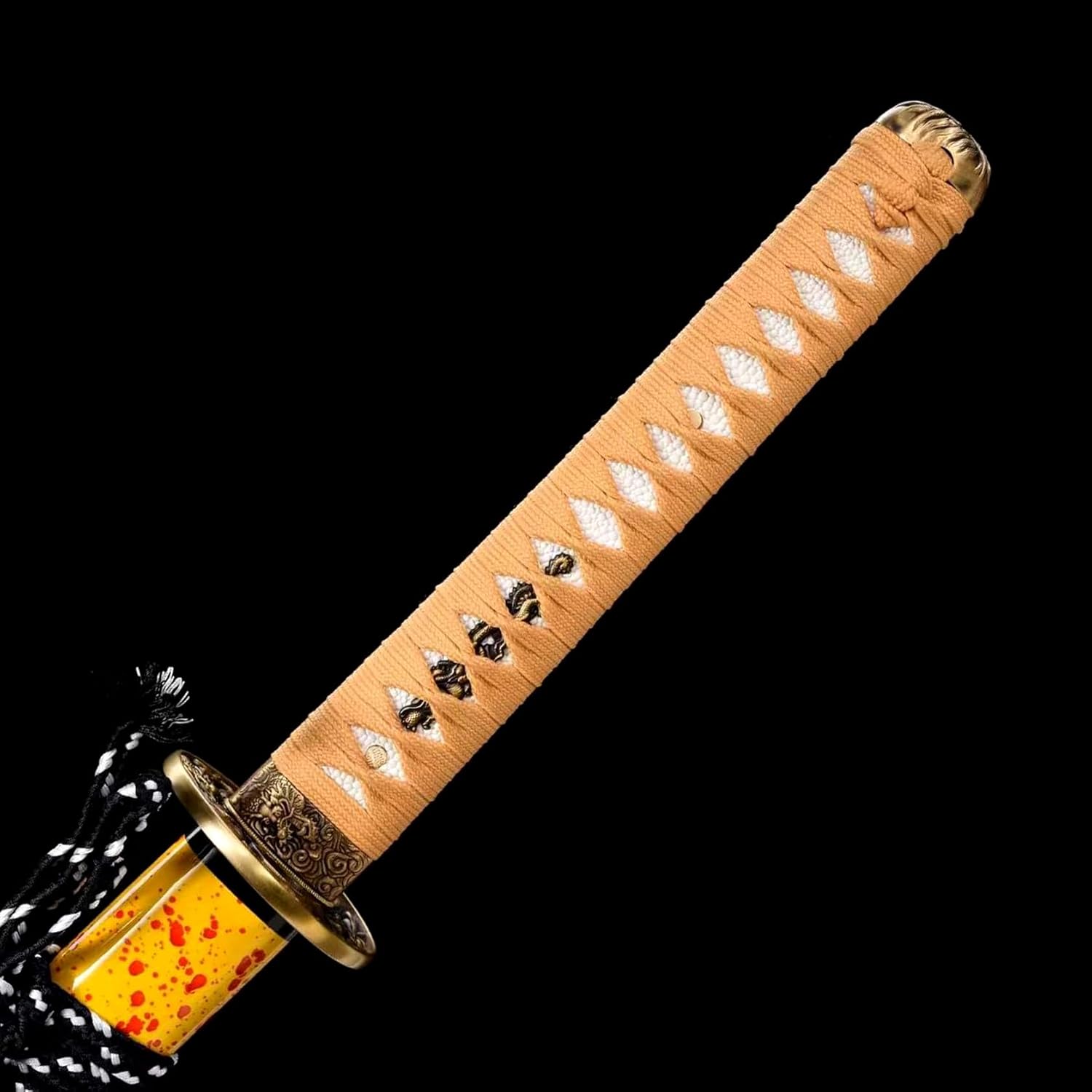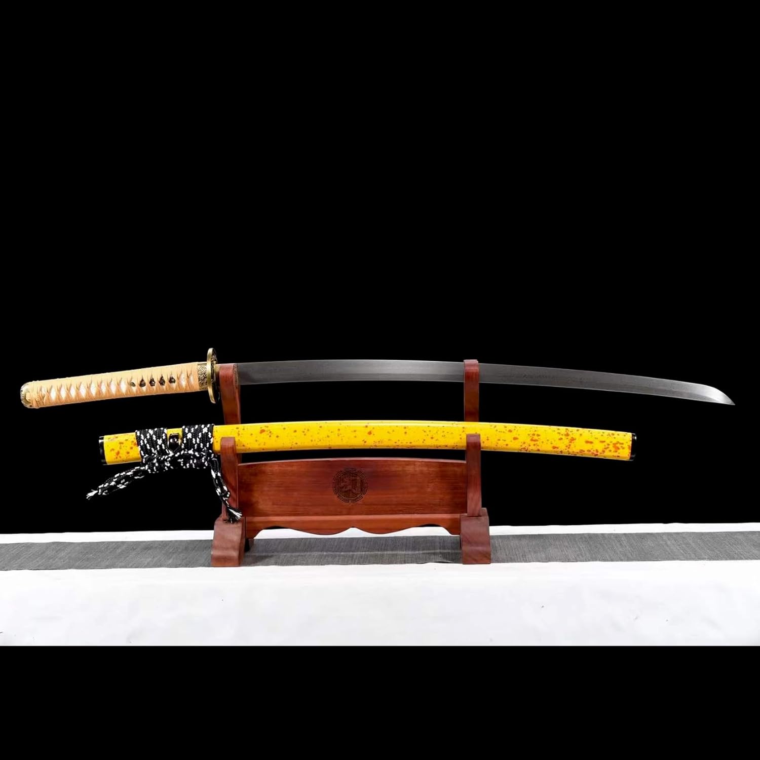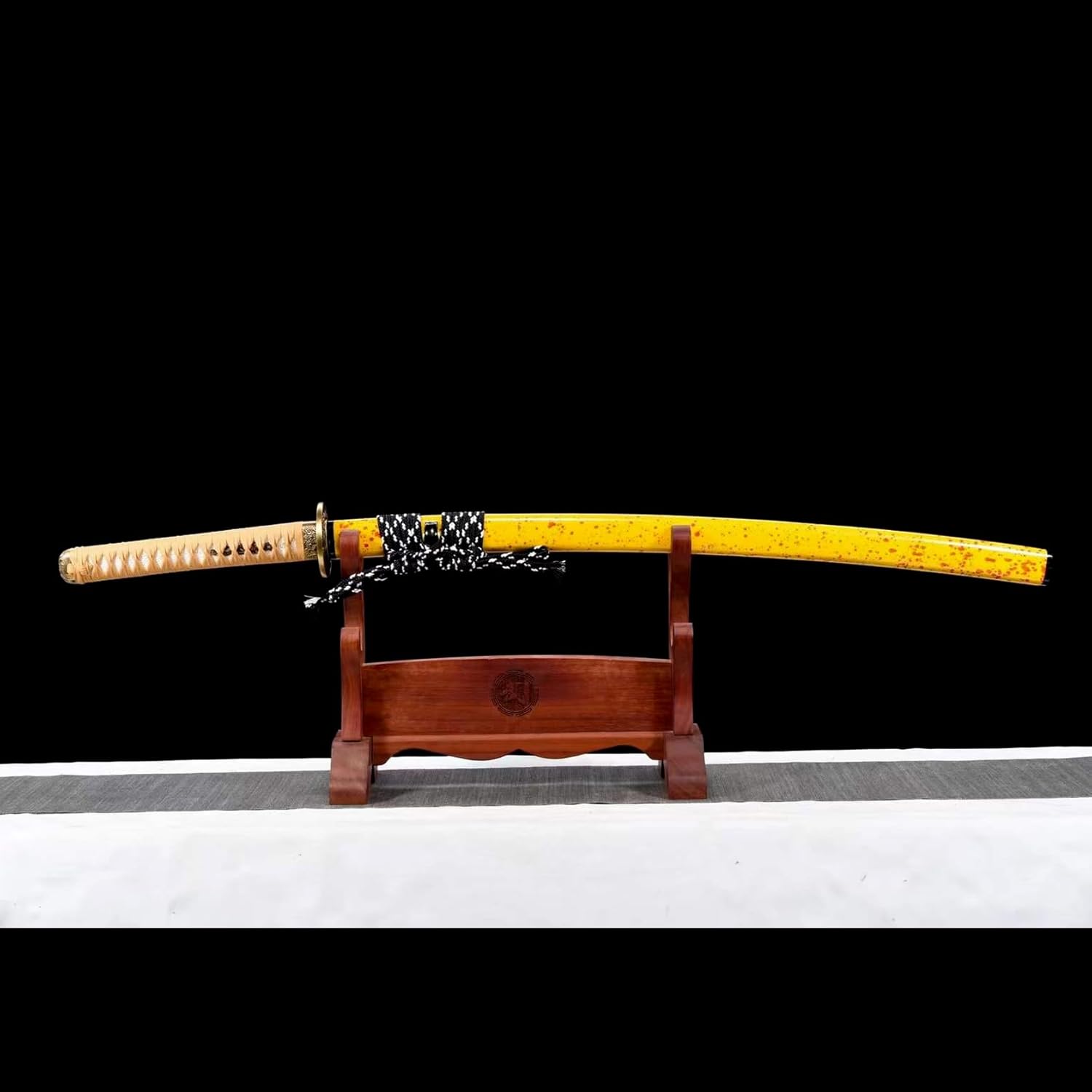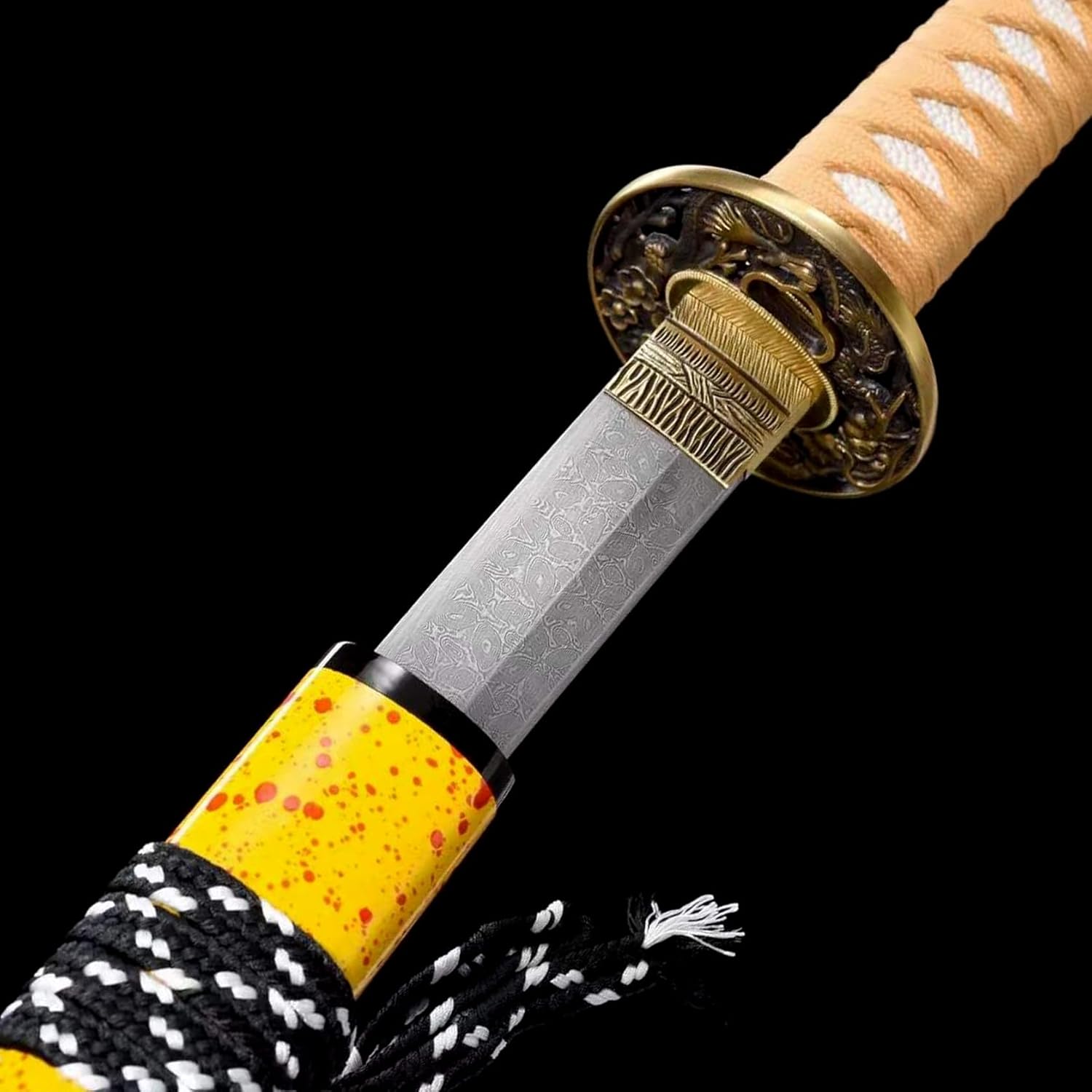 ❤️[Artigianato squisito]: la lama di questa spada da samurai è forgiata in acciaio modellato con un esclusivo motivo a quadrifoglio. Ogni modello è stato sottoposto a un complesso processo di piegatura, forgiatura, torsione e allungamento più volte, dimostrando le eccezionali capacità dell'artigiano e la massima ricerca del dettaglio. ❤️ [Prestazioni eccellenti]: la lama della spada katana è stata affilata a mano in 18 processi. Non solo ha una lucentezza straordinaria, ma raggiunge anche un perfetto equilibrio tra durezza e tenacità. È un buon prodotto adatto sia per la raccolta che per il combattimento vero e proprio. ❤️[Materiale selezionato]: il paramano è realizzato in rame puro ed è realizzato con cura, mostrando un temperamento nobile ed elegante. La guaina è realizzata in legno massello con vernice spray gialla, resistente e accattivante. Il design complessivo è armonioso e uniforme e dimostra un'elevata qualità. ❤️ [ Dimensioni esatte ]: la lunghezza totale della katana è 103 cm, la lunghezza della lama è 72 cm, la lunghezza del manico è 26 cm, la larghezza della lama è 3,2 cm, lo spessore della lama è 0,7 cm e il peso è di circa 1,25 kg. Proporzioni perfette, peso moderato, facile da trasportare e riporre, per soddisfare le esigenze di diverse occasioni. ❤️[Da non perdere]: la parte della maniglia è dotata di una corda avvolta a mano, che fornisce una presa più comoda. La katana è inoltre dotata di squisiti fili spessi e altre decorazioni dettagliate, che non solo migliorano l'estetica generale ma evidenziano anche l'ingegno del produttore.