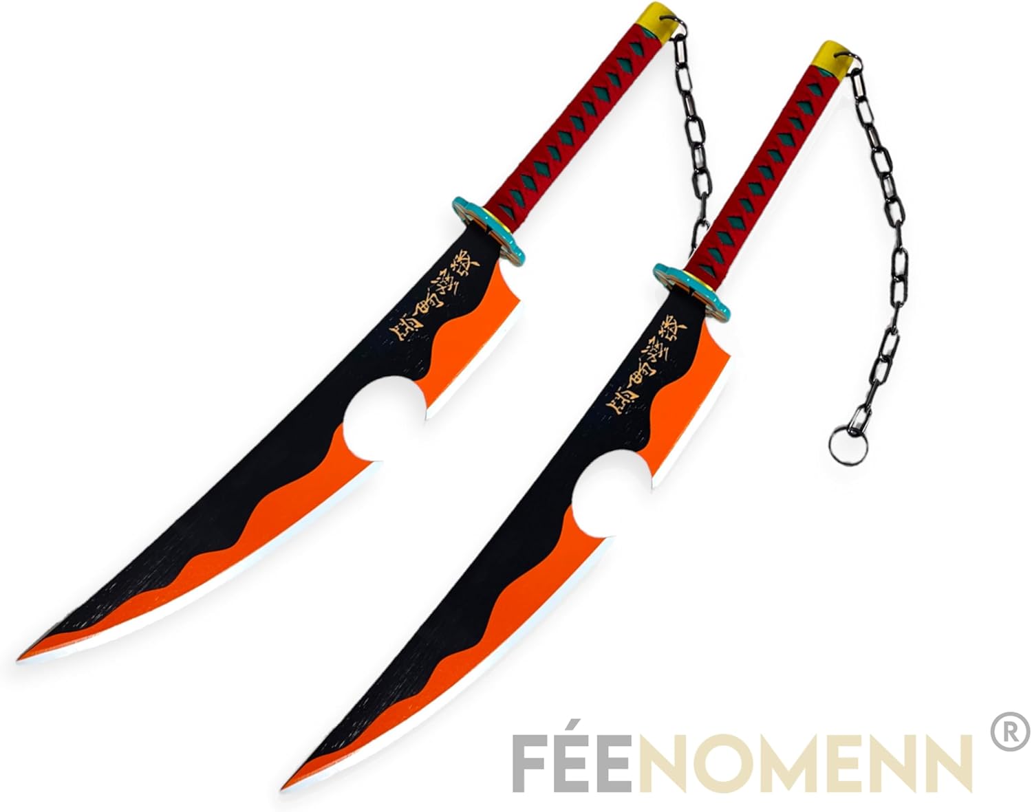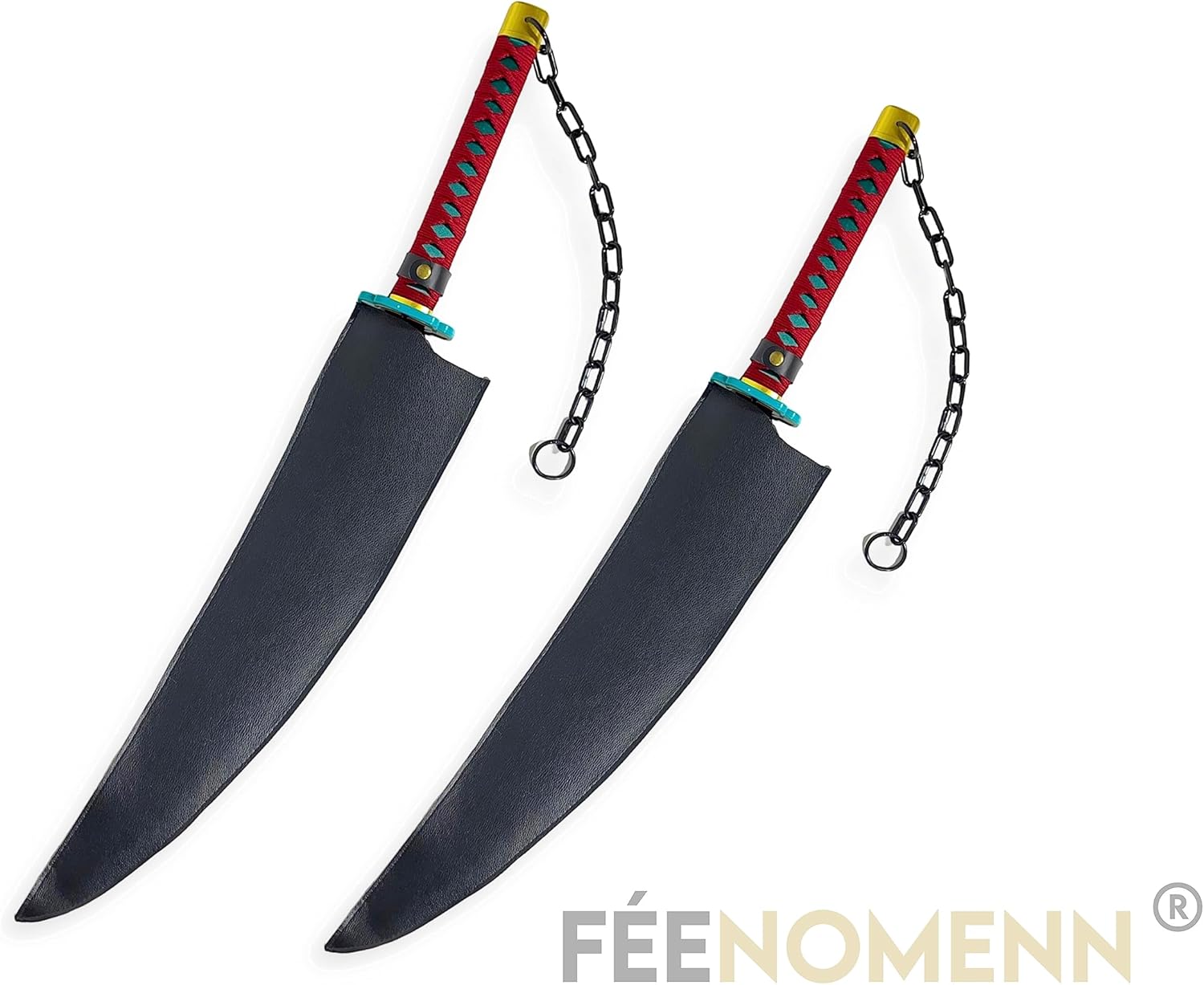 Venditore francese. Arti decorative giapponesi: accessori decorativi e cosplay. Pacchetto da collezione composto da 2 spade di TENGEN UZUI Le lame sono in legno (bambù). Le protezioni e le maniglie sono realizzate in ABS (plastica) duro e ad alta densità. Le trecce attorno alle maniche sono in COTONE. Le custodie sono realizzate in ecopelle nera (adatte a qualsiasi tipo di pubblico). Accessori inclusi: Le custodie con cinghie per il trasporto sulla schiena. Dimensioni di ogni katana: lunghezza 90 cm x larghezza 11 cm (lama solo 58 cm). Peso: 750 g
