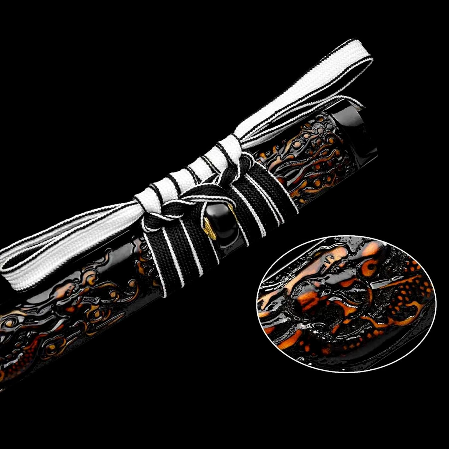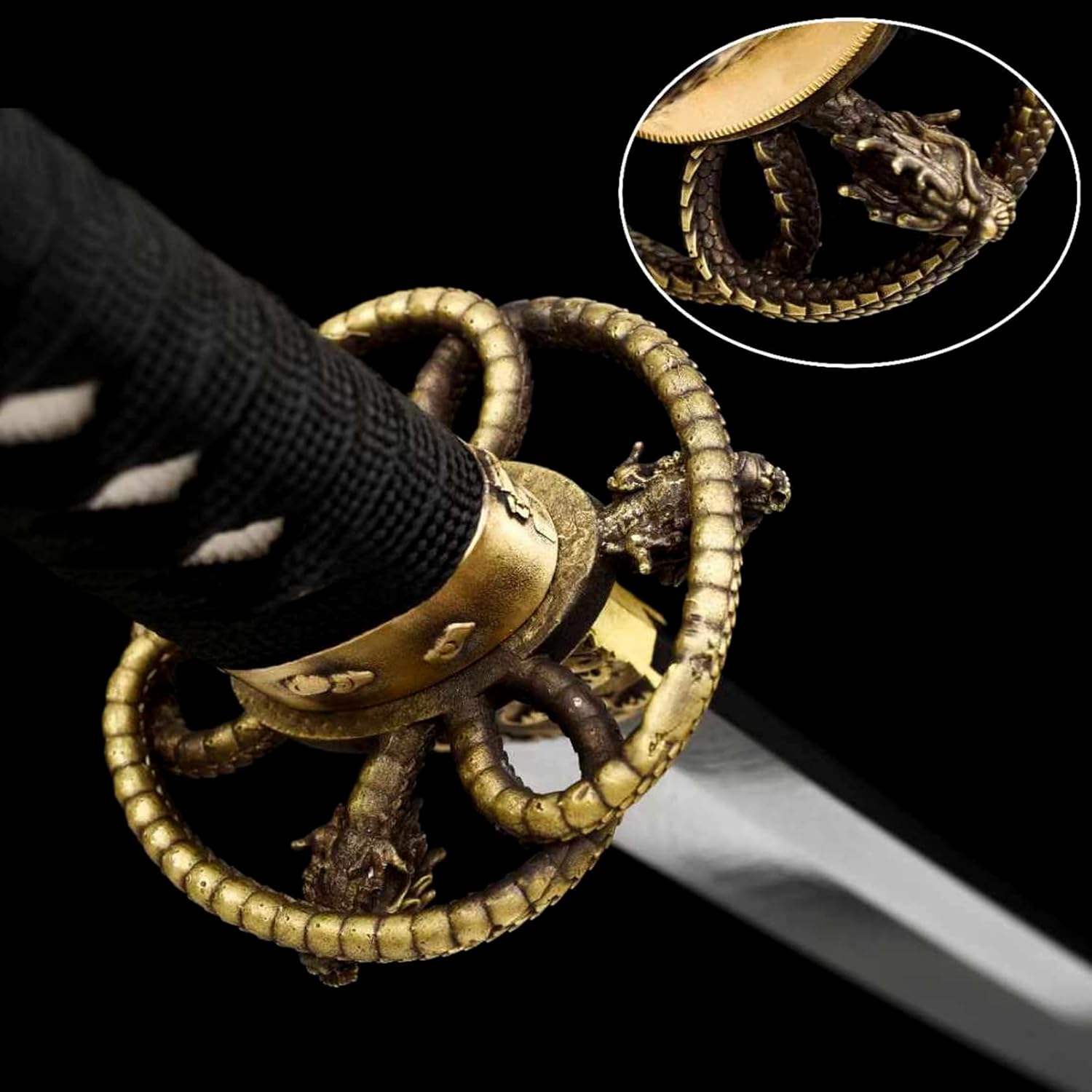 ※ 【Miglior materiale】: la lama della katana è piegata e forgiata in acciaio di alta qualità, mostrando un motivo di piume unico. Il paramano è realizzato in rame puro con intagli squisiti e lavorazione squisita. Il fodero è realizzato in legno di alta qualità, intagliato e dipinto all'esterno con motivi tridimensionali. ※ 【Dimensioni perfette】: la lunghezza totale della katana è di 104 cm, la lunghezza del manico è di 27,5 cm, la lunghezza della lama è di 71 cm, la larghezza della lama è di 3,2 cm, lo spessore della lama è di 0,75 cm e il peso è di circa 1,4 kg. Perfetto per regali, cosplay, kendo, allenamento Iai, collezione, decorazioni per la casa ed esposizione. ※ 【Artigianato squisito】: le spade dei samurai utilizzano antiche tecniche di fabbro e sono realizzate a mano da abili artigiani. Viene piegato, forgiato, ritorto e allungato più volte e lucidato a mano in 18 passaggi. Ha una buona tenacità e può essere piegato di 90 gradi senza deformazioni. La durezza può raggiungere i 60 HRC. ※ 【Sensazione confortevole】: la maniglia è realizzata in corda nera avvolta a mano, che è antiscivolo, assorbe il sudore e comoda da tenere. Il corpo della spada è modellato in un unico pezzo, con proporzioni coordinate e una leggera curva. Come se fossi nel periodo degli Stati Combattenti del Giappone, puoi giocare come preferisci. ※【Spirito del samurai】: questa spada da samurai non è solo un coltello da allenamento, ma anche un'opera d'arte piena di fascino storico e culturale. È un ponte per comprendere la cultura giapponese e sperimentare profondamente il fascino unico dello spirito samurai. Tienilo e senti il fascino unico!