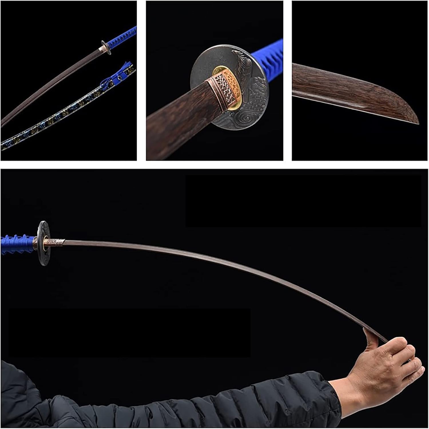 Materiali di alta qualità: la lama è realizzata in palissandro di alta qualità, che non è facile da spezzare e deformare, con linee chiare e fragranza naturale. Tecnologia di produzione di prima classe: sviluppata da professionisti con decenni di esperienza, le competenze tradizionali creano prodotti perfetti. Proporzioni e strutture perfette: il corpo della spada è modellato integralmente, con curvatura e proporzione perfette, che lo rendono facile da impugnare e maneggiare. La struttura fine è stabile e durevole. Dimensioni ottimali: lunghezza totale 103 cm, lunghezza lama 68 cm e larghezza 3,2 cm. La dimensione più adatta rende la spada del samurai così armoniosa e bella. Ampia gamma di applicazioni: molto adatto per cosplay, collezioni, mostre domestiche, pratiche di kendo, feste a tema e altro ancora.