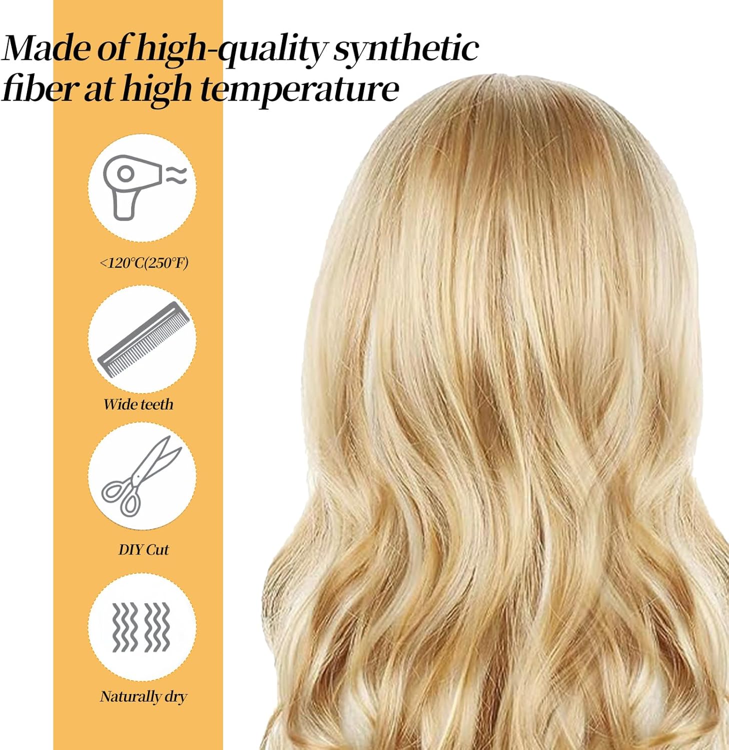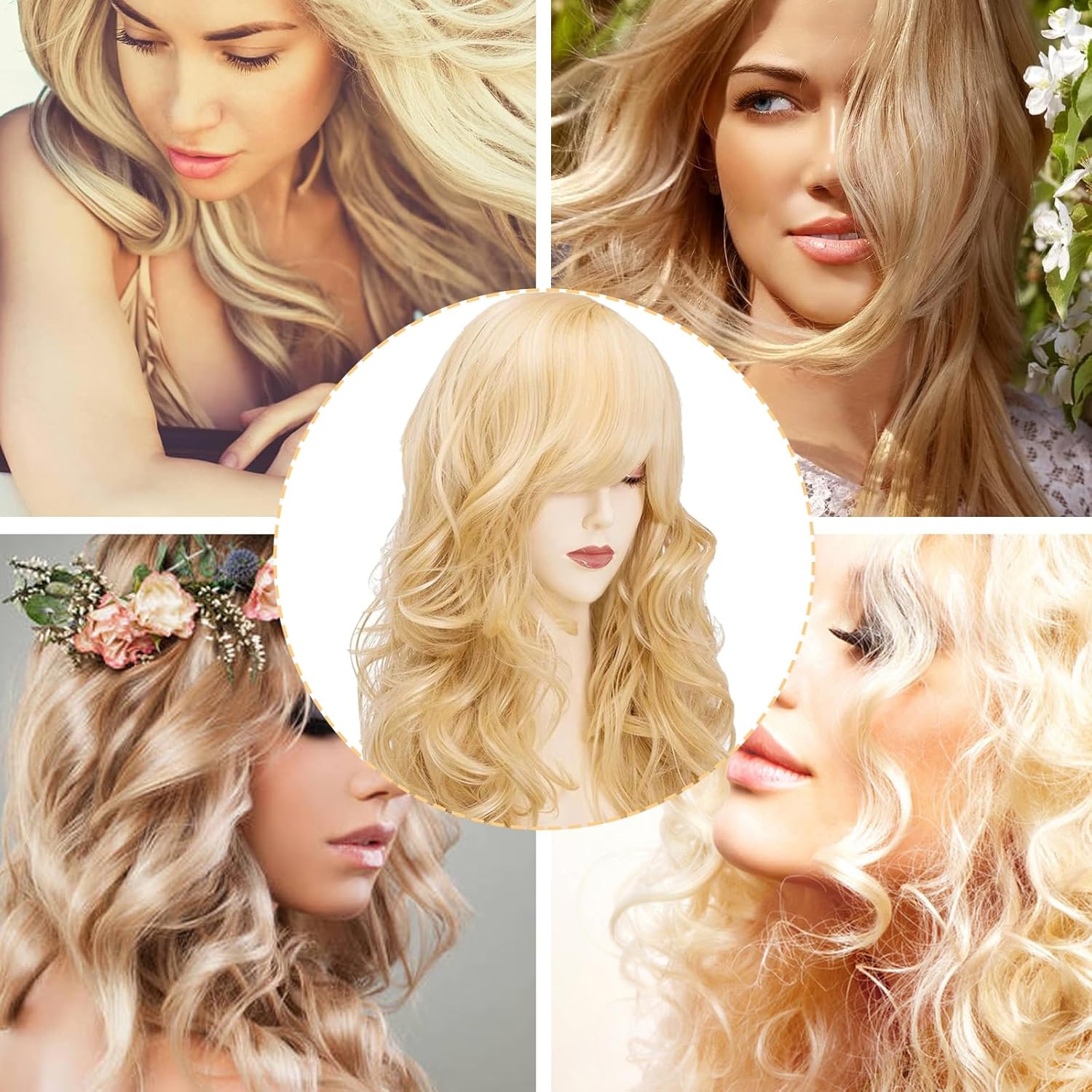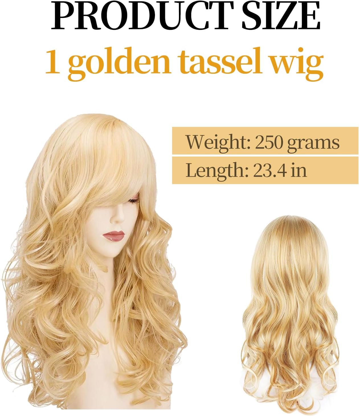 💇 Pacchetto incluso: riceverete 1 pezzo di parrucca lunga da 60cm con frangia bionda, del peso di 250g, questa parrucca è traspirante e non pesante, liscia e naturale, potete stare tranquille di poterla usare! 💇 QUALITÀ E DURATA: La parrucca bionda con frangia lunga è realizzata in fibra chimica di alta qualità in seta sintetica ad alta temperatura, l'effetto indossato è realistico e naturale, come se appartenesse ai tuoi capelli originali, e può essere tagliata, arricciata, lavata, permanentata, ecc. come preferisci, è morbida e liscia al tatto e non è facile cadere dai capelli. 💇 FACILE CURA: la parrucca bionda con frangia lunga può essere lavata dopo averla indossata, lavarla con una leggera pressione della mano, evitare la luce del sole, posizionarla verticalmente, evitare la luce diretta del sole e asciugarla naturalmente in un luogo ventilato. La parrucca può avere un po 'di capelli galleggianti, ma non influisce sull'uso, utilizzare un pettine per pettinare delicatamente liscia può essere 💇Design squisito: parrucca lunga bionda dalla forma originale e unica, frangia bionda obliqua sfumata, texture morbida, il colore dei capelli modifica perfettamente la forma del viso, rendendoti più bella e accattivante, questa parrucca bionda può permetterti di avere una testa di capelli affascinante e bella rapidamente! 💇 Ampiamente applicabile: lunga parrucca bionda frangia cosplay è perfetto per il make-up senza rimpianti, addio al nubilato, cosplay o mascherata quotidiana, Halloween, mascherata, matrimoni, incontri, feste di moda, eventi a tema, ecc, questa parrucca bionda può farti avere un affascinante e bella capelli ricci facilmente e rapidamente, ogni ragazza ha bisogno di uno di questi.