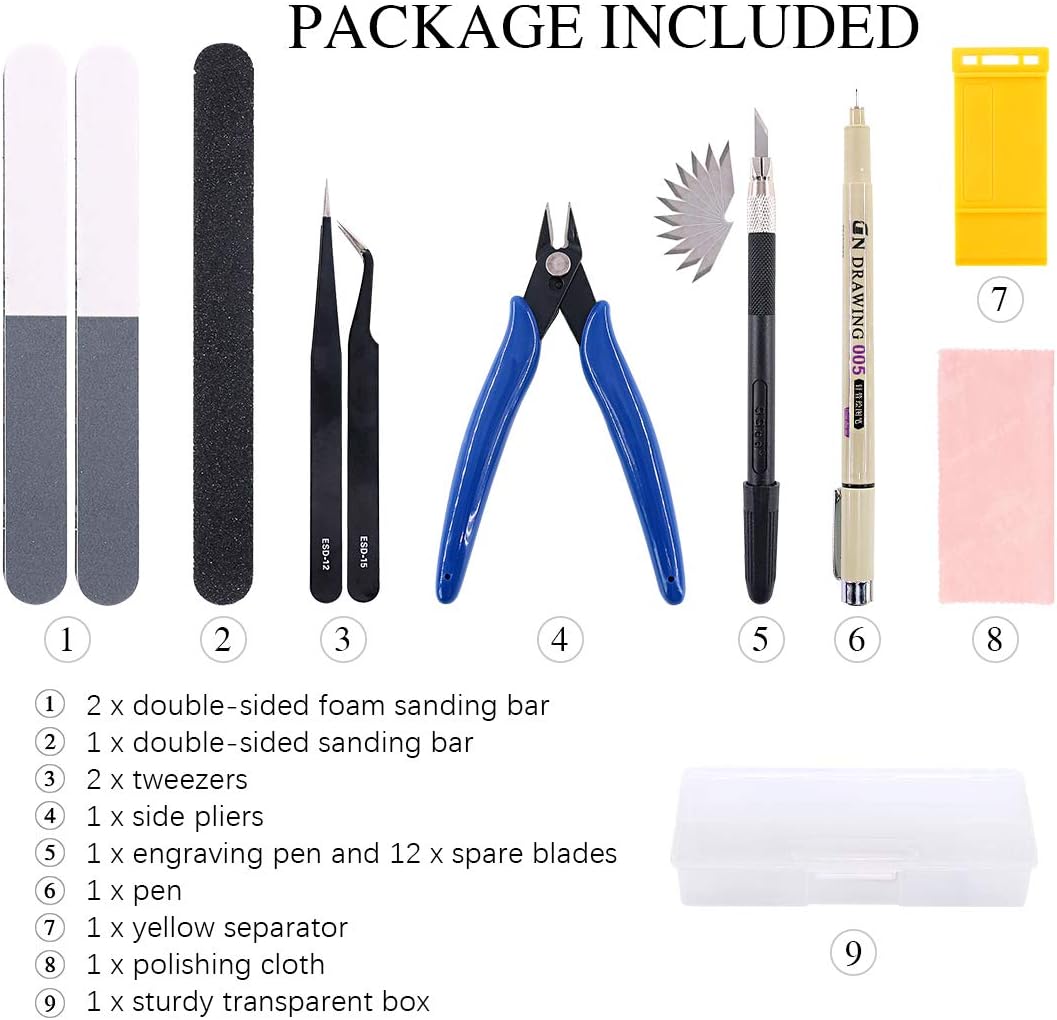 - Multifunzionale: questo kit di attrezzi Gundam non è adatto solo per principianti e amanti del modellismo, ma è anche un'ottima scelta per i modellisti e i produttori di modelli. È una fantastica idea da utilizzare per costruire vari modelli di plastica di base come aereo, cartoni animati, mini case delle bambole, camion, robot, treno, navi Mayflower ecc. - Ottimo kit di strumenti per principianti: 1 pinza laterale, 1 penna per incisione e 12 lame di ricambio, 1 separatore giallo, 2 pinzette, 2 barrette abrasive a doppia faccia, 1 penna e 1 panno per la lucidatura. Viene fornito con una robusta custodia in plastica, che è estremamente comoda da usare e riporre. - Ben fatto ma davvero conveniente: tutti questi strumenti sono ben fatti e molto precisi, che funzionano magnificamente nei vostri progetti di modellismo. Le pinzette sono realizzate in acciaio inox, che viene fornito con un tappo in plastica per evitare che le punte vengano urtate. Il tagliaunghie ha un taglio pulito e liscio, inoltre, le sue impugnature sono rivestite con una comoda gomma. Otterrete buoni usi. 4. Facile da trasportare e riporre. Questo set di strumenti è dotato di una robusta scatola trasparente, leggera e portatile. Potete continuare i vostri progetti di modellismo in qualsiasi momento e in qualsiasi momento. - Splendido regalo per gli amici. Sei ancora confuso con quale tipo di regali potresti regalare ai tuoi amici alla sua festa di compleanno? Forse questo set di strumenti di modello sarebbe molto utile. Potete inviarlo direttamente ai vostri amici come regalo. In secondo luogo, sarà fantastico utilizzare questo kit per costruire un aereo per i vostri amici. Una volta ricevuto il regalo, devono essere sorpresi da lacrime ben saldate negli occhi. Il tuo regalo unico significa il tuo amore unico.