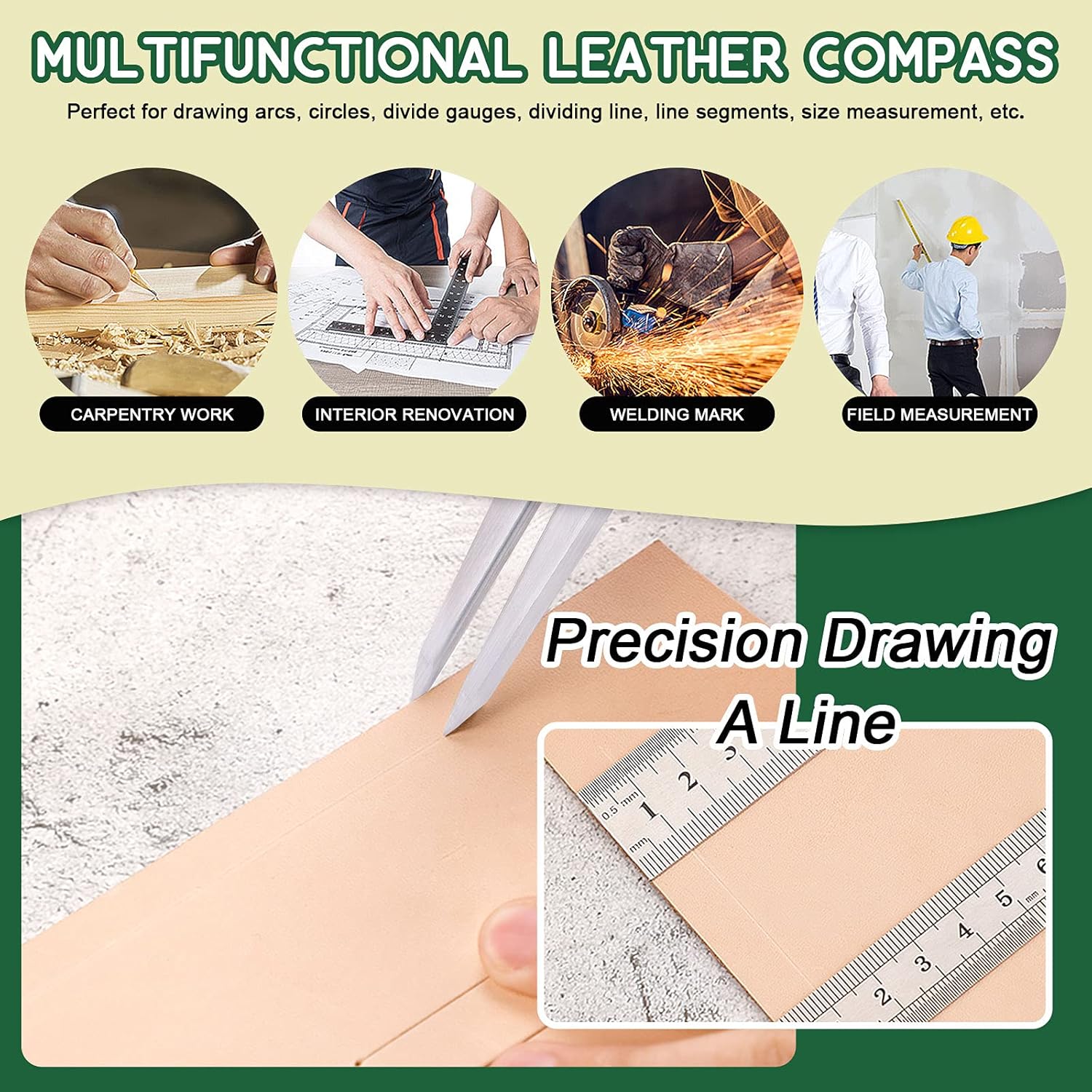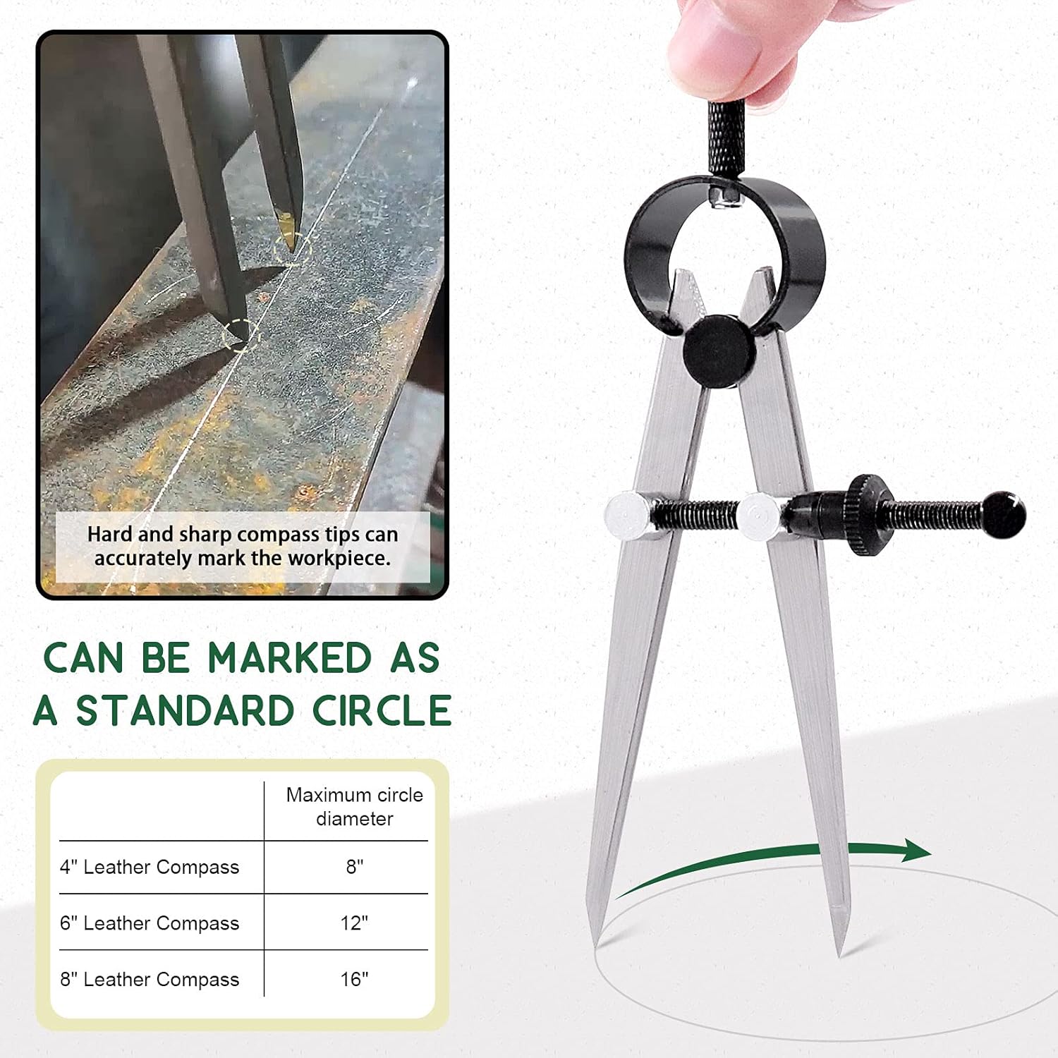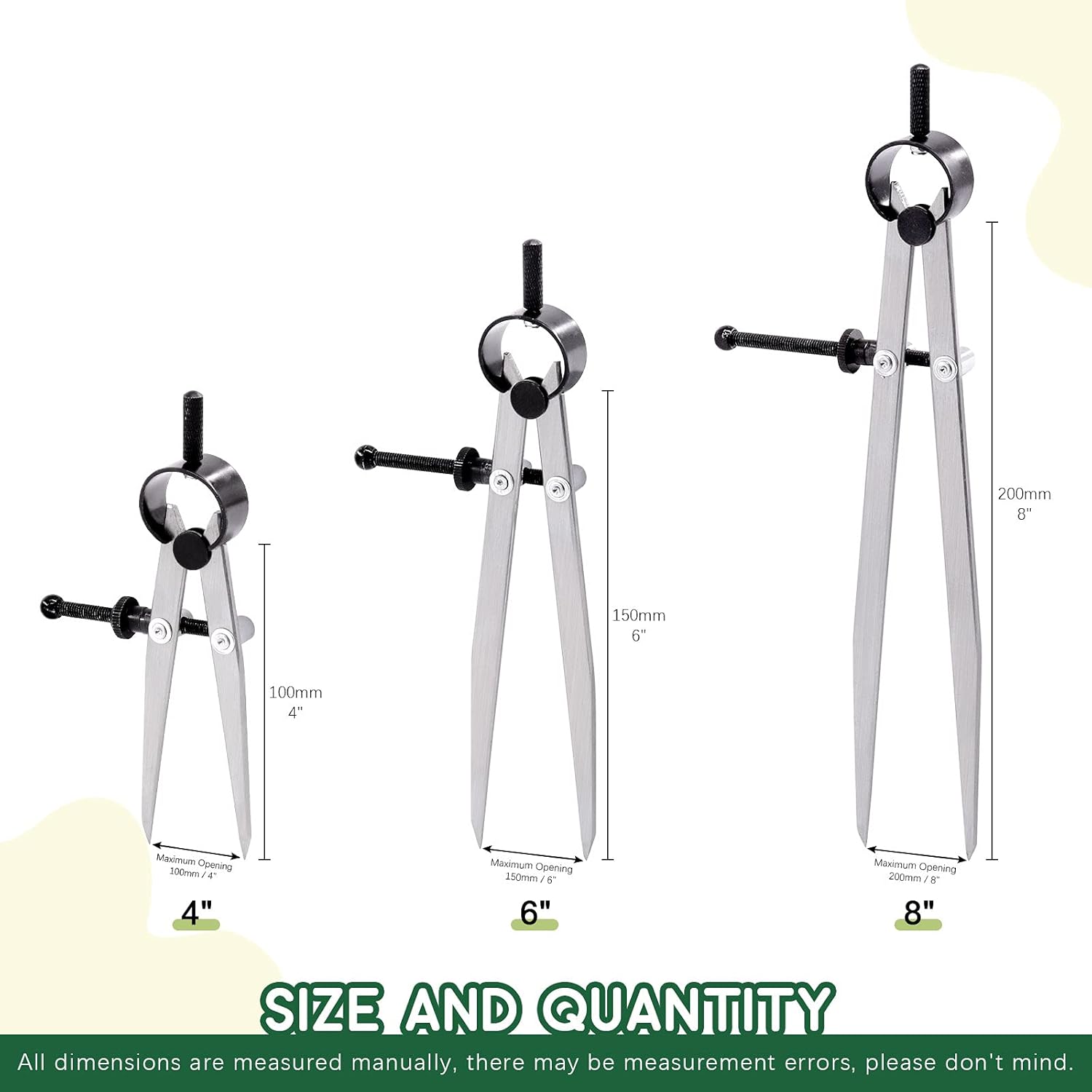 Confezione: 3 diverse dimensioni di compasso divisore: 4"/6"/8". Il divisore in metallo da 4 pollici può disegnare cerchi fino a 8 pollici; lo strumento di separazione da 6 pollici può disegnare cerchi fino a 12 pollici; il compasso da 8 pollici può disegnare cerchi fino a 16 pollici. Tre dimensioni per set soddisfano le diverse esigenze. Strumento di disegno di alta qualità: realizzato in acciaio ad alto tenore di carbonio con finitura antiruggine e anticorrosione, aspetto liscio, buona tenacità, elevata durezza, robusto e durevole, resistente all'usura. Filettatura fine per una regolazione rapida; Design a rivetto per una maggiore stabilità. Punta dura per un disegno preciso. Lucidatura fine, sensazione di mano confortevole, misurazione accurata. Facile da usare: la punta dura e affilata del compasso può essere fissata saldamente sulla superficie orizzontale della pelle e del legno per un disegno preciso. La tensione della molla e il dado scorrevole di bloccaggio consentono di misurare rapidamente, copiare la misurazione, trasferire le misurazioni e disegnare cerchi ripetuti. È possibile regolare la larghezza tra le due gambe per soddisfare le diverse esigenze. Regolazione semplicissima della bussola di separazione: ① Regola secondo necessità ruotando verso la vite. ② Regola lo spazio tra due piedi. Ampia applicazione: perfetta per disegnare archi, cerchi, divisori, linee di divisione, creare contorni, segmenti di linea, misurare dimensioni, segni di bordi, ecc. Ampiamente usato nella lavorazione del legno, carpenteria, lavorazione dei metalli, lavorazione della pelle, matematica.