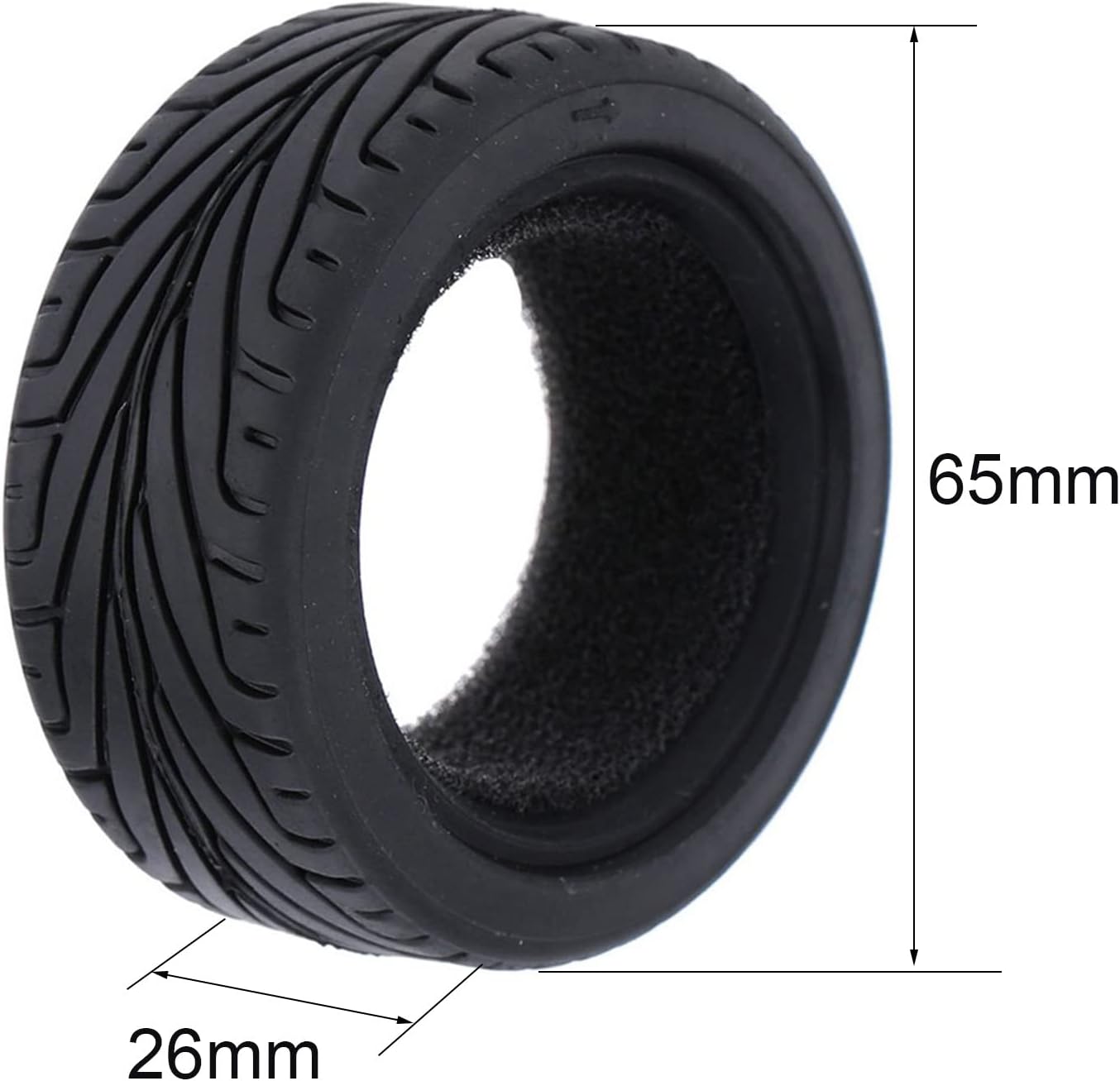 Pezzo di ricambio per auto 1/10 RC 1:10 On-Road, auto da corsa, Touring Car Diametro pneumatico: 65 mm, larghezza: 26 mm, diametro ruota: 52 mm, esagonale: 12 mm Facile da installare e durevole nell'uso Pneumatici in gomma, ruote in plastica Il pacchetto include: 4 pezzi RC su strada auto pneumatici e cerchi set