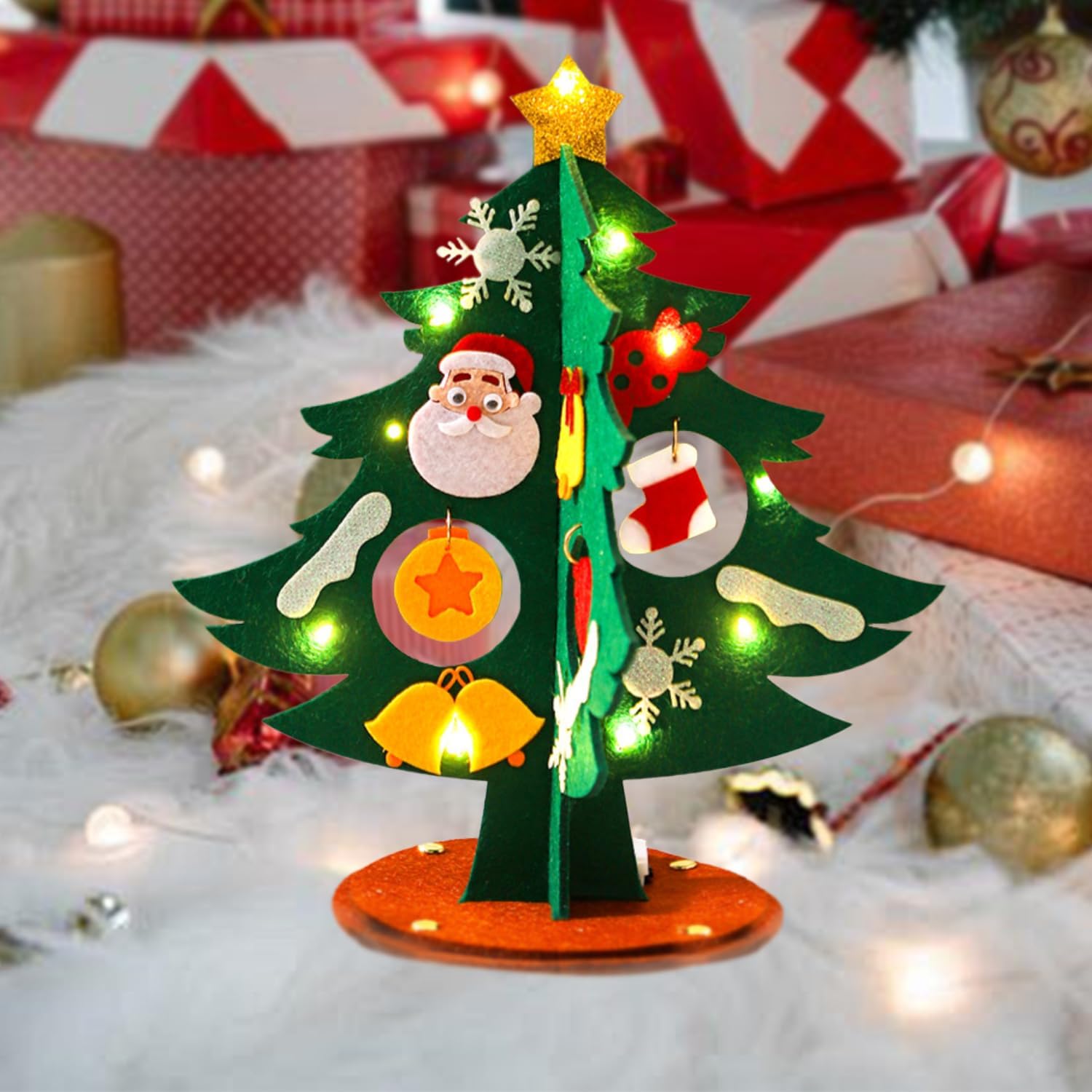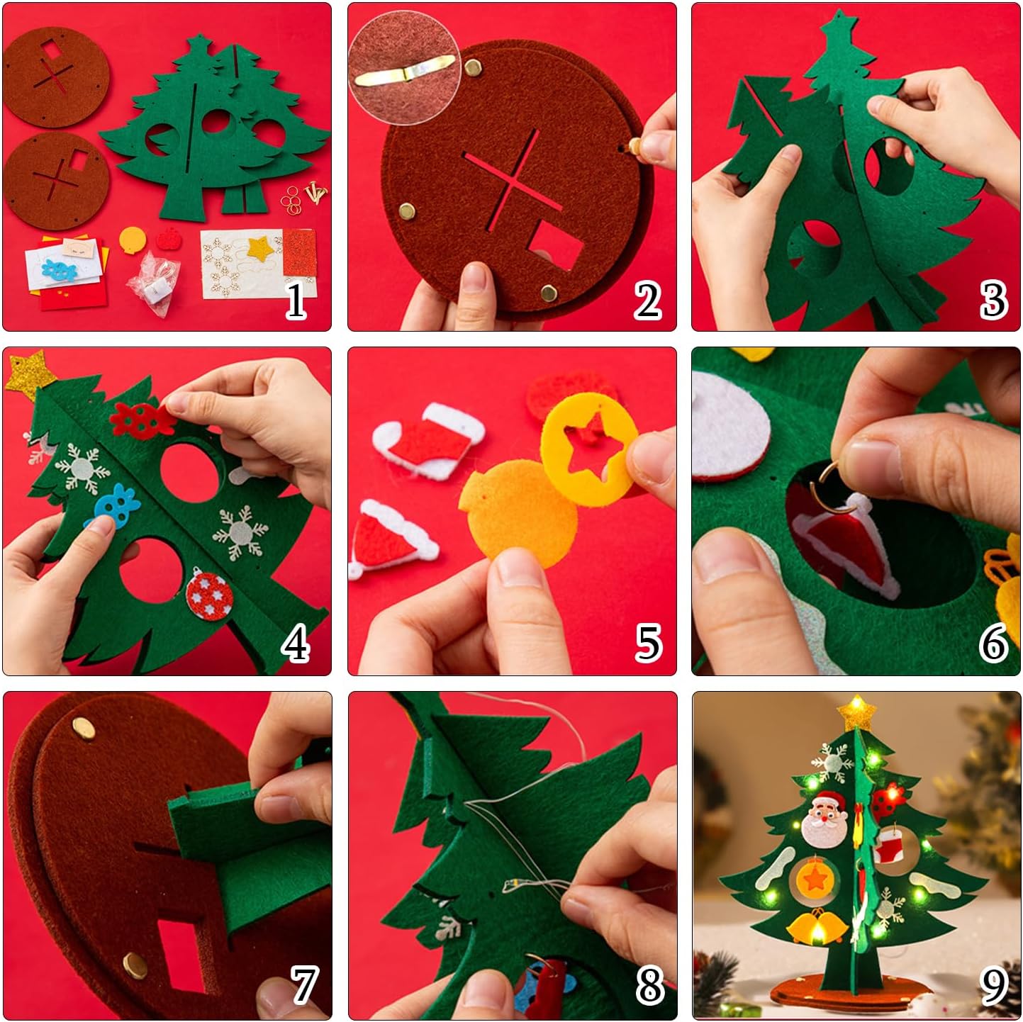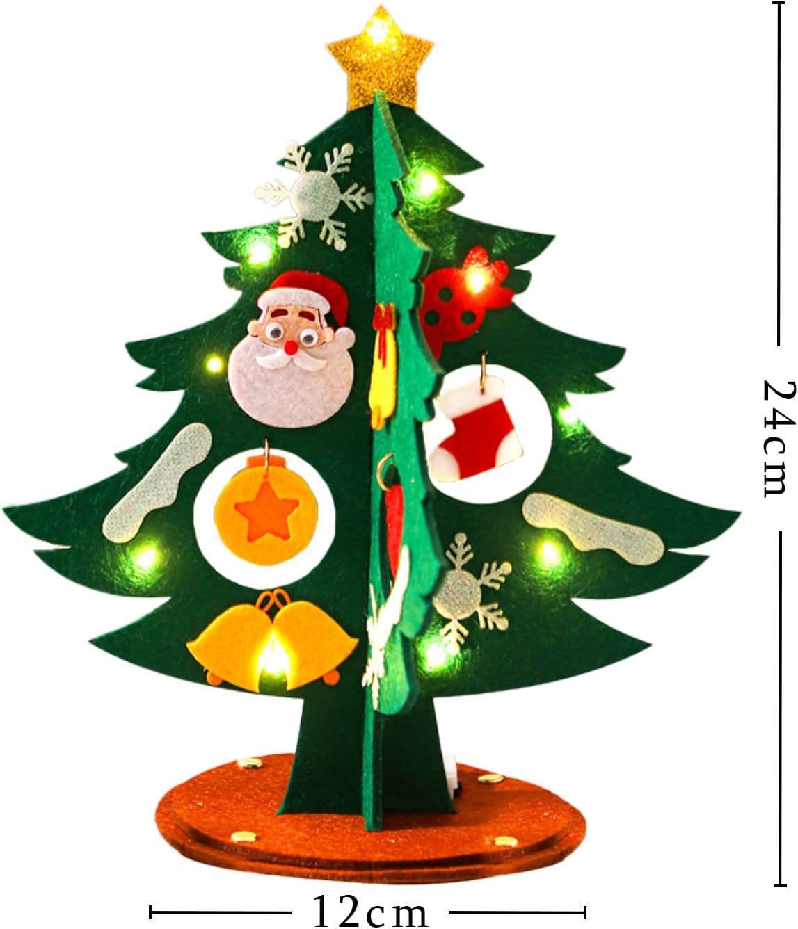 Set fai da te natalizio: riceverete un set fai da te per l'albero di Natale completo di una catena luminosa a LED. // Materiale: feltro // Dimensioni finali: 24 x 12 cm (altezza x diametro) Facile da montare – Ogni decorazione natalizia fatta a mano è dotata di adesivi autoadesivi facili da applicare. È anche possibile rimuoverli facilmente per modificare il vostro disegno (istruzioni dettagliate incluse). Set fai da te per albero di Natale illuminato - il nostro set fai da te natalizio include una speciale catena luminosa a LED lunga 1 metro (alimentata da 3 batterie a bottone LR44) che ti consentirà di decorare il tuo albero di Natale in feltro e creare un'atmosfera ancora più festosa. Un regalo di Natale per i bambini – I più piccoli adoreranno questa attività fai da te affascinante e coinvolgente, che li aiuterà anche a sviluppare le loro capacità motorie fini e la concentrazione mentre giocano. Il kit fai da te per l'albero di Natale è un piccolo regalo perfetto per il calendario dell'Avvento o per la calza di Babbo Natale. Mettete la vostra decorazione natalizia in feltro sulla mensola del camino, sul tavolo da pranzo o sul davanzale della finestra per creare un'atmosfera calda e festosa!
