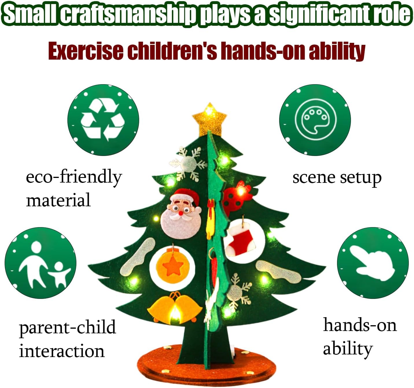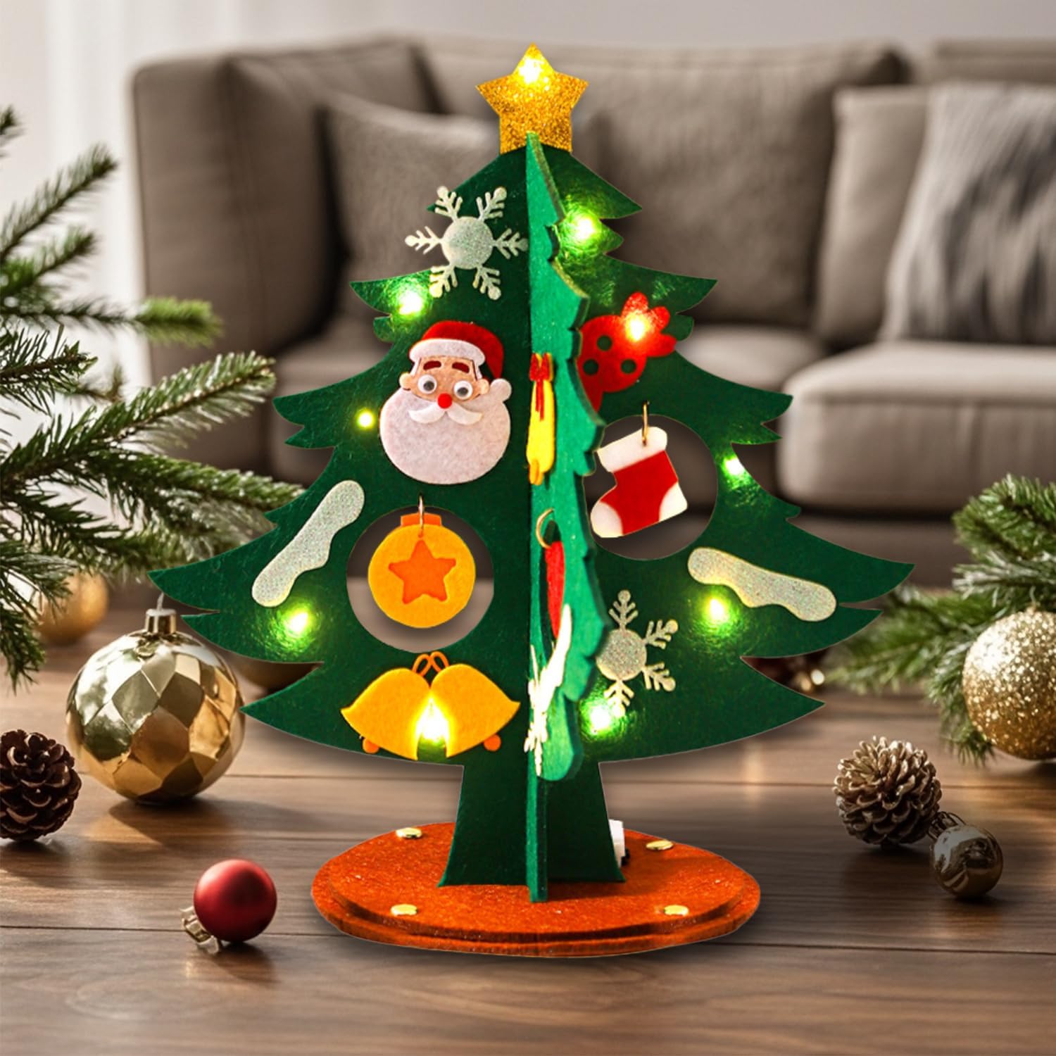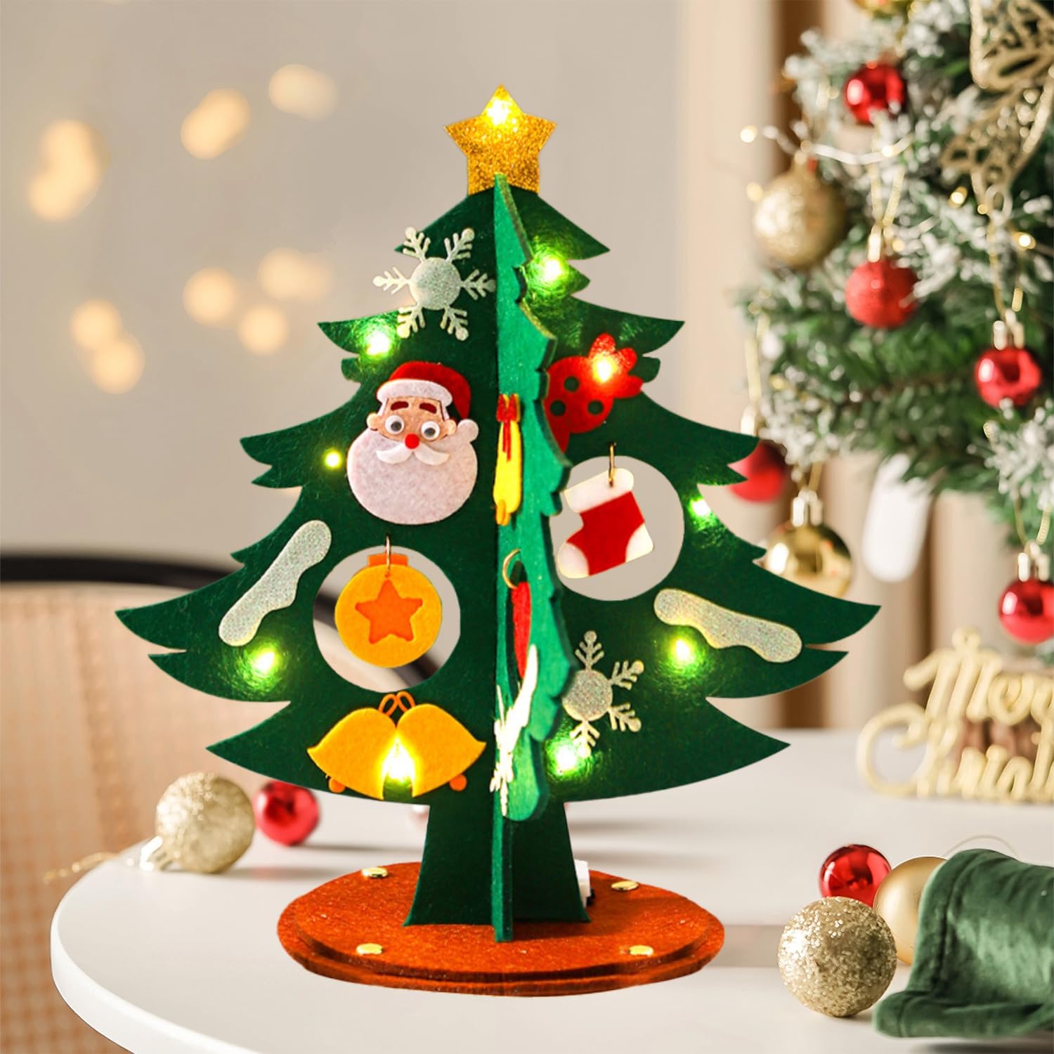 Set fai da te natalizio: riceverete un set fai da te per l'albero di Natale completo di una catena luminosa a LED. // Materiale: feltro // Dimensioni finali: 24 x 12 cm (altezza x diametro) Facile da montare – Ogni decorazione natalizia fatta a mano è dotata di adesivi autoadesivi facili da applicare. È anche possibile rimuoverli facilmente per modificare il vostro disegno (istruzioni dettagliate incluse). Set fai da te per albero di Natale illuminato - il nostro set fai da te natalizio include una speciale catena luminosa a LED lunga 1 metro (alimentata da 3 batterie a bottone LR44) che ti consentirà di decorare il tuo albero di Natale in feltro e creare un'atmosfera ancora più festosa. Un regalo di Natale per i bambini – I più piccoli adoreranno questa attività fai da te affascinante e coinvolgente, che li aiuterà anche a sviluppare le loro capacità motorie fini e la concentrazione mentre giocano. Il kit fai da te per l'albero di Natale è un piccolo regalo perfetto per il calendario dell'Avvento o per la calza di Babbo Natale. Mettete la vostra decorazione natalizia in feltro sulla mensola del camino, sul tavolo da pranzo o sul davanzale della finestra per creare un'atmosfera calda e festosa!