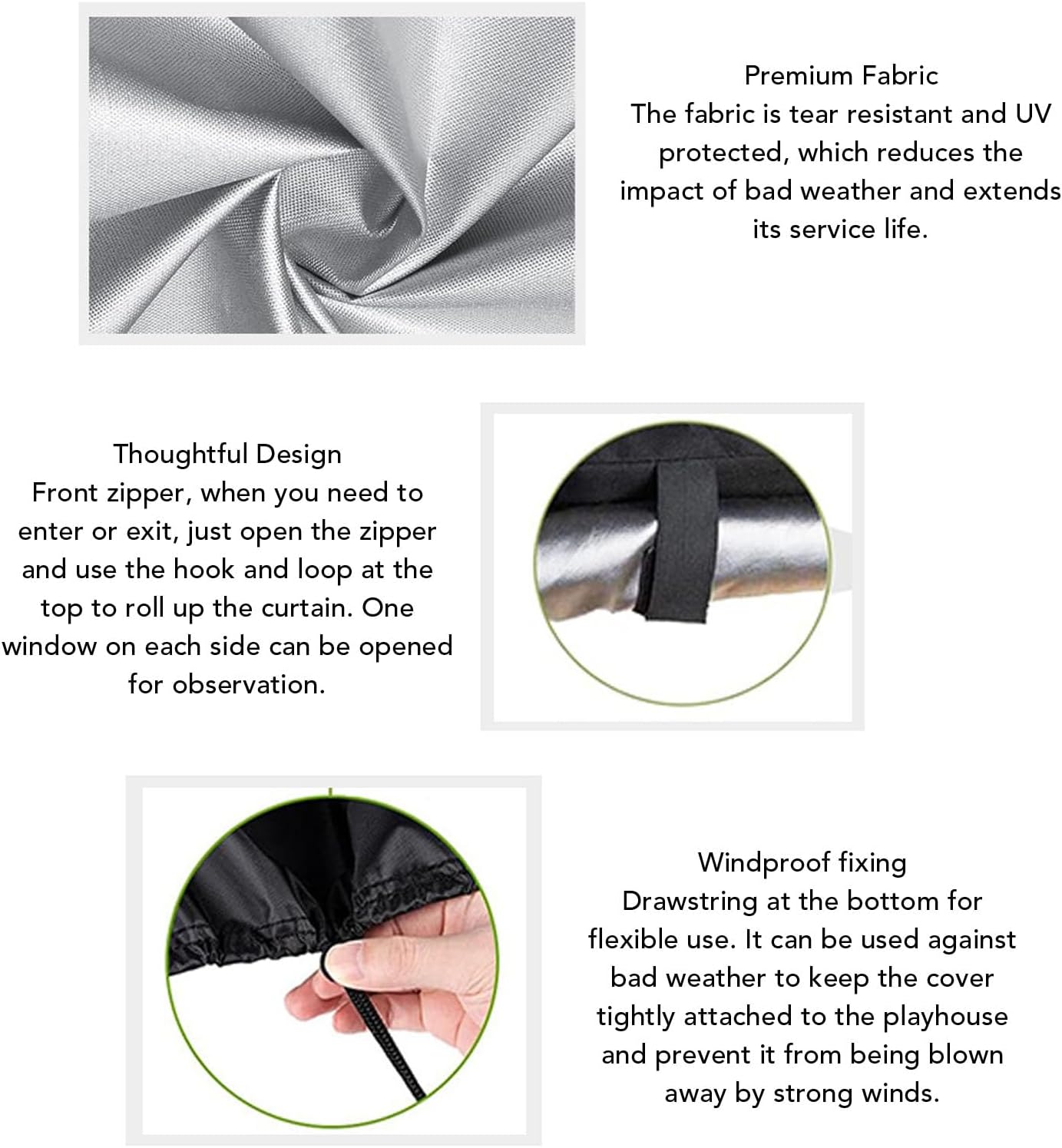 [Protezione per tutte le stagioni] Questa protezione da playhouse realizzata in tessuto Oxford rivestito con argento è progettato in modo tale da resistere alla pioggia, ai raggi, alla polvere e altro, al tuo teatro tutto l'anno. [Pass duro] Draw -Knurder Floor garantisce una vestibilità stretta e , che impedisce al coperchio di scivolare in condizioni ventose o di soffiare, che offre una protezione continua per il tuo teatro. [Design sostenibile] Con punto doppio e incrociato, questo coperchio è resistente alle lacrime e robusto e offre una protezione affidabile contro tutte le stagioni e le condizioni meteorologiche. [Facile accesso] Con 2 sul fronte e sul retro, questo coperchio consente semplicemente l'input e l'uscita, mentre le finestre offrono ventilazione su ciascun lato se necessario. [Memoria semplice] Piegare il coperchio se non si è utilizzati e salvalo nell'archiviazione fornita, salva spazio e mantienilo organizzato per un comodo spazio di archiviazione e utilizzo.