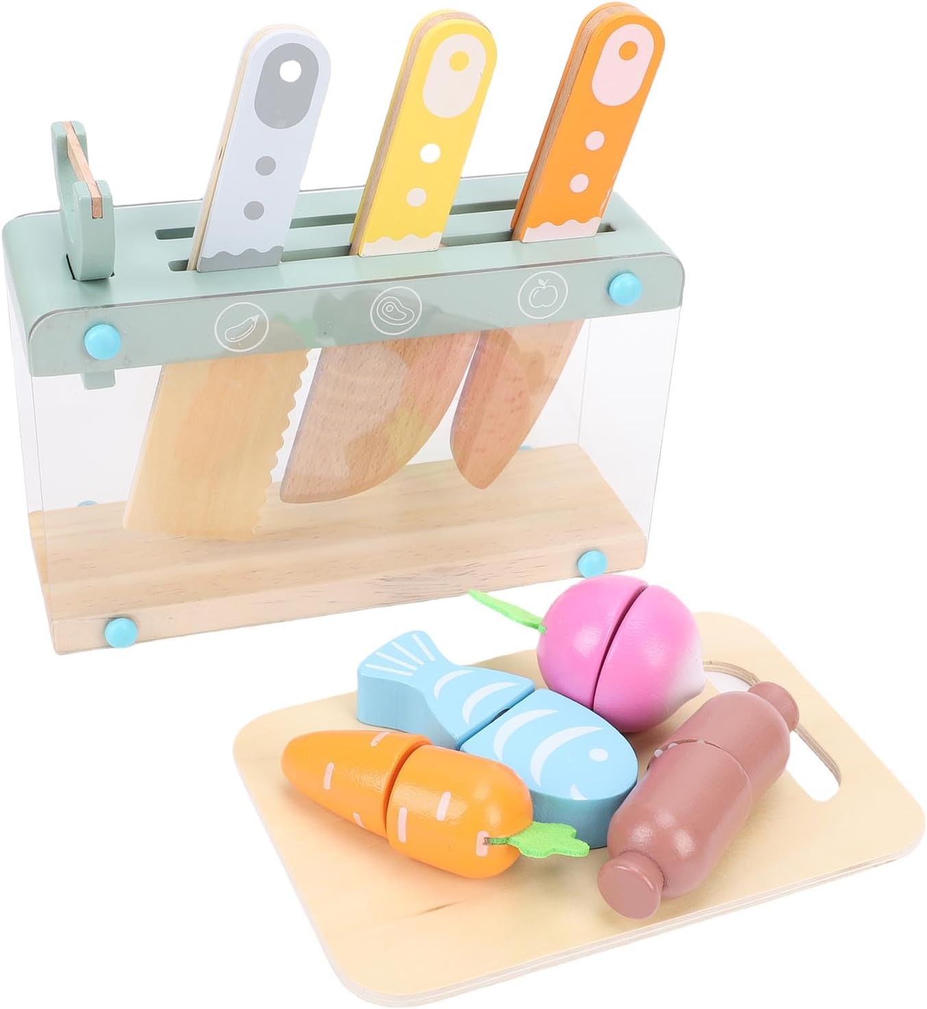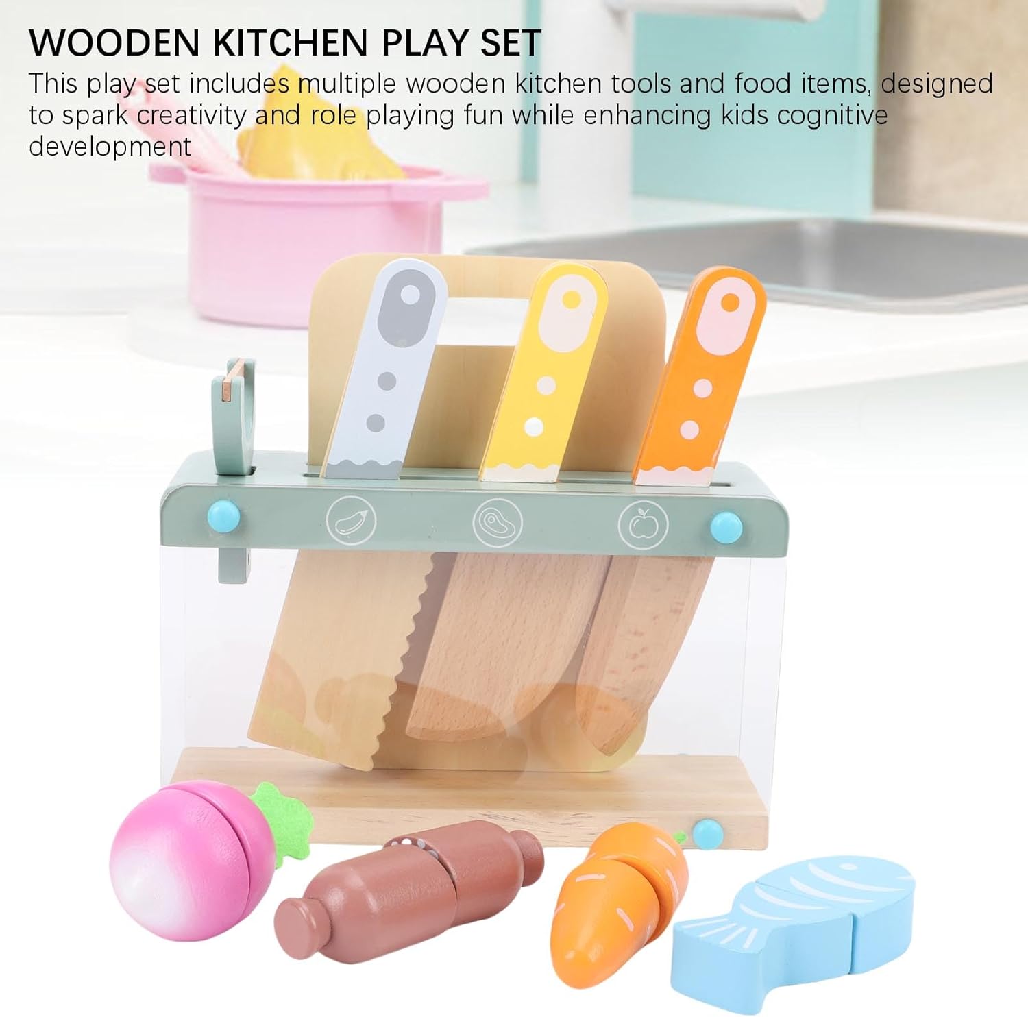 [Gioco sicuro e divertente] Realizzato in legno di faggio, questo set di coltelli da cucina offre un'esperienza culinaria e divertente per i bambini dai 2 ai 10 anni. [Sviluppo educativo] Incoraggia le capacità motorie e la coordinazione occhio-mano con coinvolgenti giocattoli da taglio promuovendo al contempo il gioco di ruolo. [Tempo interattivo per la famiglia] I bambini possono imitare la cucina con i genitori, migliorando le capacità di comunicazione e il gioco cooperativo in un ambiente familiare. [Apprendimento colorato] Pezzi di cibo dai colori vivaci aiutano a insegnare forme, colori e nomi di cibo, favorendo lo sviluppo precoce del linguaggio. [Set completo] Questo set da 12 pezzi include diversi utensili da cucina, taglierini e taglieri per ispirare creatività e divertimento.