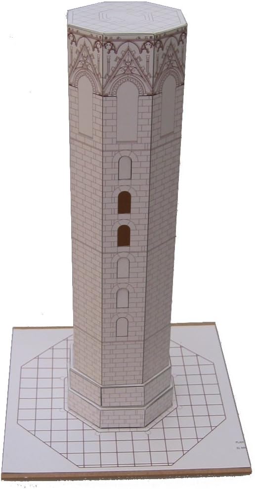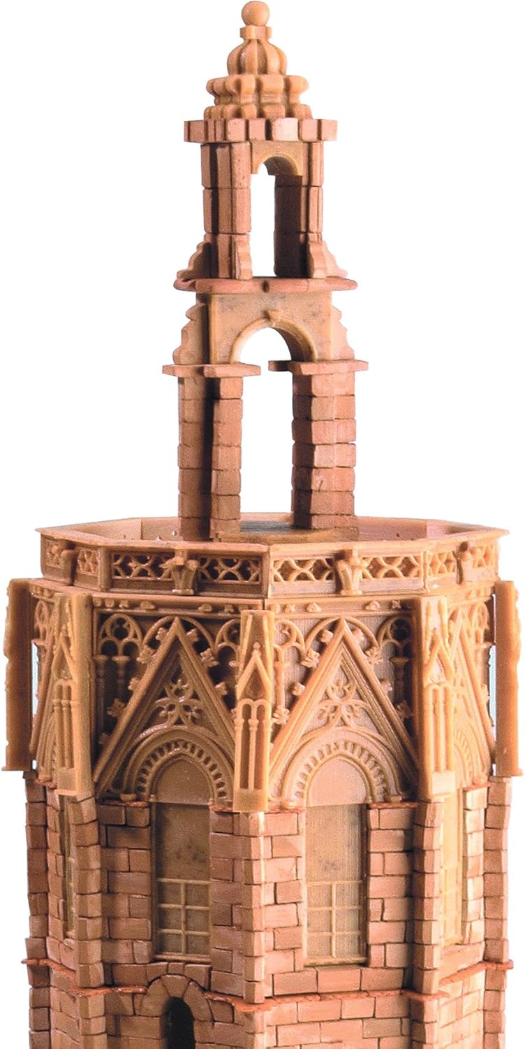 Realizzato con parti in ceramica e pezzi speciali di vari materiali Consigliato per bambini dai 14 anni in su modello torre campana contiene istruzioni di montaggio, supporto in legno, modelli di carta e cartone, coda, supporti ausiliari (legno, sughero) e materiali decorativi Dimensioni: 19,5 cm di lunghezza, 19,5 cm di larghezza e 47 cm di altezza Scala 1/150