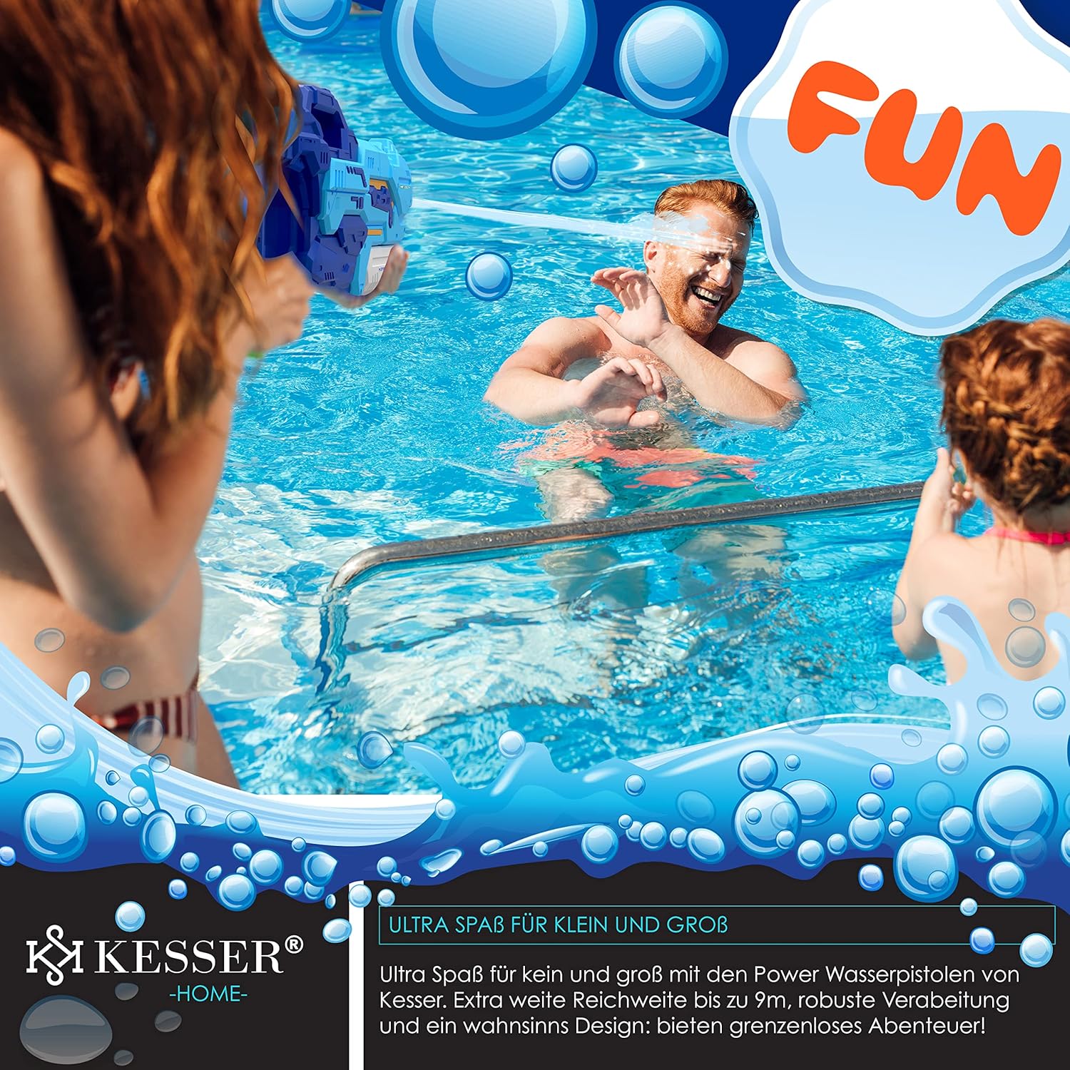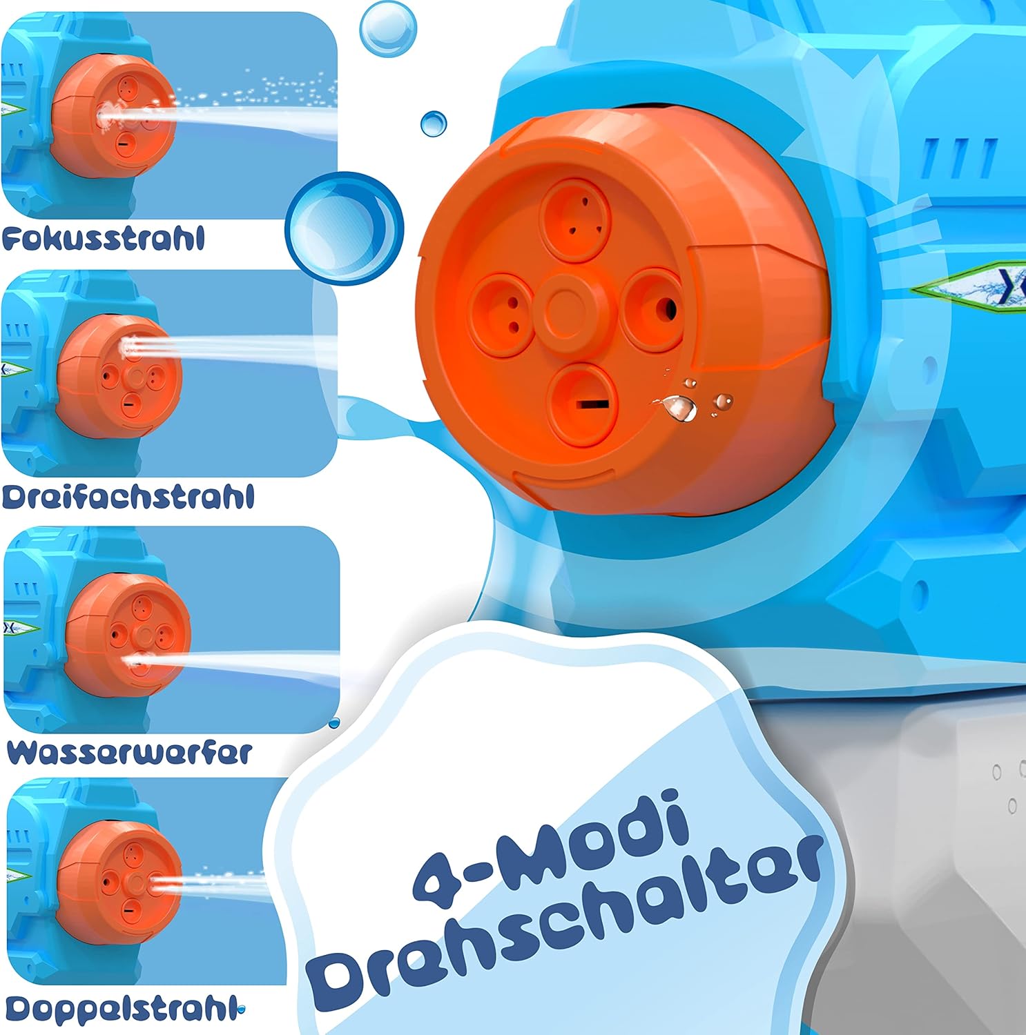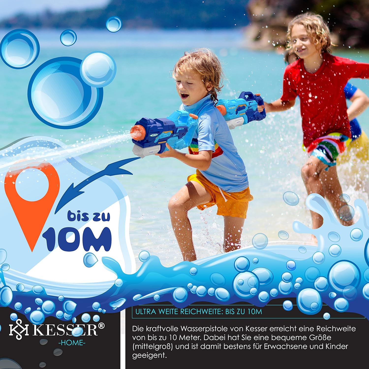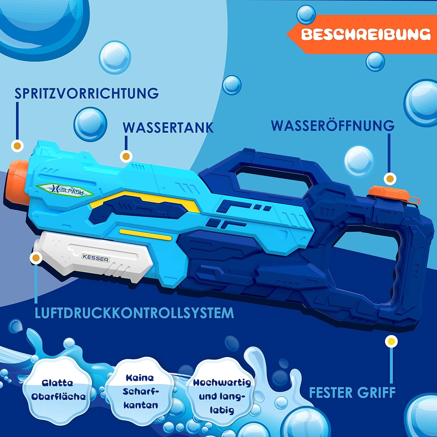 𝐒𝐄 𝐑𝐀𝐅𝐑𝐀Î𝐂𝐇𝐈𝐑: È soprattutto in estate, quando le temperature aumentano, che viene voglia di rinfrescarsi nel proprio giardino o nel parco. Per noi l'estate è sinonimo di azione, divertimento e soprattutto ristoro. L’attività migliore per combinare tutti questi elementi è un divertente combattimento in acqua, la scelta ideale. Oltre alle famose bombe ad acqua, non possono mancare le pistole ad acqua! 𝐋𝐎𝐍𝐆𝐔𝐄 𝐏𝐎𝐑𝐓É𝐄: A differenza dei tradizionali blaster, la nostra pistola ad acqua della ditta KESSER ha una lunga gittata, fino a 10 metri. Grazie alle sue dimensioni pratiche, la pistola per l'irrigazione è quindi facile da trasportare per una battaglia con l'acqua calda. Quindi la pistola ad acqua è molto adatta a bambini e adulti. 𝐁𝐎𝐔𝐓𝐎𝐍 𝐑𝐎𝐓𝐀𝐓𝐈𝐅 𝟒 𝐌𝐎𝐃𝐄𝐒: divertimento sensazionale per grandi e piccini con le nostre pistole ad acqua aPower. Grazie al pulsante rotante per 4 diverse modalità, non mancherai un bersaglio e non lascerai a bocca asciutta nessun avversario. Il raggio di messa a fuoco ti consente di mirare perfettamente al tuo bersaglio. Prendi di mira più giocatori contemporaneamente! Con il doppio e il triplo raggio, la tua percentuale di successo aumenterà in modo significativo. Durevole: la finitura di alta qualità rende i nostri giochi acquatici un prodotto di punta. Gli elementi costruttivi garantiscono un notevole divertimento con amici e familiari. Versa l'acqua nell'apertura, scorre direttamente nel serbatoio dell'acqua con una capacità di 1,5 L. In questo modo potrai divertirti a lungo senza dover riempire costantemente. SICUREZZA: l'assenza di spigoli vivi e le superfici lisce garantiscono un'avventura senza infortuni. I materiali che utilizziamo sono di alta qualità e garantiscono battaglie acquatiche ricche di azione per le prossime estati. Il design moderno e accattivante convince sia i bambini che gli adulti grazie ai colori vivaci.