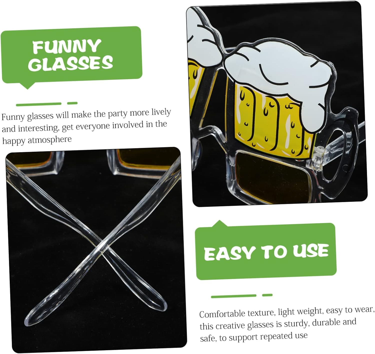 dei pacchetti 1 x boccale di birra con occhiali Caratteristiche -Colore: occhiali da foto gialli - Dimensioni: 16,00X14,00X10,50 cm/6,29X5,50X4,13 pollici occhiali da sole per photobooth -Materiale: bicchieri da festa in PE divertenti - Materiali di prima qualità con ottima fattura, design a forma di boccale di birra, i bicchieri da festa possono stupire gli altri con altri occhiali da festa. - I bicchieri divertenti renderanno la festa più vivace e interessante, coinvolgendo tutti nell'atmosfera dei bicchieri da festa per . - Texture confortevole, peso leggero, facile da indossare, questi occhiali creativi sono robusti e sicuri, per supportare l'uso ripetuto di occhiali da sole originali per le feste. - Ottimi come oggetti di scena per photo booth per feste estive, bomboniere per feste estive, forniture per feste in piscina, da distribuire, riempitivi per sacchetti , bomboniere per feste luau, adatti alle tue esigenze, occhiali da sole per feste per adulti. - Crea divertenti e creative per scattare foto utilizzando questi divertenti occhiali da sole e immortala i momenti indimenticabili della festa con gli accessori per le foto. Descrizione della merce occhiali da festa divertenti Gli occhiali da sole divertenti per le feste sono realizzati con e leggeri con un'eccellente lavorazione, caratterizzati dal design dell'aspetto del boccale di birra, possono sicuramente lasciare ricordi indimenticabili per tutti, aggiungendo facilmente un'atmosfera di festa più felice. occhiali per la festa delle Hawaii Buoni per la maggior delle persone che li indossano, puoi anche condividere questi divertenti occhiali con la tua famiglia o i tuoi amici, divertiti molto