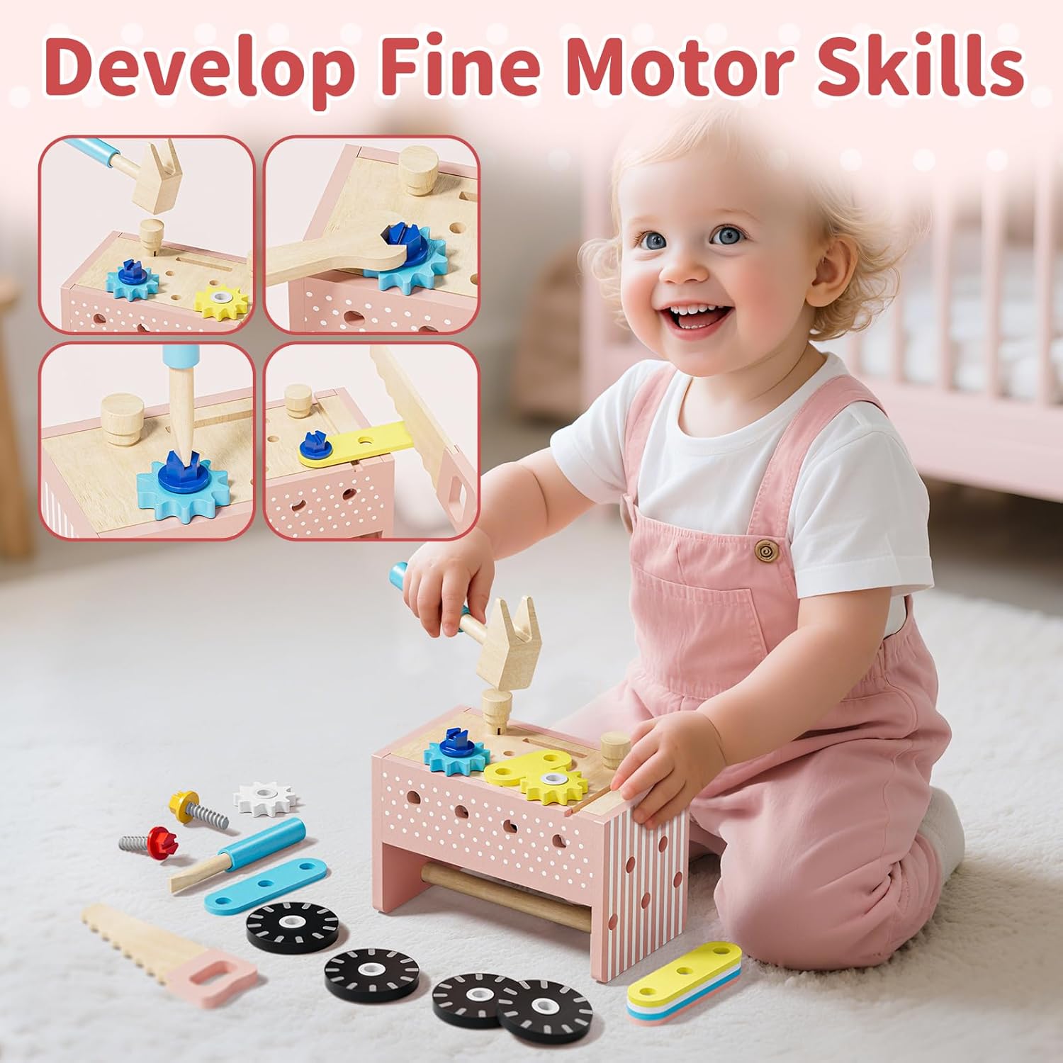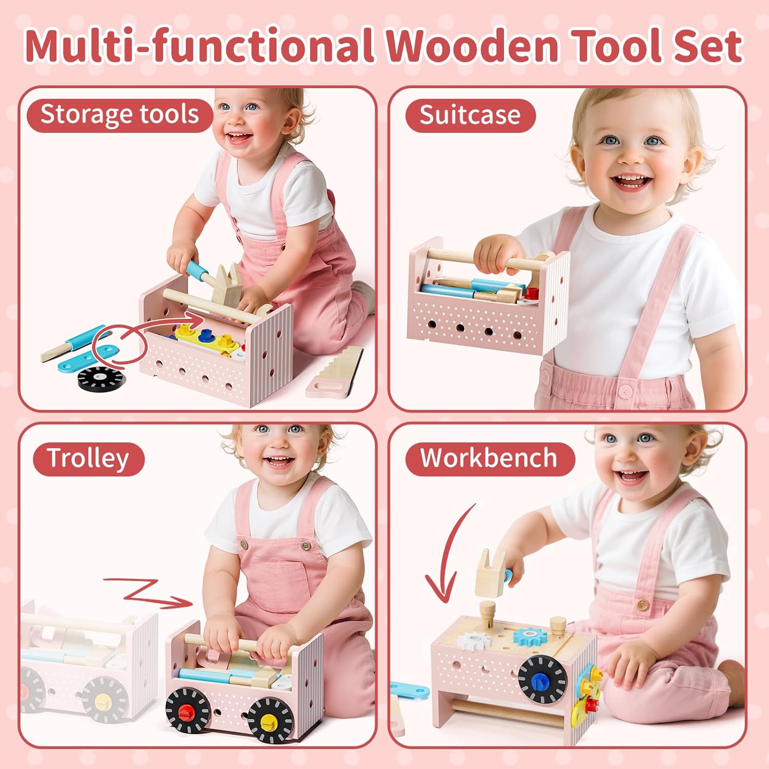 Cassetta Attrezzi Bambini Multifunzione: Capovolta diventa un banco da lavoro per bambini, con una maniglia diventa una valigia, con le ruote si trasforma in un piccolo carrello, puoi riporre tutto; promuovere il senso dell'ordine e dell'indipendenza dei bambini Sicuro per le Mani dei Bambini: Giochi in legno realizzato in legno di alta qualità, robusto e durevole; superficie liscia senza spigoli vivi o schegge; dimensioni perfette per le mani dei piccoli, giochi bambina 2 anni ideali per piccoli artigiani Giocattolo Educativo Montessori: Attrezzi giocattolo bambini stimola motricità fine, logica e percezione spaziale; le cassette degli attrezzi per bambini, come giochi montessori 2 3 4 anno, sono ideali per costruire e organizzare in modo divertente e sono perfette per lo sviluppo precoce Divertenti Giochi Fai Da Te: Con martello, sega, cacciavite e chiave inglese, Idonei a costruire e riparare; stimolano la creatività, il riconoscimento delle forme e le abilità dei bambini nell'uso degli utensili; può fare giochi di ruolo con i genitori Regalo Perfetto per Bambine: Il design rosa è dolce e delicato, pensato per le bambine; ideale per compleanni, natale o sorprese; regalo bambina 2 3 4 anni che ispirano fantasia e crescita attraverso il gioco di ruolo