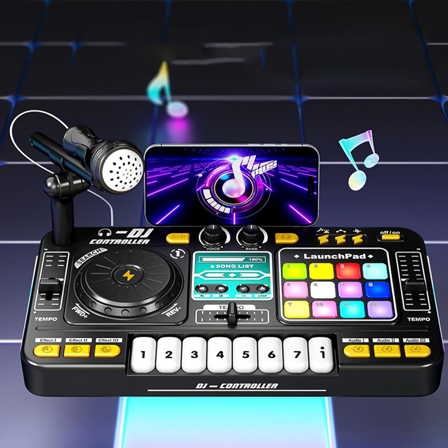 Materiali di lunga durata: con un design compatto, questo giocattolo per pianoforte per miscelatore musicale è per piccoli spazi. Conserva facilmente e portalo ovunque tu vada, assicurandoti spesso di divertirti musicali a portata di mano Portale e compatto: offrendo un'esperienza senza soluzione di continuità con il controllo del volume, questo piano giocattolo non mantiene interruzioni per gli altri. Vanta abilità di registrazione/riproduzione, connettività mobile, 3 effetti DJ, 12 opzioni MIDI e funzionalità portatili Migliora le capacità creative: design realistico con microfono e funzionalità wireless immerge i bambini nell'esperienza del giradischi DJ, scatenando la loro creatività e trasformandoli in piccole mentre si dondola con stile Conveniente da usare: i bambini possono ispirare i loro talenti musicali ospitando un addestramento spontaneo in jam con amici, connettendosi senza sforzo a pH mobile wireless, y e utilizzando il microfono regolabile per un'esperienza di produzione musicale collaborativa che rafforza le relazioni genitore-figlio Ottimo regalo: Cool DJ Music Mixer Electric Toy per Little DJ, arricchendo la vita musicale per bambini e coltivando il loro interesse per la musica, buono come regalo di compleanno