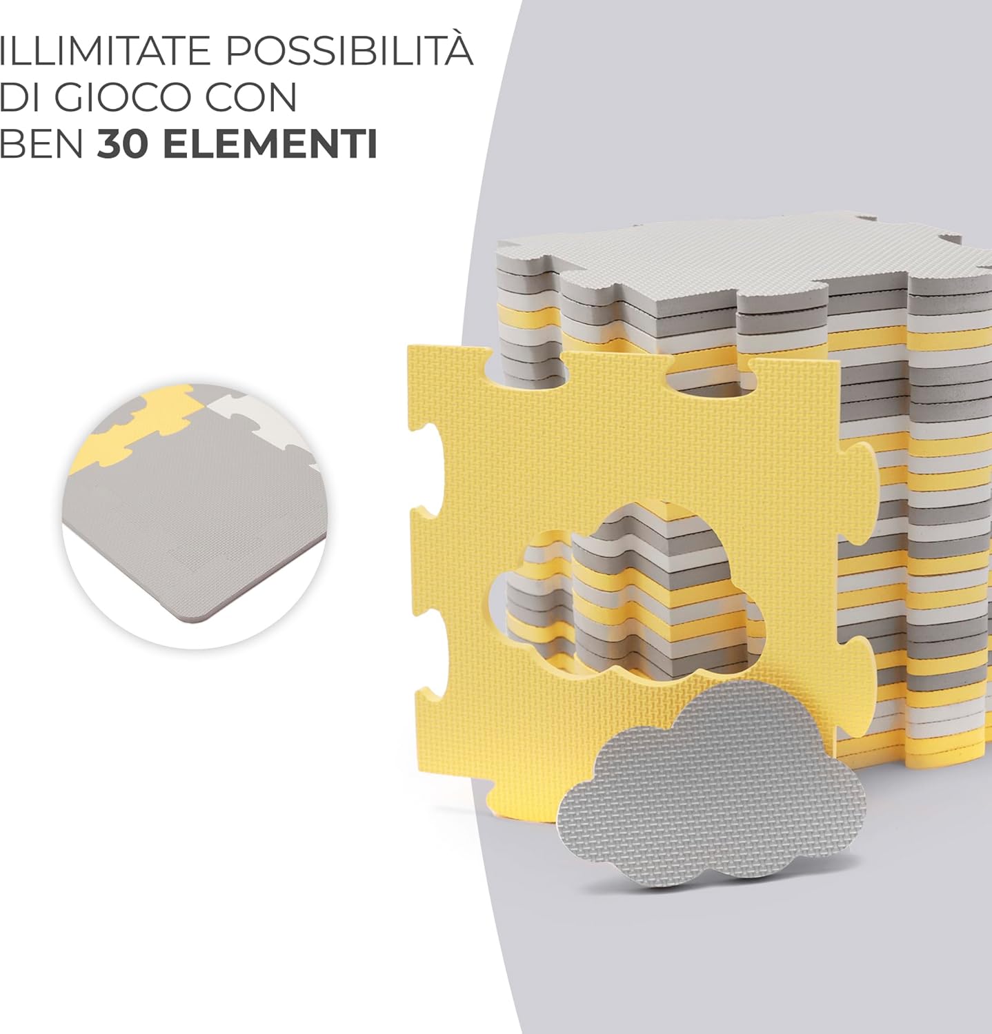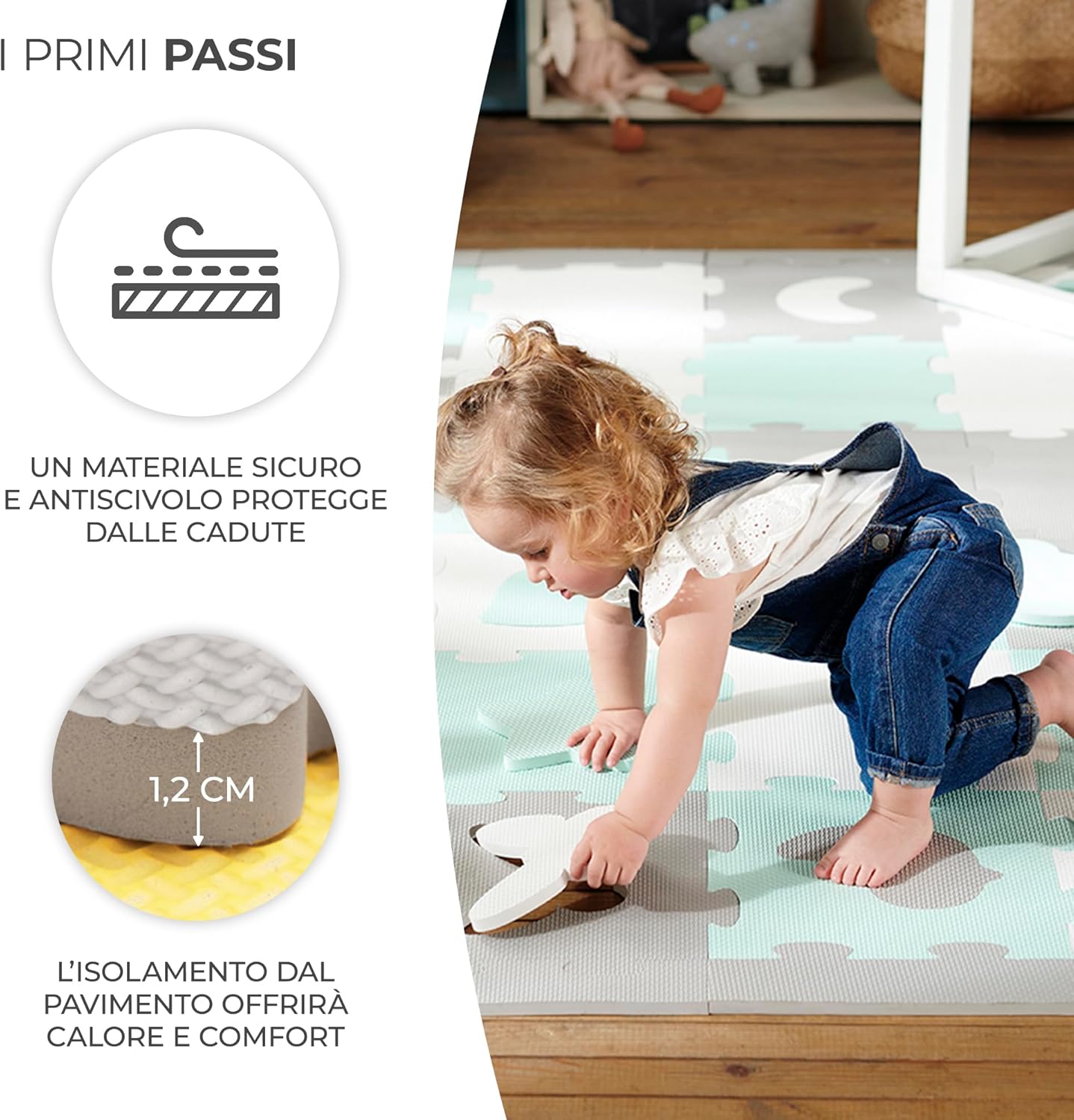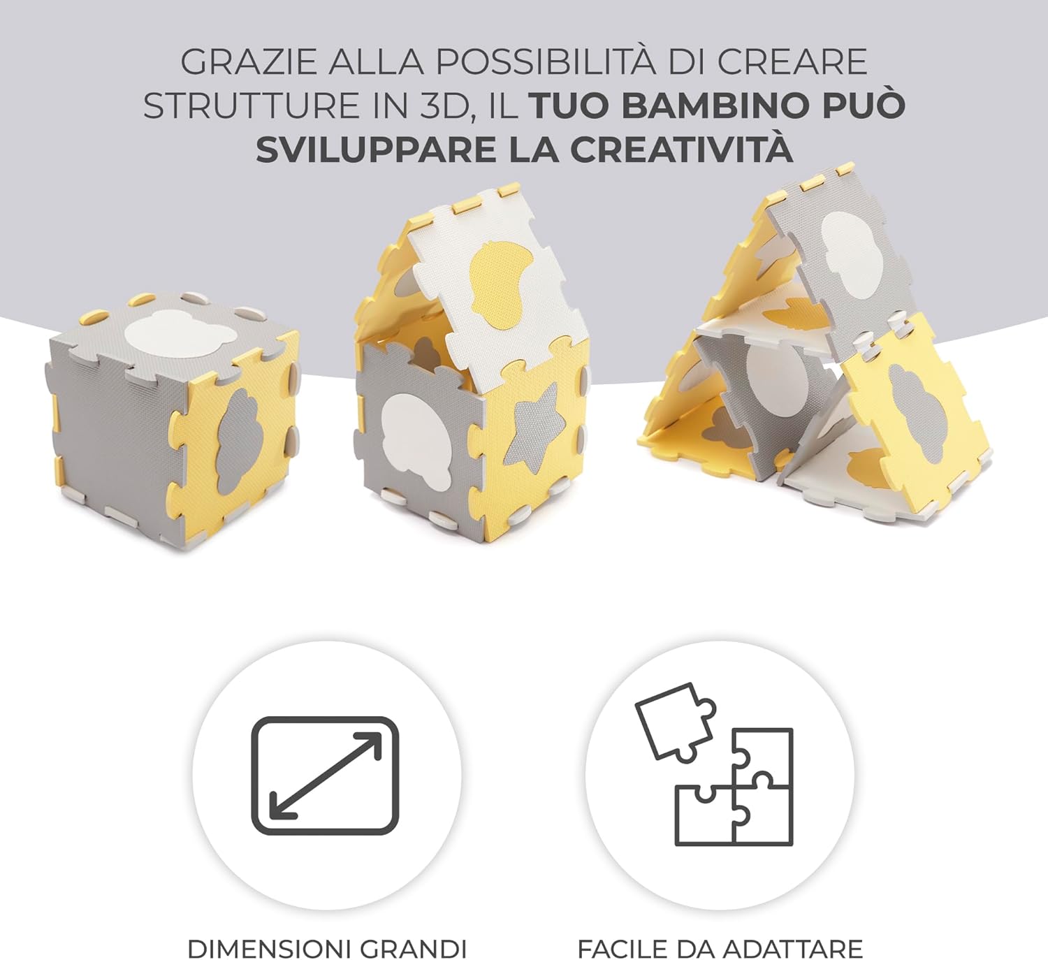 TAPPETINO DA GIOCO: LUNO SHAPES è molto spesso (1,2 cm). Fornisce un buon isolamento dal pavimento – sia che si tratti di piastrelle o di pannelli freddi. Inoltre, la superficie ruvida del puzzle protegge perfettamente il bambino e lo aiuta ad imparare a gattonare e a fare i primi passi. AMPIA AREA GIOCHI: Le dimensioni massime del tappetino misurano 185 x 165 cm. Combinando tutti o alcuni dei componenti, LUNO SHAPES si adatterà alle dimensioni della vostra casa e alle esigenze del bambino, regalandogli uno spazio sufficientemente ampio per sdraiarsi e giocare. 30 PEZZI DI PUZZLE: Il tappetino da gioco in schiuma LUNO SHAPES si compone di 30 pezzi di puzzle. 15 dei quali dispongono di forme ritagliate nel mezzo – che stimolano l’immaginazione del bambino e lo fanno divertire. I pezzi del puzzle possono essere disposti in qualsiasi modo e creare forme in 3D. FACILE DA SPOSTARE: Una volta chiuso, il tappetino da gioco occupa pochissimo spazio. Grazie alla possibilità di staccare i pezzi del puzzle e di metterli nella borsa, LUNO SHAPES ti accompagnerà ovunque. Il tappetino da gioco è leggero e puoi riporlo facilmente nell’armadio oppure sotto il letto. FACILE DA PULIRE: Grazie a LUNO SHAPES, anche dopo il divertimento più sfrenato non sarà difficile riordinare la stanza. Il tappetino da gioco è impermeabile e protegge dalle macchie di cibo e liquidi mantenendole in superficie. Basta pulire lo sporco con un panno e poi tornare a giocare.