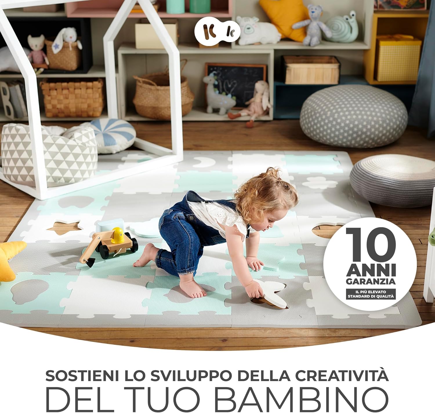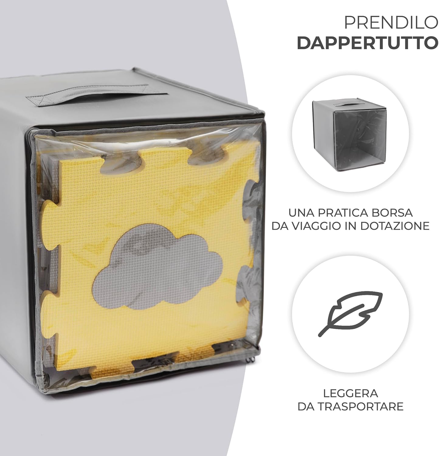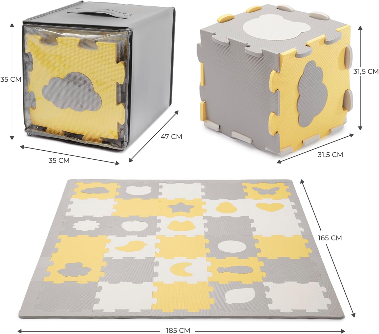 TAPPETINO DA GIOCO: LUNO SHAPES è molto spesso (1,2 cm). Fornisce un buon isolamento dal pavimento – sia che si tratti di piastrelle o di pannelli freddi. Inoltre, la superficie ruvida del puzzle protegge perfettamente il bambino e lo aiuta ad imparare a gattonare e a fare i primi passi. AMPIA AREA GIOCHI: Le dimensioni massime del tappetino misurano 185 x 165 cm. Combinando tutti o alcuni dei componenti, LUNO SHAPES si adatterà alle dimensioni della vostra casa e alle esigenze del bambino, regalandogli uno spazio sufficientemente ampio per sdraiarsi e giocare. 30 PEZZI DI PUZZLE: Il tappetino da gioco in schiuma LUNO SHAPES si compone di 30 pezzi di puzzle. 15 dei quali dispongono di forme ritagliate nel mezzo – che stimolano l’immaginazione del bambino e lo fanno divertire. I pezzi del puzzle possono essere disposti in qualsiasi modo e creare forme in 3D. FACILE DA SPOSTARE: Una volta chiuso, il tappetino da gioco occupa pochissimo spazio. Grazie alla possibilità di staccare i pezzi del puzzle e di metterli nella borsa, LUNO SHAPES ti accompagnerà ovunque. Il tappetino da gioco è leggero e puoi riporlo facilmente nell’armadio oppure sotto il letto. FACILE DA PULIRE: Grazie a LUNO SHAPES, anche dopo il divertimento più sfrenato non sarà difficile riordinare la stanza. Il tappetino da gioco è impermeabile e protegge dalle macchie di cibo e liquidi mantenendole in superficie. Basta pulire lo sporco con un panno e poi tornare a giocare.