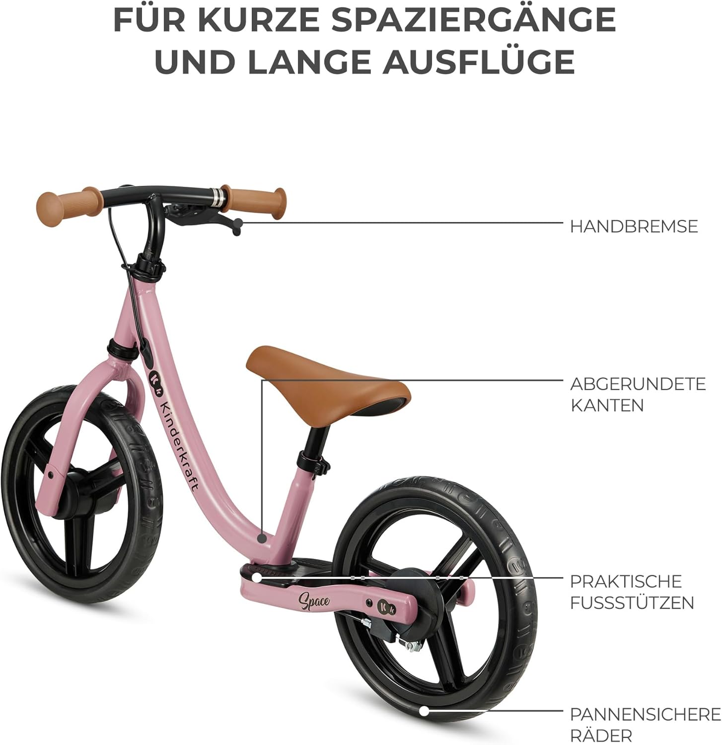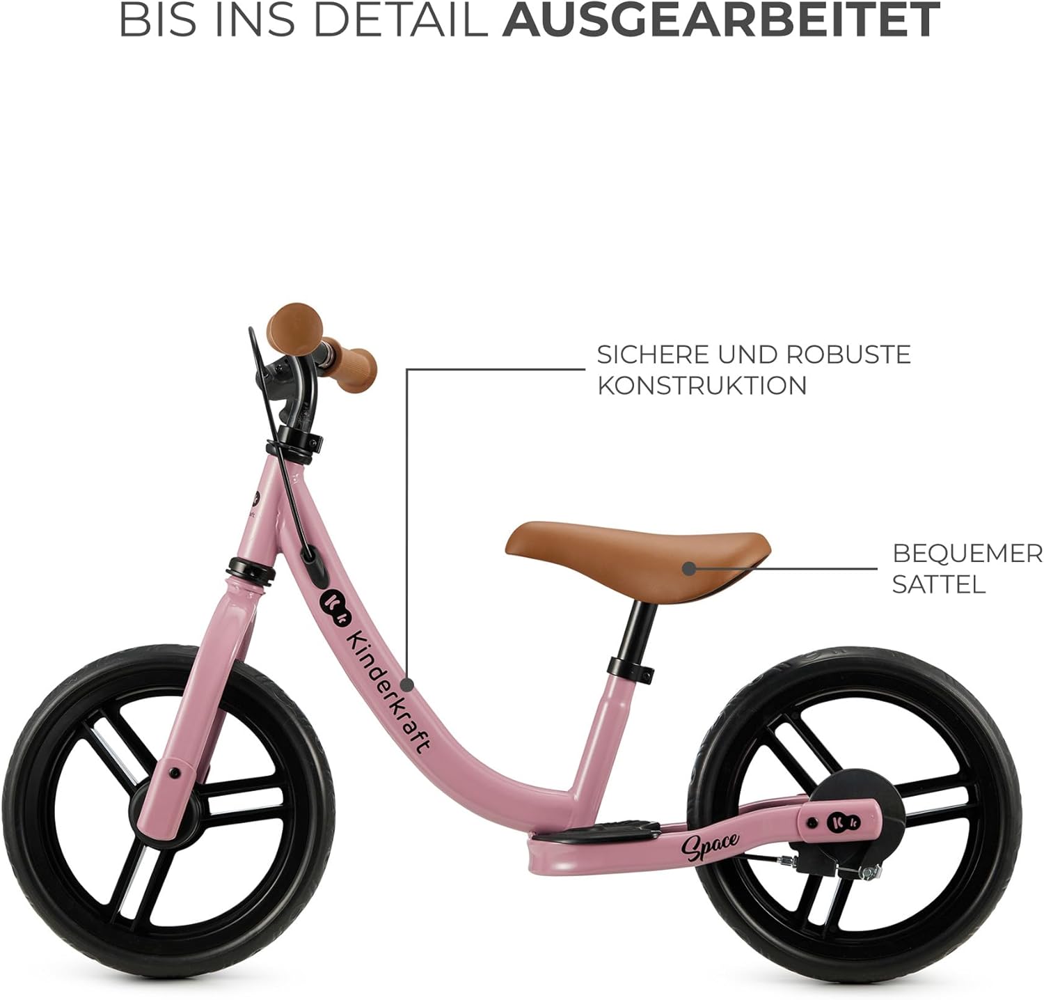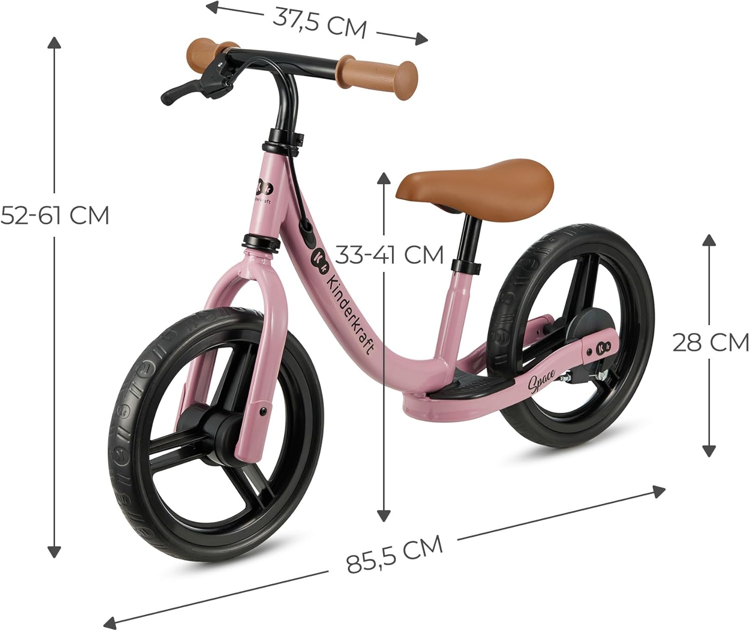 FUNZIONALE: bicicletta senza pedali per bambini da 80 cm a 35 kg. Ha un bellissimo design sportivo e grandi pneumatici (28 cm di diametro) in schiuma che non possono essere forati. Sulla ruota posteriore è presente un comodo poggiapiedi. La bici senza pedali è ideale per le gite fuori porta e le passeggiate in città SICURA: La bici senza pedali ha un angolo di sterzata limitato, che impedisce svolte improvvise e incontrollate e riduce il rischio di cadute durante la svolta. Ha anche il freno a mano sul manubrio. La maniglia è caratterizzata da una superficie antiscivolo ERGONOMICA: Il telaio basso permette di salire a bordo dei bambini a partire da un'altezza di 80 cm. SPACE ha una sella morbida e sagomata che assicura comfort al tuo piccolo durante la guida. La sella è regolabile in altezza su un'ampia gamma (33-41 cm). DUREVOLE: la bici senza pedali è realizzata in solido acciaio, il che garantisce che la bici senza pedali sia durevole e possa essere utilizzata per molti anni. I pneumatici, che non necessitano di gonfiaggio, sono realizzati in schiuma leggera e resistente all'abrasione. L'intera costruzione è realizzata con cura