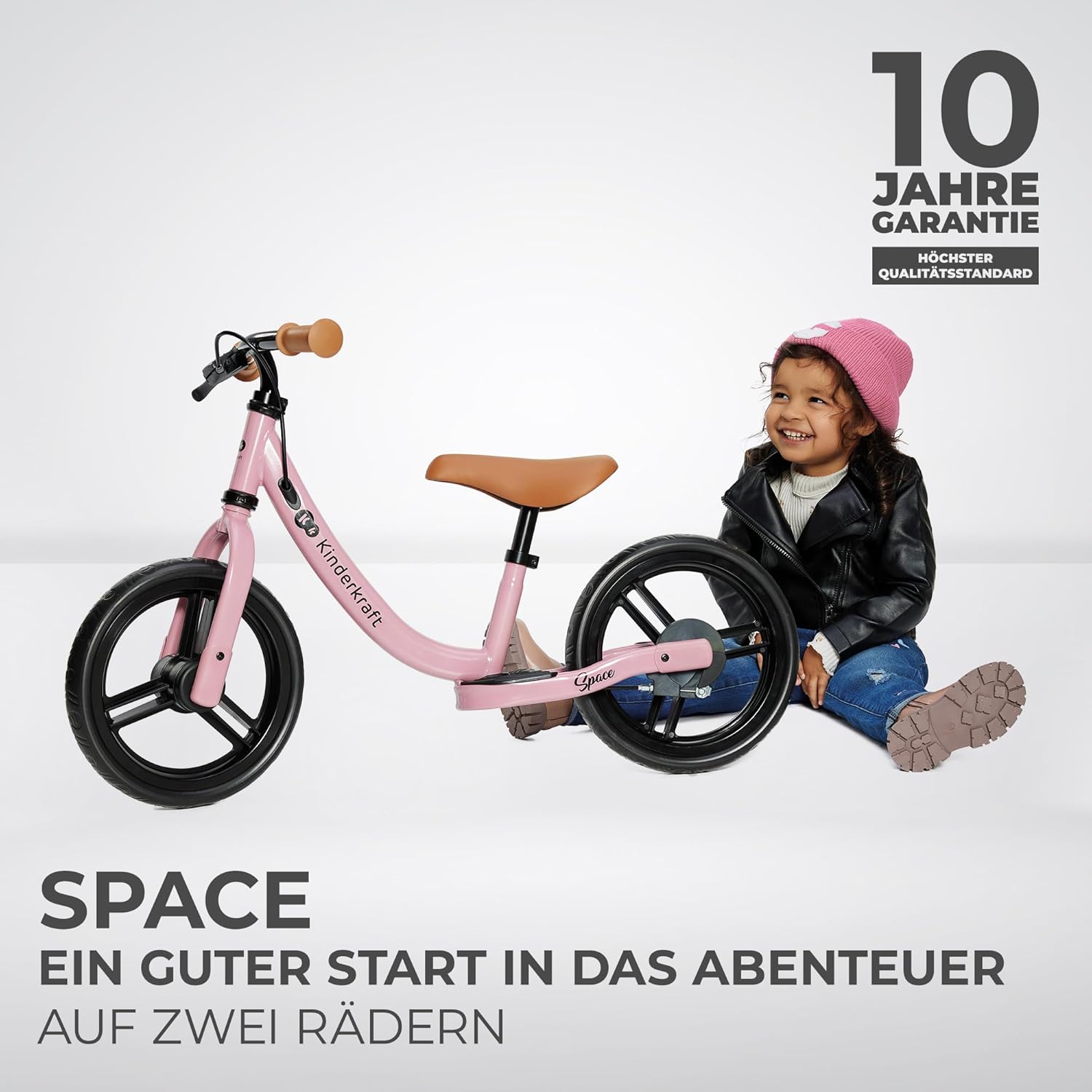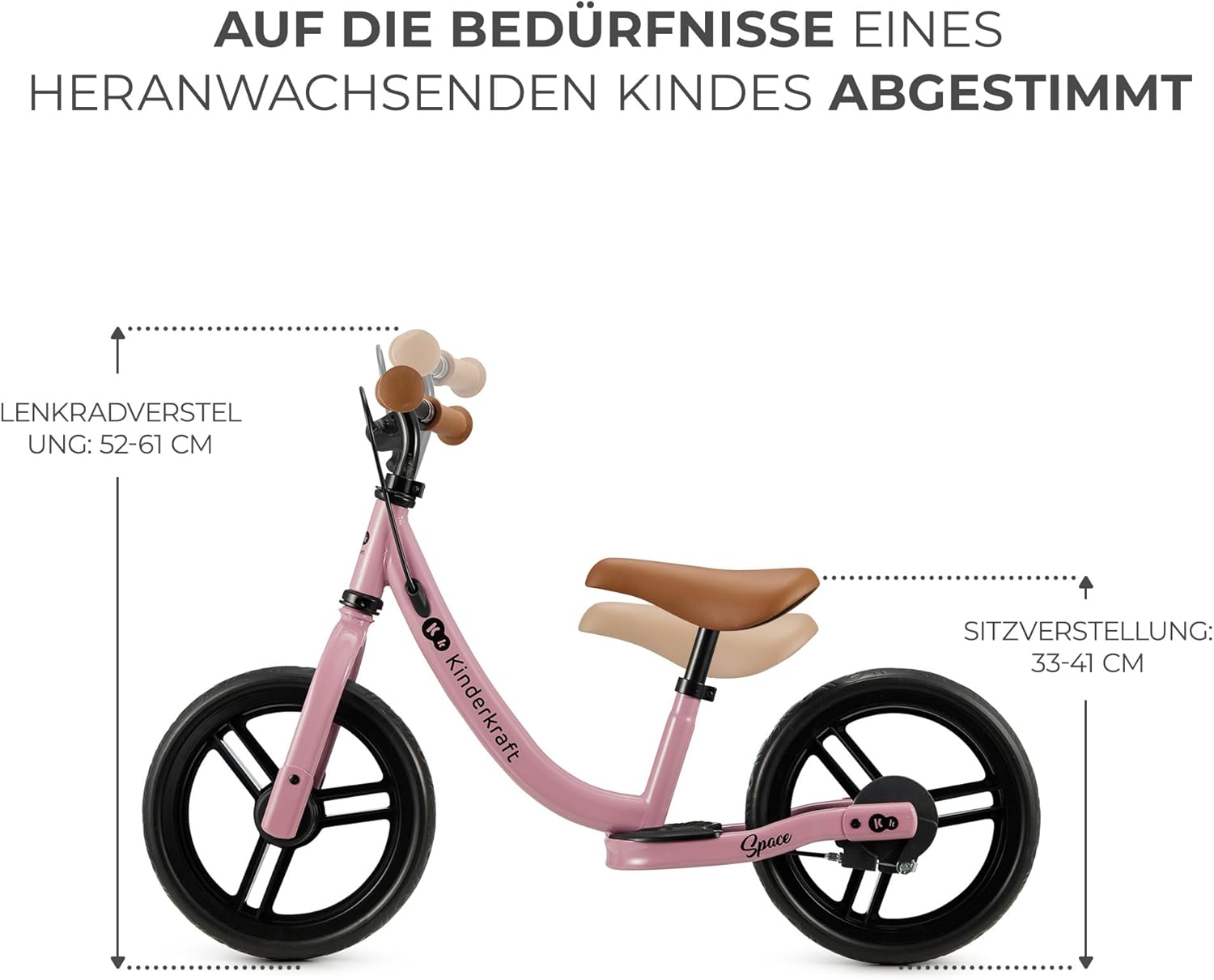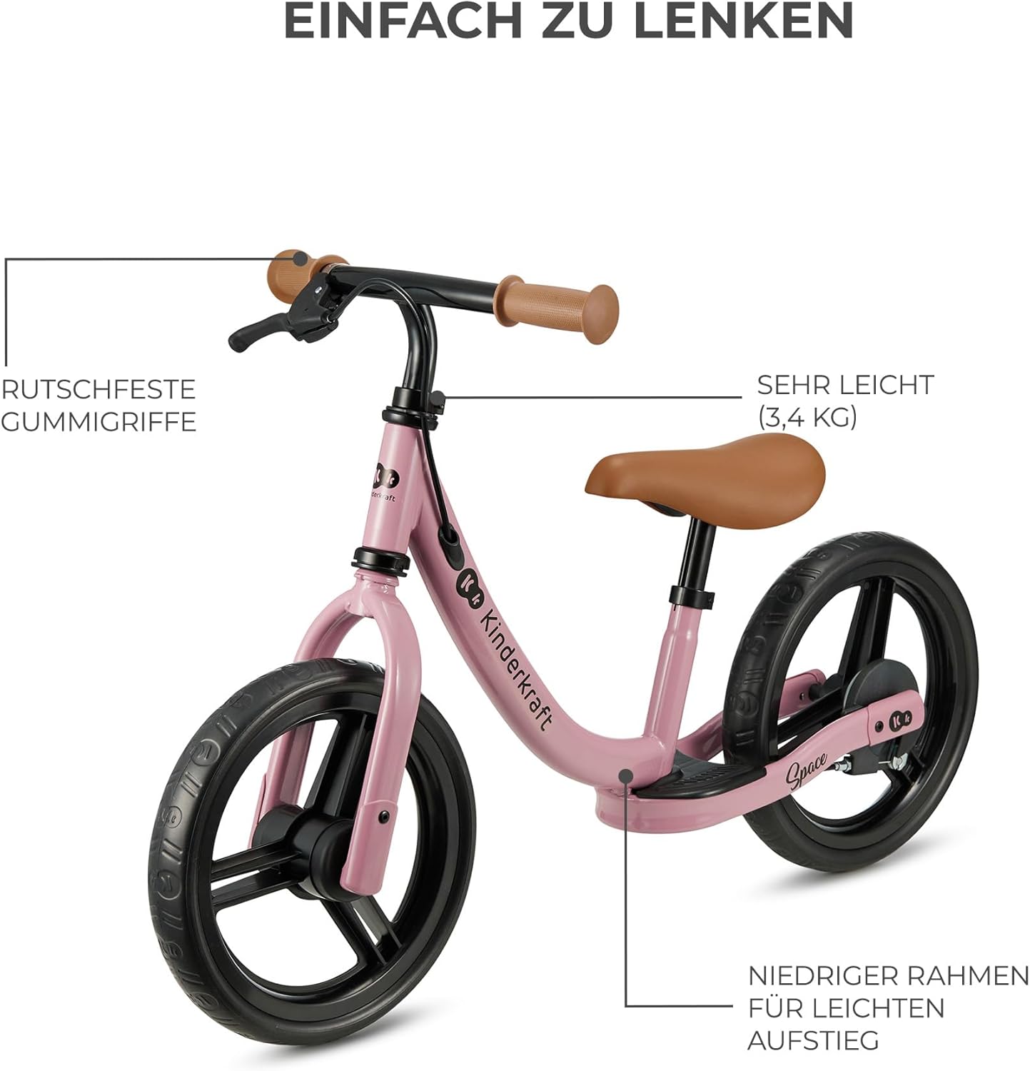 FUNZIONALE: bicicletta senza pedali per bambini da 80 cm a 35 kg. Ha un bellissimo design sportivo e grandi pneumatici (28 cm di diametro) in schiuma che non possono essere forati. Sulla ruota posteriore è presente un comodo poggiapiedi. La bici senza pedali è ideale per le gite fuori porta e le passeggiate in città SICURA: La bici senza pedali ha un angolo di sterzata limitato, che impedisce svolte improvvise e incontrollate e riduce il rischio di cadute durante la svolta. Ha anche il freno a mano sul manubrio. La maniglia è caratterizzata da una superficie antiscivolo ERGONOMICA: Il telaio basso permette di salire a bordo dei bambini a partire da un'altezza di 80 cm. SPACE ha una sella morbida e sagomata che assicura comfort al tuo piccolo durante la guida. La sella è regolabile in altezza su un'ampia gamma (33-41 cm). DUREVOLE: la bici senza pedali è realizzata in solido acciaio, il che garantisce che la bici senza pedali sia durevole e possa essere utilizzata per molti anni. I pneumatici, che non necessitano di gonfiaggio, sono realizzati in schiuma leggera e resistente all'abrasione. L'intera costruzione è realizzata con cura