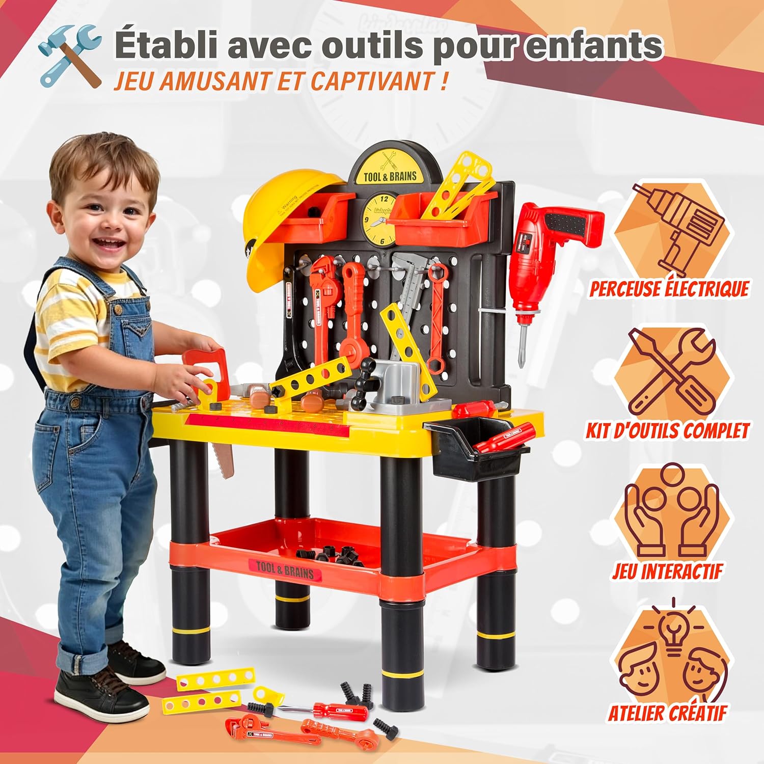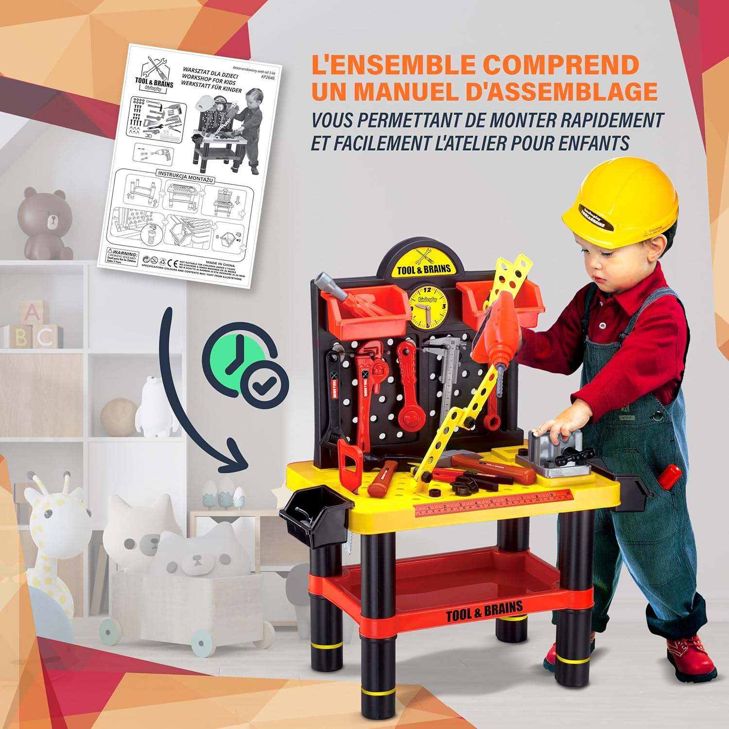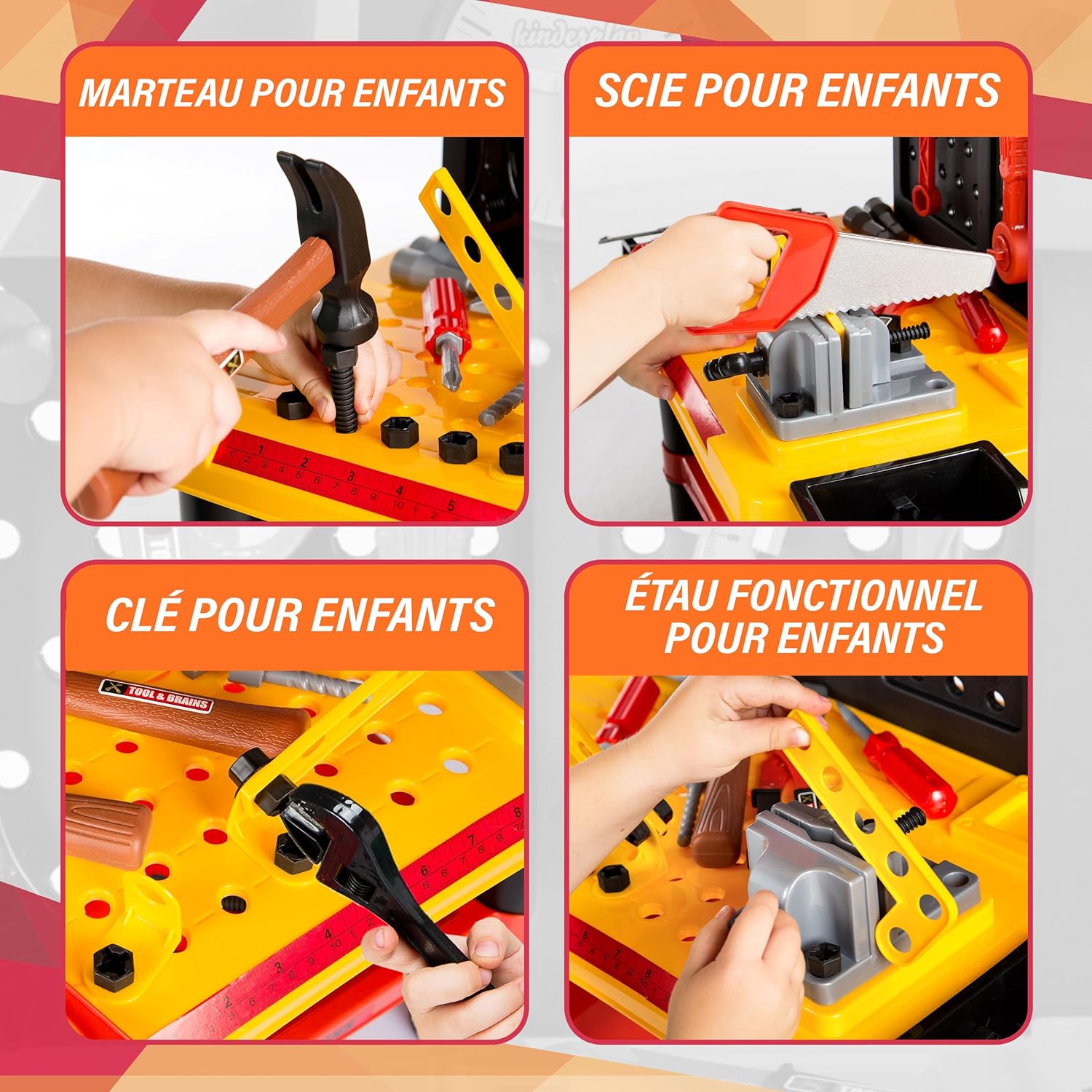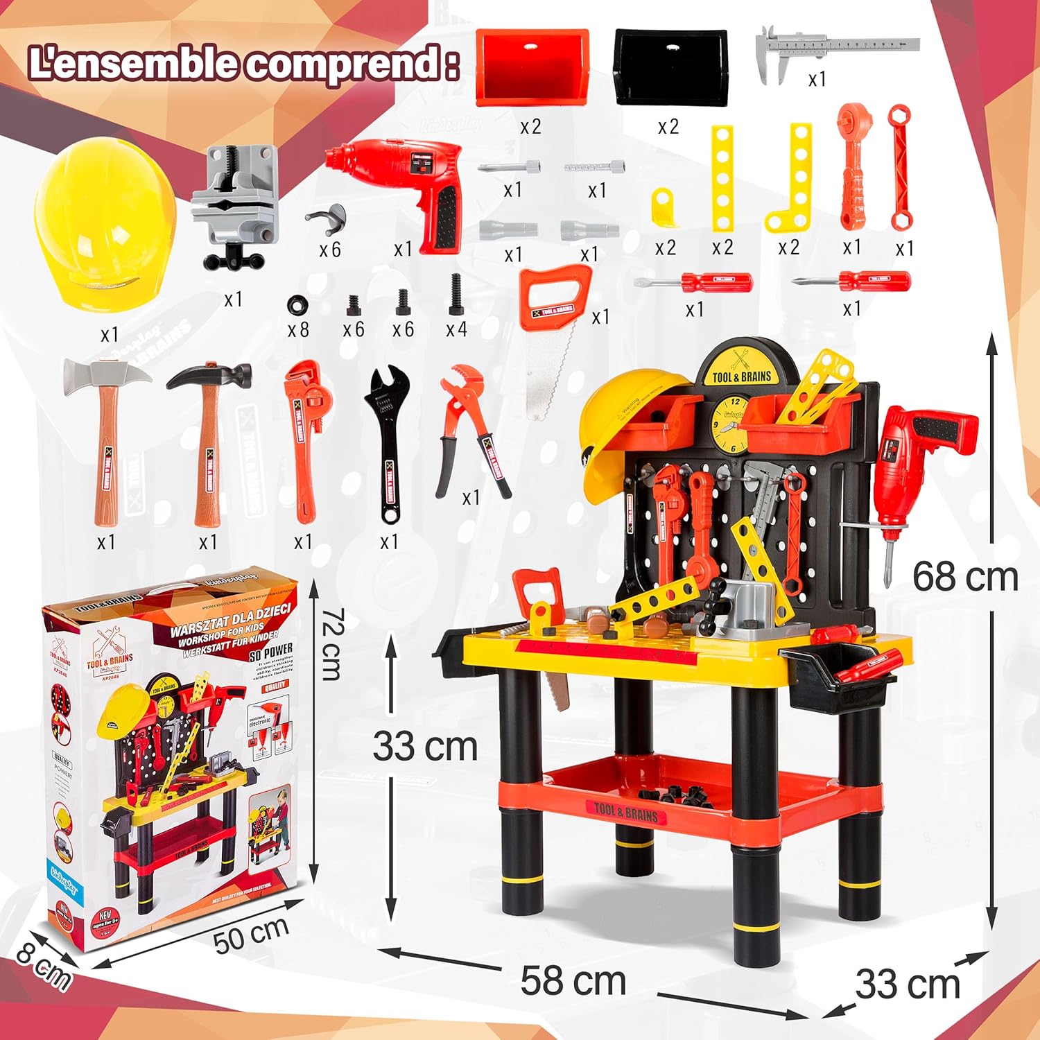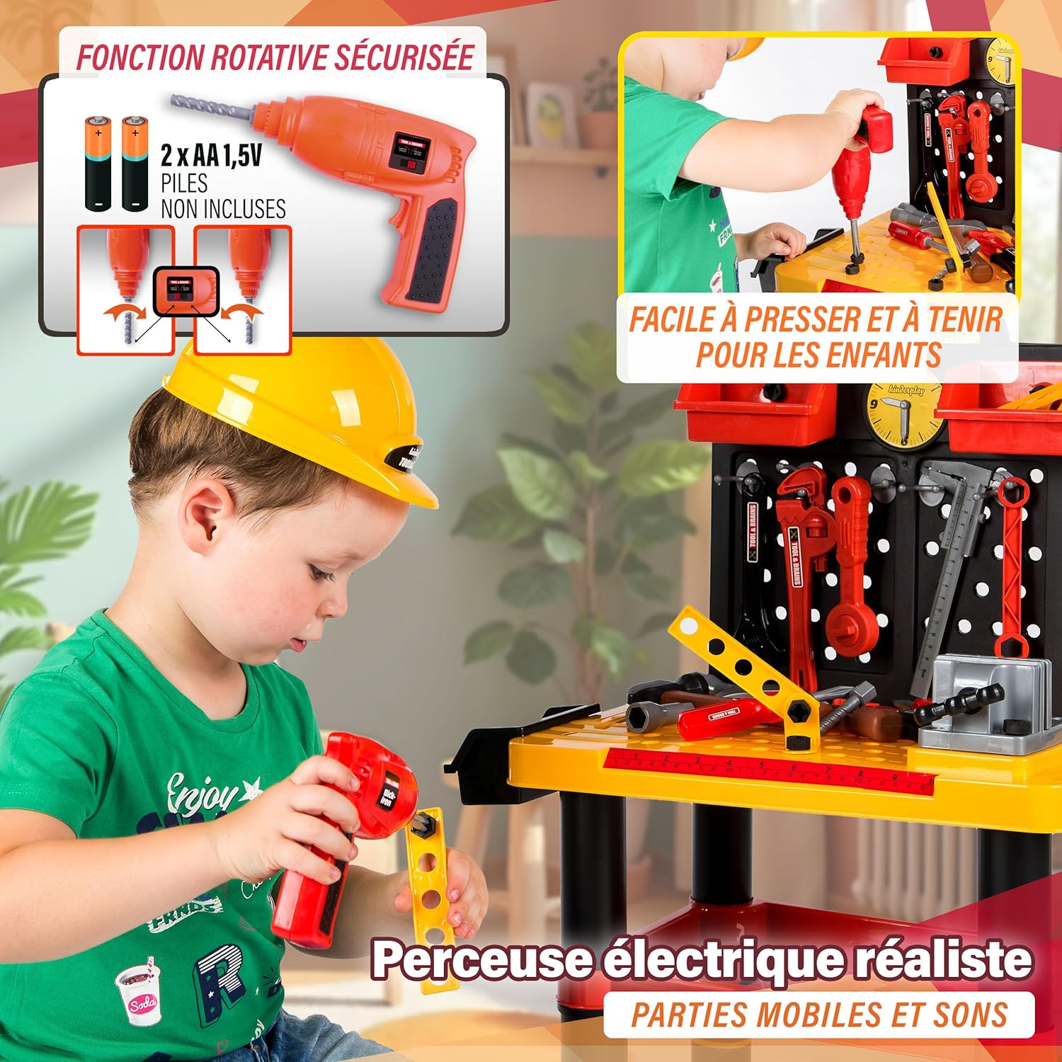 ✔️ [Il kit ha 50 pezzi] – Questo set da banco da lavoro per bambini contiene 50 pezzi con cui ogni piccolo appassionato di fai da te può giocare! Il banco da lavoro per bambini include vari accessori (viti, dadi, parti in finto legno da attaccare tra loro, ecc.) ✔️ [Un trapano che funziona come quello vero] – il trapano a batteria funziona come quello vero. Il trapano gira e il trapano stringe le viti fornite nel kit ✔️ [Casco] – questo è l'unico set che contiene un casco rosso per un gioco sicuro e realistico. Dimensioni interne del casco 17 x 15 cm. ✔️ [Altezza tra pavimento e piano di lavoro 33 cm] – Dimensioni del banco da lavoro per bambini: 58 cm x 33 cm x 68 cm. Peso: circa 3 kg. Il giocattolo occupa poco spazio ed è facile da montare e smontare (manuale di istruzioni chiaro) ✔️ [Un look moderno] - pieno di colori vivaci, questo set estremamente attraente sviluppa l'immaginazione e le capacità motorie del bambino. Questo banco da lavoro per bambini è destinato ai bambini di età superiore a 3 anni. Banco da lavoro fai da te per bambini Kinderplay!