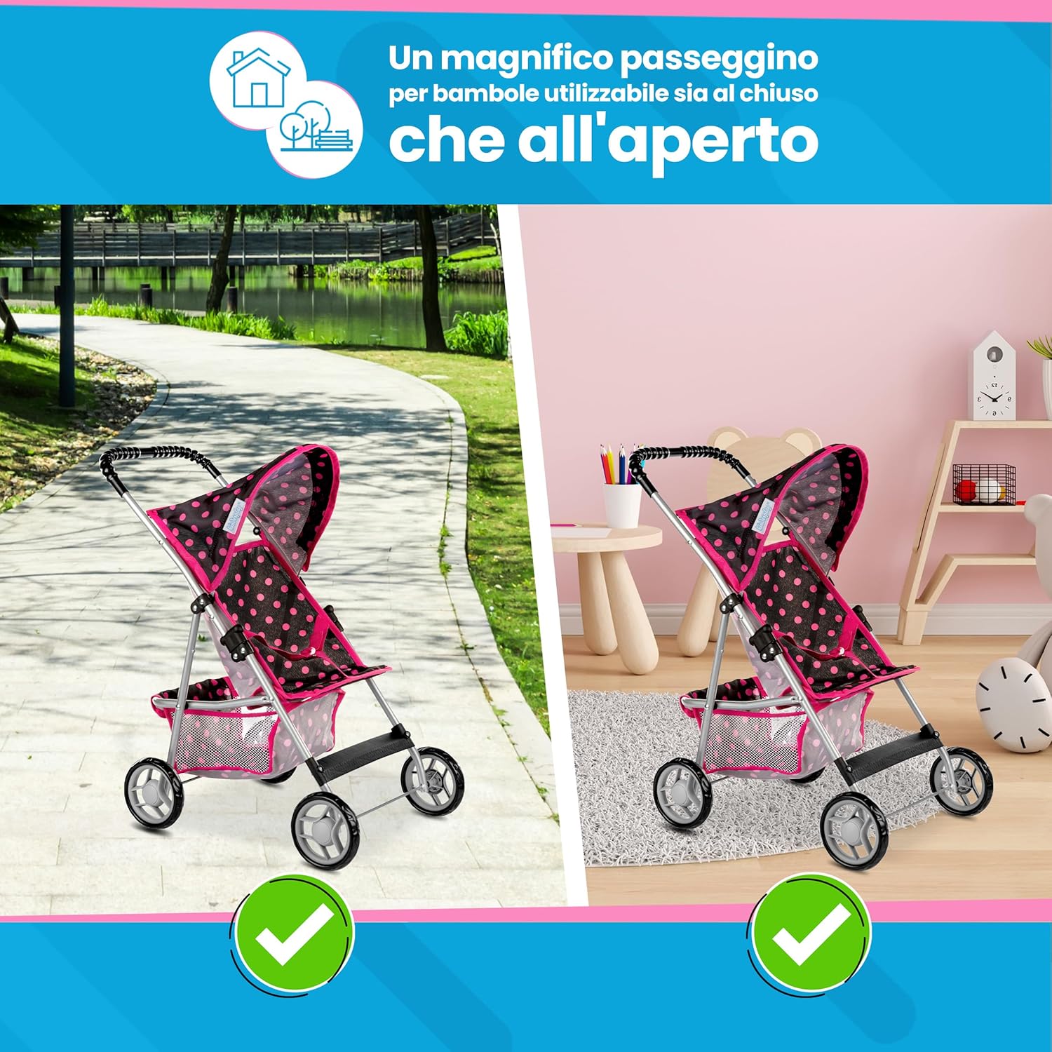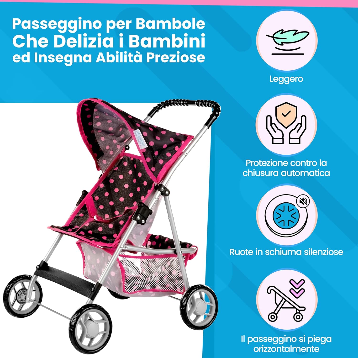 GIOCO REALISTICO => Invita i piccoli a imitare gli adulti, sviluppando autonomia, empatia e creatività durante il gioco di ruolo quotidiano. SCORREVOLE E SILENZIOSO => Ruote in schiuma che scorrono senza rumore e non graffiano i pavimenti; guida stabile e leggera per interni e passeggiate. USO SEMPLICE => Chiusura a ombrello salvaspazio e telaio in alluminio; impugnatura morbida ergonomica con altezza 56 cm, facile da spingere dai più piccoli. COMPATIBILE FINO A 40 CM => Seduta con cintura per bambole fino a 40 cm, ideale per modelli tipo Baby Born e Baby Annabell; cestino a rete per portare oggetti. FACILE DA PULIRE => Tessuti removibili e lavabili in lavatrice a 30 °C; materiali durevoli e sicuri. Età consigliata 3+ con supervisione di un adulto.