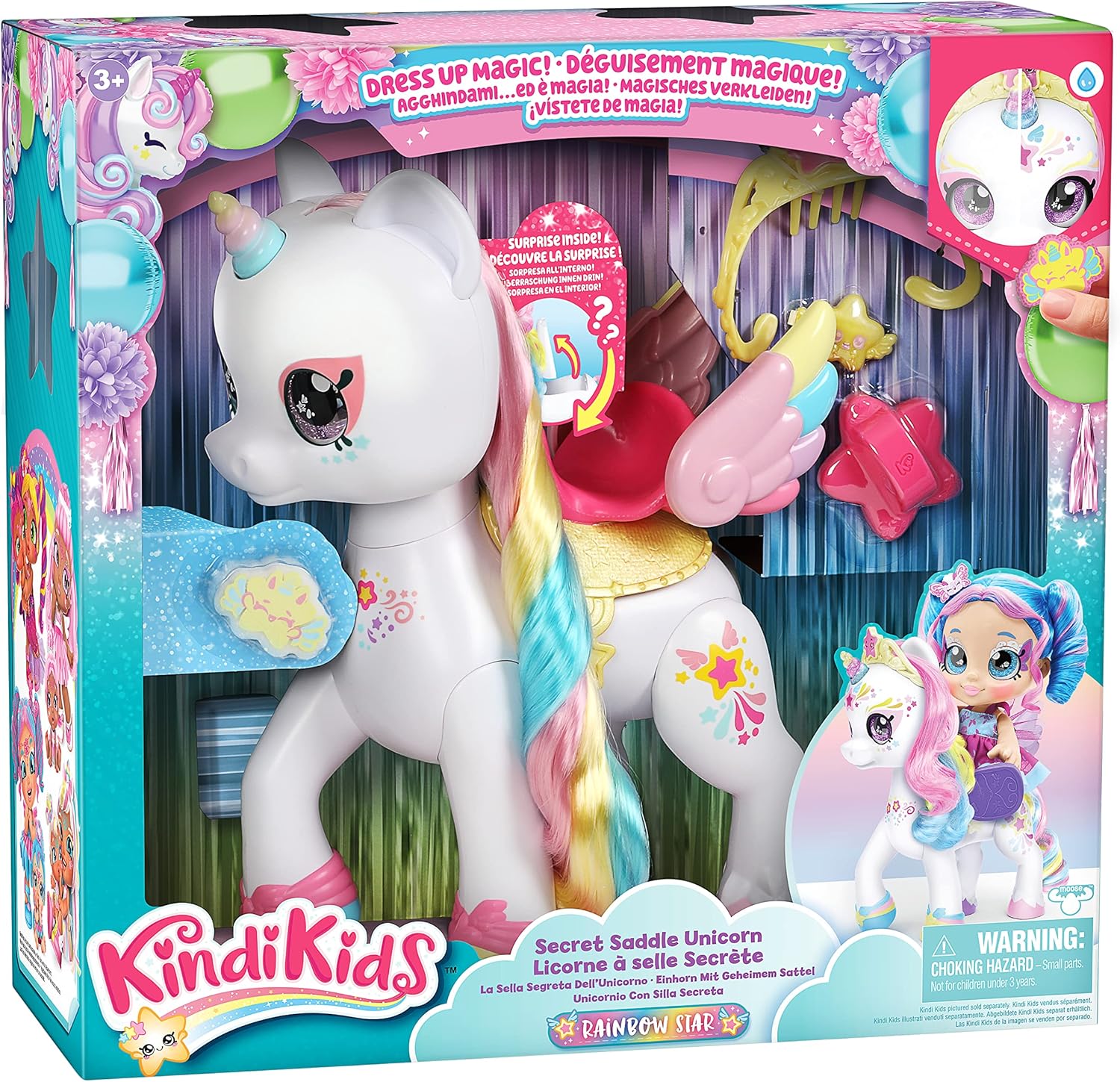 Gira il corno arcobaleno dell'Unicorno Stella Arcobaleno per aprire la sua sella segreta. All'interno, scopri accessori per capelli e molto altro! L'unicorno Rainbow Star ha una bellissima criniera e coda color arcobaleno. Usa la sua spazzola per pettinarli e modellarli. Attacca la sua molletta e inchinati alla sua criniera per decorarla. L'unicorno Rainbow Star viene fornito con una spugna Shopkin per aiutarti a scoprire il suo trucco! Usa l'acqua ghiacciata per rivelare i bellissimi disegni sulla testa di Rainbow Star. Il magico costume da unicorno è della dimensione perfetta per far cavalcare le tue bambole Kindi Kids. Installali sulla sella alata di Rainbow Star. Troverai un arco raro in edizione limitata nella sella segreta di Rainbow Star? Dai 3 anni i bambini adoreranno travestirsi e divertirsi con l'unicorno e tutte le bambole Kindi Kids!