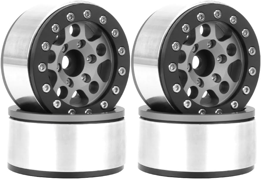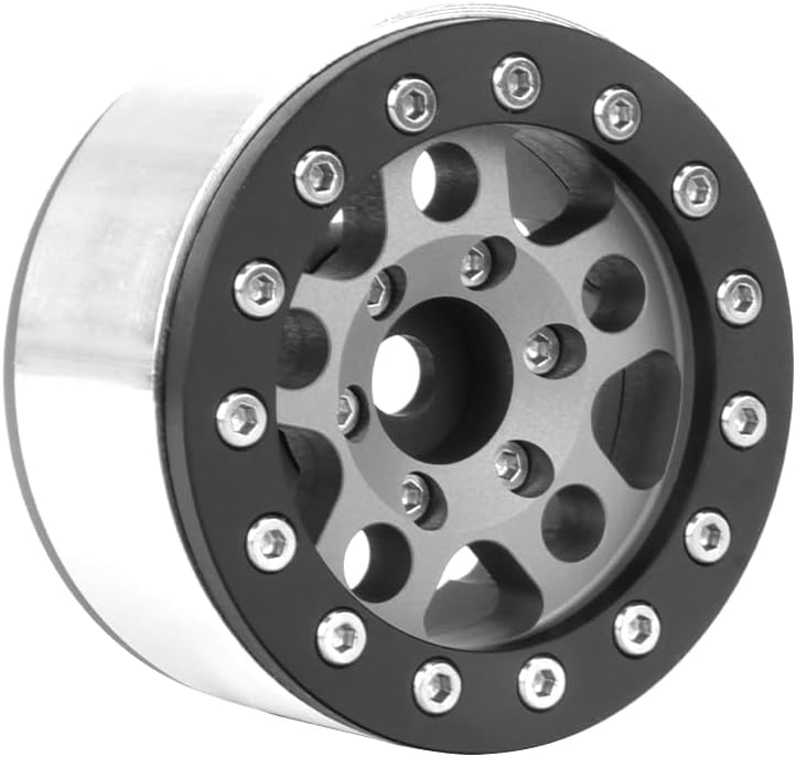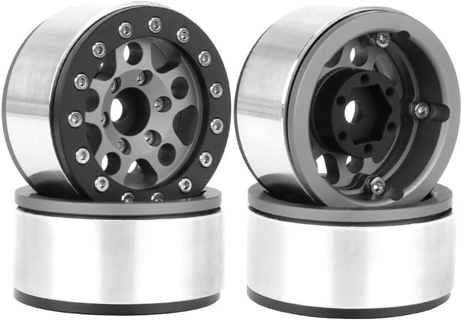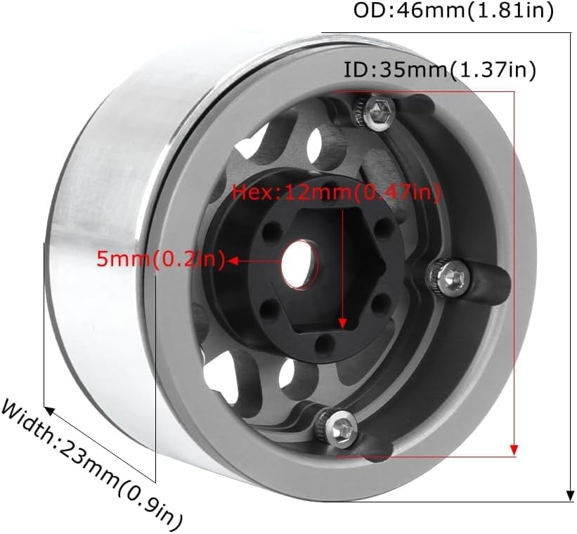 Questi cerchioni per auto RC sono realizzati in lega di alluminio di alta qualità, di piccole dimensioni, robusti, durevoli e resistenti all'usura. Ruote Beadlock originali – non richiede colla, comodo cambio pneumatico. Nuovo aspetto e lavorazione eccellente. Diametro esterno della ruota: 46 mm, diametro interno: 35 mm; spessore ruota: 23 mm, attacco esagonale: 12 mm/0,24 pollici; diametro foro centrale: 5,0 mm Il leggero aggiornamento migliora istantaneamente le prestazioni complessive in termini di maneggevolezza e durata. Cerchi in metallo da 1,55 pollici Beadlock per 1/18 AX90069 UTB18 1/12 1/10 RC Crawler Auto D90 Tamiya CC01 LC70 LC80 D90 TF2 1,55 pneumatici