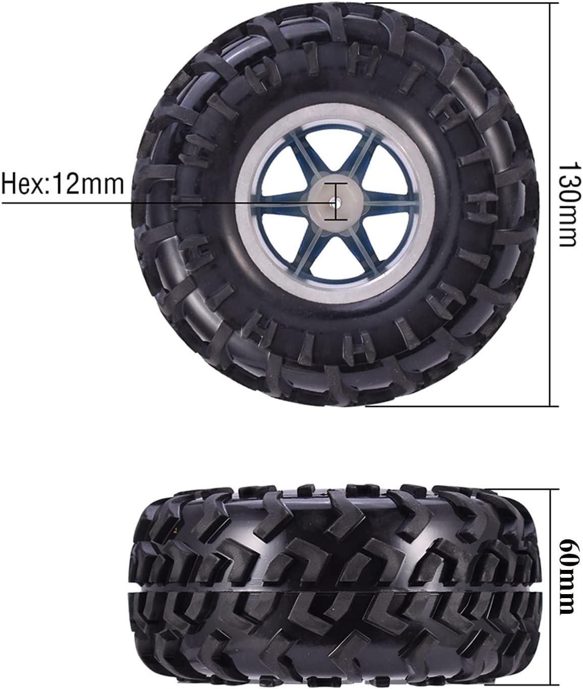 Pneumatici in gomma di alta qualità con inserti in schiuma morbida, elevata resistenza all'usura e durata eccellente Diametro pneumatico: 130 mm, larghezza pneumatico: 60 mm; diametro cerchione: 62 mm, guida esagonale: 12 mm Queste ruote con la loro eccellente qualità e prestazioni possono soddisfare i requisiti del modello RC. Quindi vieni e portalo a casa, una scelta eccellente ti rende più divertente. Per 1:10 RC Rock Crawler Auto Perfetto per gli amanti del modello di auto. (Nota: il pneumatico in gomma è montato sulla ruota, è necessario incollarlo da soli) Si prega di controllare attentamente le dimensioni della ruota e dei pneumatici prima dell'acquisto per evitare che non siano adatti per la vostra auto radiocomandata
