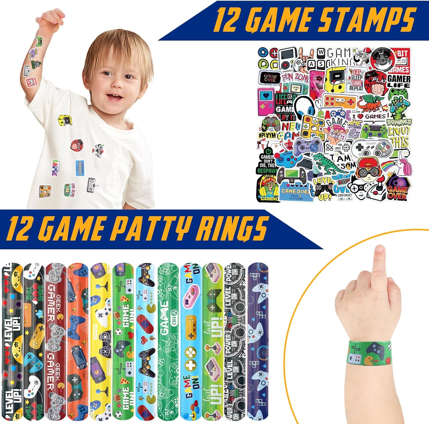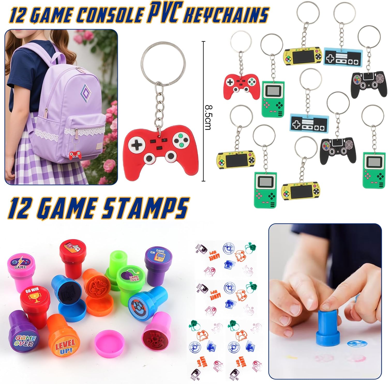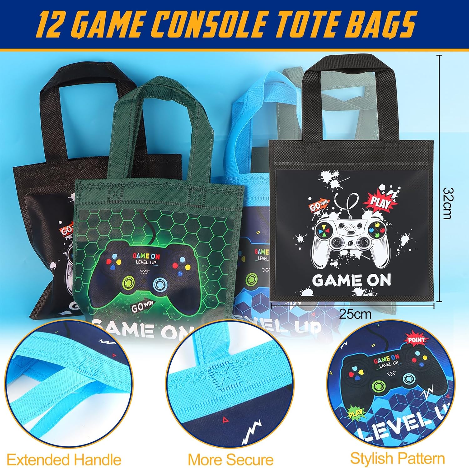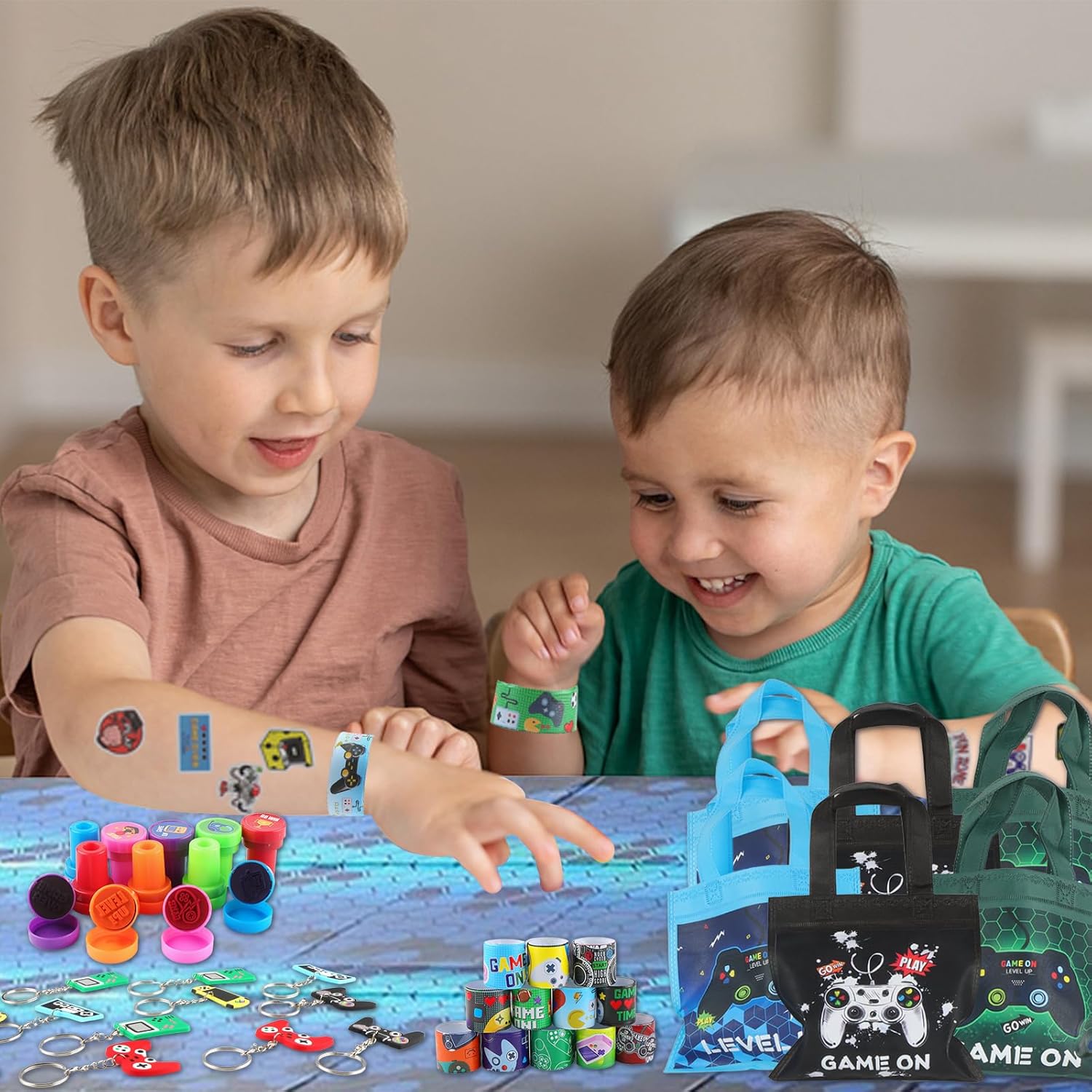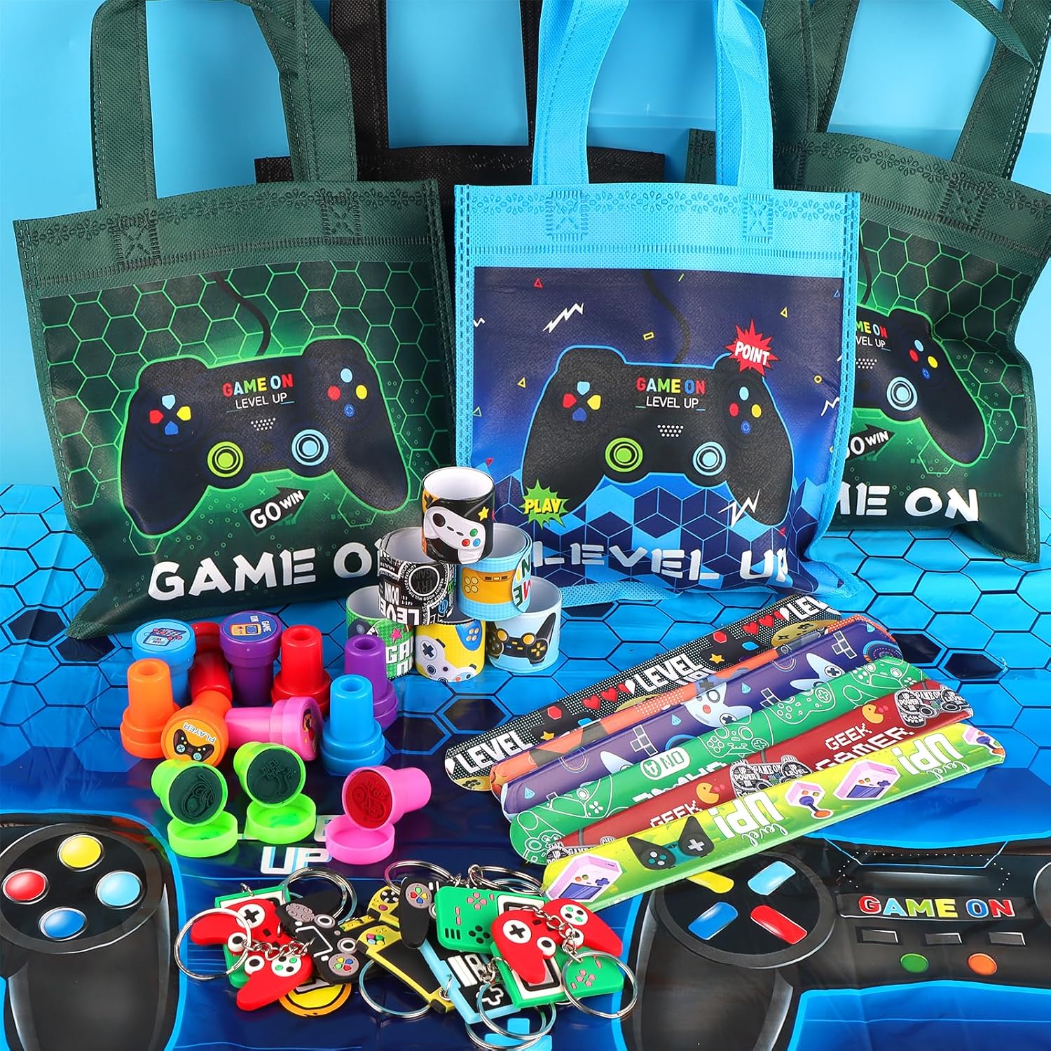99 Videogiochi Gadget Compleanno Bambini: Riceverai 12 Borse tote (4 di colore nero, blu e verde), 12 portachiavi con console di gioco, 12 braccialetti elastici, 12 timbri, 50 adesivi e una tovaglia da gioco di 108 x 180 cm. Scene multiple: Videogiochi Compleanno Regali Festa come borsa regalo di compleanno, premio di classe, sacchetto regalo per le vacanze o anche come bomboniera per bambini, perfetto per genitori, insegnanti e organizzatori di feste. Materiali di alta qualità: La borsa tote è realizzata in tessuto non tessuto, robusto e durevole. Il portachiavi in PVC è impermeabile e resistente allo sbiadimento. Gli adesivi sono impermeabili e le guarnizioni presentano motivi ricchi. La tovaglia ha una superficie liscia, che la rende facile da pulire, resistente allo sbiadimento e agli strappi. Estrema praticità: La borsa tote offre spazio per gli spostamenti quotidiani e l'uso all'aperto. I portachiavi e gli adesivi in PVC resistenti sono progettati per abbinarsi al tema del gioco. Gli anelli e i timbri aggiungono un tocco di interazione sociale. Un'ampia tovaglia impermeabile e antimacchia protegge il tavolo. Comodità:Videogiochi Regalini Fine Festa Compleanno, puoi organizzare facilmente tutti i gadget e le decorazioni in una sola volta, risparmiandoti la fatica e lo sforzo di pianificare e creare una festa a tema divertente ed emozionante per i tuoi bambini.