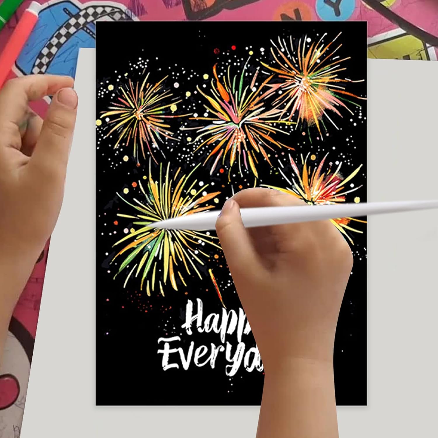 Luminescenza Soffusa Creativa: Il kit utilizza una base di cartoncino fosforescente per offrire un effetto creativo dal bagliore soffuso e avvincente, per laboratori artistici durante serate tra amici o in ambienti domestici raccolti Varietà per Divertimento Creativo: Il kit include 4 fogli di carta graffiante con design creativo e opzioni di modelli diversificati, ispirando l'immaginazione e permettendo libertà espressiva durante il gioco o progetti scolastici, per esplorare l'arte con gioia e semplicità Coordinamento Migliorato: La carta da raschiamo supporta lo sviluppo delle abilità permettendo di rimuovere le superfici grigie, potenziando il coordinamento mano-occhio mentre rivela colori brillanti e motivi intricati, assicurando un passadivertente e arricchente per bambini e adulti Arte con Colori Vivaci: Unisce espressione artistica e vantaggi pratici, incentivando i bambini a esplorare la creatività e aggiungere motivi colorati ai propri progetti. Scelta ponderata come regalo per feste o compleanni, abbellisce inoltre la stanza quando appeso al muro Relax per tutte le età: La carta da graffito offre un'attività calmante che aiuta ad alleviare lo stress e distendersi, adatta a bambini e adulti per godere di creazioni collaborative durante il familiare, rafforzando i legami mentre si crea in un contesto artistico.