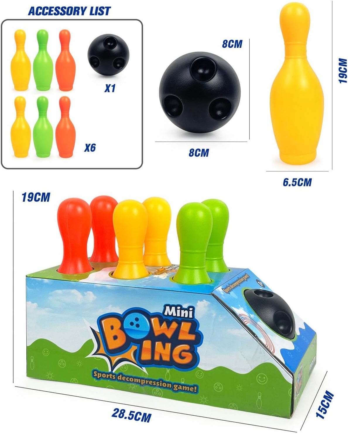 【Occasione】: Il gioco del bowling per bambini è ottimo per una serata o un incontro, al chiuso e all'aperto 【Educativo】: il kit da bowling per bambini può migliorare la concentrazione, la coordinazione occhio-mano e la consapevolezza sensoriale. 【Gioco interattivo per famiglie】: questo giocattolo sportivo da bowling per bambini è un gioco interattivo per famiglie che favorisce l'interazione tra genitori e figli 【Materiale】: Questo set da bowling per bambini è realizzato in materiale PP, che lo rende abbastanza robusto da poter essere posizionato su qualsiasi superficie e resistere ai colpi. 【Regalo】: Set da bowling per bambini con 6 birilli e 1 palla, giocattolo educativo per lo sviluppo precoce, regalo ideale per ragazzi e ragazze per compleanni e vacanze