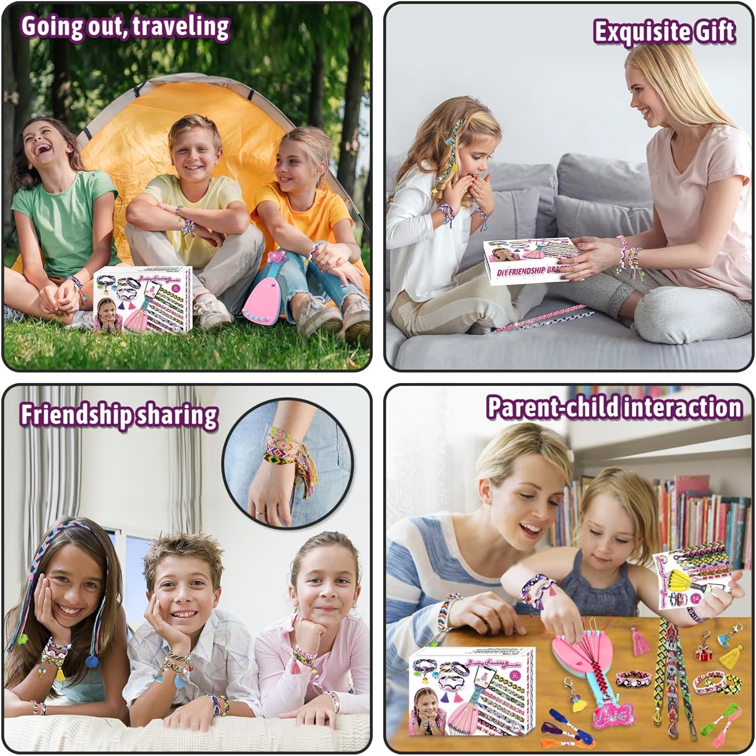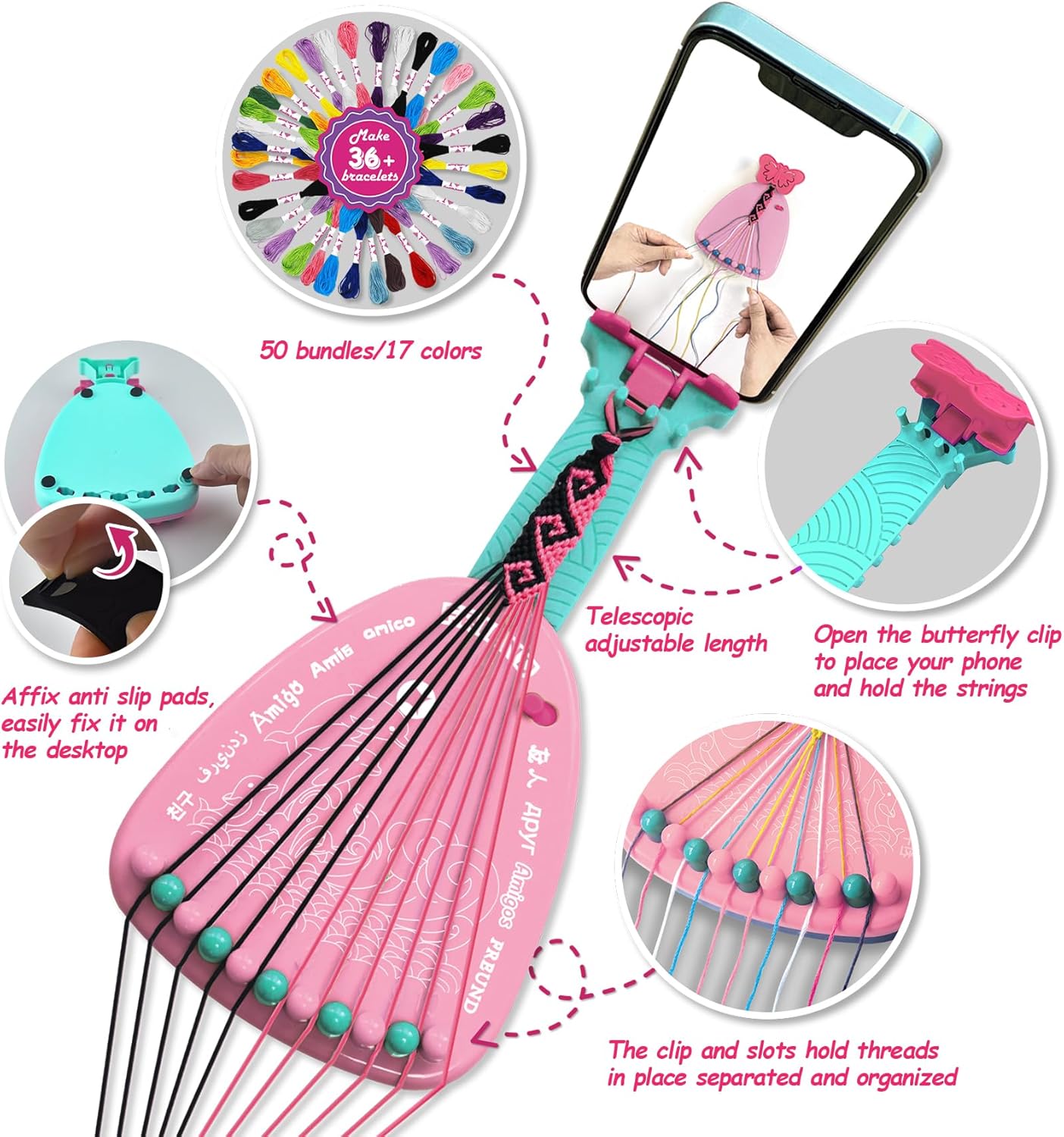 【Crea il tuo braccialetto dell'amicizia】 Diventa creativo con i tuoi amici per creare bellissimi braccialetti dell'amicizia! Il kit di braccialetti dell'amicizia viene fornito con una guida di istruzioni passo-passo per la realizzazione di diversi stili di braccialetti, che combina immagini chiare e testo per aiutarvi a iniziare rapidamente. Il telaio aggiornato è dotato di un supporto per il telefono, in modo da poter lavorare a maglia mentre si guarda il video didattico. 【50 fasci di fili, accessori abbondanti】Dotato di 50 fili in 17 colori, può creare fino a 36 braccialetti. Include anche 1 telaio con supporto per telefono, 4 ciondoli, 4 nappe, 8 tappi decorativi, 2 adesivi per gemme (sentitevi liberi di creare il vostro telaio o braccialetto), 1 sacchetto di stoccaggio, 1 confezione regalo, 1 manuale di istruzioni, 6 cuscinetti antiscivolo (possono essere fissati saldamente al tavolo). 【Facile da fare】 Facile da creare, senza nastro adesivo, spille o aiuto extra, il design unico sull'estremità anteriore del telaio non solo può contenere il tuo cellulare, ma anche tenere le stringhe saldamente in posizione. Le clip e le fessure tengono il filo in posizione, potete fare una pausa e ricominciare da dove avete lasciato! 【Stimola la creatività e l'immaginazione】 I giocattoli artigianali stimolano l'interesse e la curiosità dei bambini, riducono l'esposizione all'elettronica per proteggere i loro occhi. Coltivano la creatività e l'immaginazione, migliorano la coordinazione occhio-mano nel processo di creazione dei braccialetti, promuovendo anche l'interazione genitori-figli. Dotato di una borsa per riporre i braccialetti, per trasportarli facilmente durante i viaggi in auto o in aereo. 【Regalo ideale per i bambini】 Il kit di braccialetti per bambine è il regalo perfetto per festeggiare il compleanno, il Natale, il Ringraziamento, ecc. Le bambine possono giocare da sole o con le amiche, oltre a fare braccialetti, portachiavi fai da te, ciondolo da borsa, può anche essere usato come accessorio per l'estensione dei capelli per le ragazze.