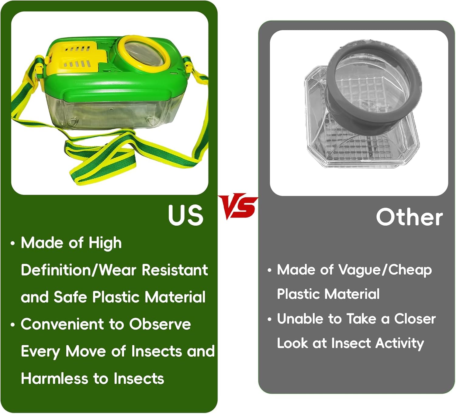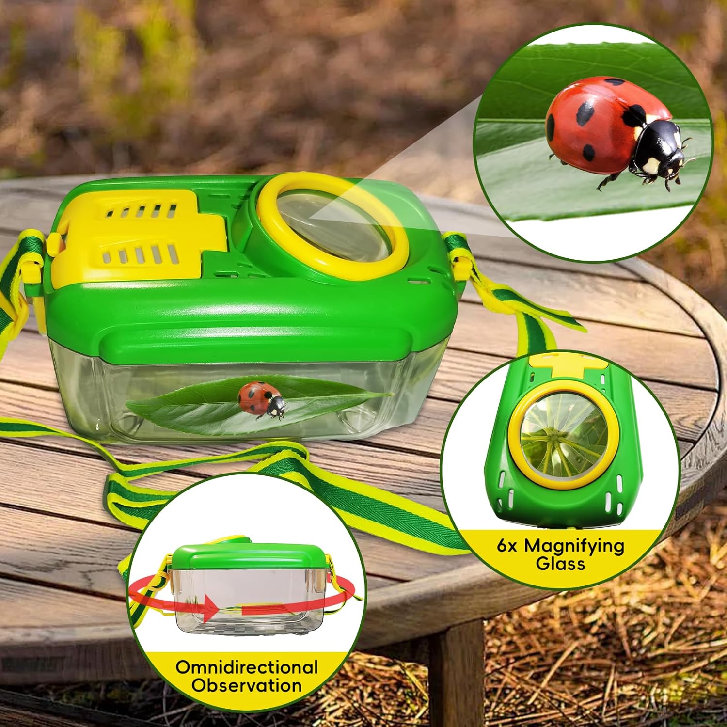 Esperienza coinvolgente nella scoperta degli insetti: questo set per la cattura degli insetti non solo consente ai bambini di catturare facilmente gli insetti, ma è anche dotato di una camera di osservazione ad alta definizione. Nella camera sono presenti lenti d'ingrandimento ad alta definizione, che offrono un'esperienza di osservazione molte volte più chiara. Questo permette ai bambini di scoprire da vicino il mondo degli insetti e risvegliare in loro la curiosità e l'amore per la natura. Design innovativo dell'habitat degli insetti: il nostro habitat degli insetti presenta un'esclusiva struttura di osservazione rotante che consente una visione a 360 gradi senza angoli ciechi. Il fondo è rimovibile e ha uno spazio più ampio, rendendo più facile per i bambini riporre più oggetti naturali e creare la propria casa per gli insetti. Ciò rende l'osservazione ancora più vivace e interessante. Sistema di lente d'ingrandimento a doppio ingrandimento aggiornato: la nostra lente d'ingrandimento ha un ingrandimento di 6x. La grande lente d'ingrandimento fissa può visualizzare chiaramente i dettagli degli insetti e tracciare il movimento degli insetti in tempo reale, offrendo ai bambini un'esperienza visiva microscopica ancora più impressionante. Set di strumenti di rilevamento one-stop: questo set contiene tutti gli strumenti necessari per la cattura degli insetti, come un potente cattura insetti, pinzette sottili e una grande rete. Gli strumenti sono più completi e realizzati con materiali di alta qualità che durano più a lungo. Che si tratti di catturare piccoli insetti volanti o di individuare insetti nell'erba, è semplice e comodo, rendendo il percorso di scoperta dei bambini ancora più agevole. Esempio di giochi educativi di alta qualità: ci concentriamo sulla produzione di giochi educativi di alta qualità, sicuri e rispettosi dell'ambiente. Ogni dettaglio è rigorosamente controllato. Se hai domande o suggerimenti durante l'uso, il nostro team di assistenza clienti professionale è sempre disponibile per offrirti un'esperienza di acquisto senza preoccupazioni.