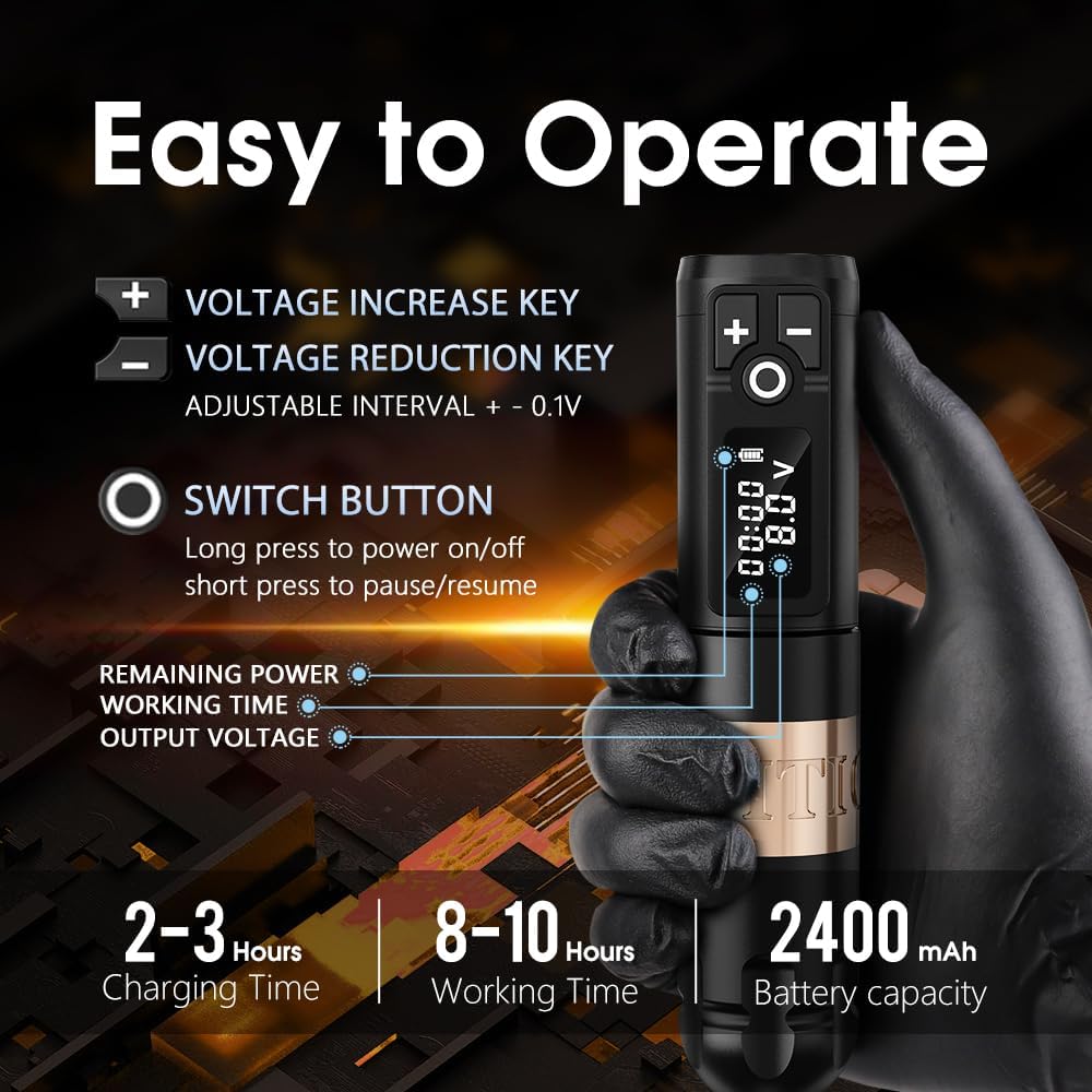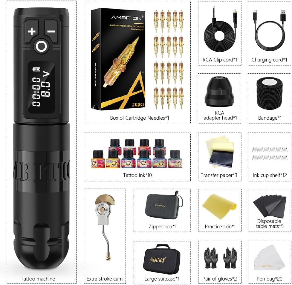 【Kit professionale per la pratica del tatuaggio】 Se desideri un kit per macchinetta professionale piuttosto che un set economico per esercitarti, il set Ambition Soldier è perfetto per te. La macchina e gli aghi sono la scelta di molti tatuatori professionisti. Il Soldato è particolarmente versatile. L'inchiostro è di ottima qualità e tiene bene la pelle. Non è consigliabile utilizzarlo direttamente sulla pelle. 【Struttura avanzata di azionamento diretto】 La macchina del soldato è alimentata da un motore coreless personalizzato che è potente e stabile. La sua velocità di rotazione di 9.000 giri/min - 10 V non si riscalda durante il funzionamento prolungato. Il motore è perfettamente compatibile con una camma da 4,0 mm, garantendo un perfetto equilibrio tra tracciamento, ombreggiatura e applicazione del colore. La struttura a trasmissione diretta garantisce bassa rumorosità e basse vibrazioni. 【Durata della batteria di 10 ore】 La batteria della pistola per tatuaggi è di 2400 mAh, che consente un uso continuo per circa 10 ore quando è completamente carica. Lo schermo LCD offre molteplici funzioni e può visualizzare tensione e timer. L'intervallo di tensione regolabile di 5-12 V semplifica il controllo di diversi disegni di tatuaggi. 【20 Cartucce Glory】 Gli aghi Ambition Glory sono realizzati in acciaio inossidabile medico 316 e plastica medica, riducendo al minimo l'attrito tra l'ago e il suo alloggiamento, pur mantenendo la loro affilatura. Le nostre cartucce sono dotate di un sistema di stabilizzazione dell'ago che ne garantisce la longevità e le prestazioni ottimali. Ogni cartuccia è dotata di una membrana di sicurezza per evitare perdite di inchiostro nel tubo o nella macchina ed è confezionata singolarmente. Contenuto della confezione: il kit completo per tatuaggi Ambition contiene: 1 macchinetta per tatuaggi wireless, 1 attacco camma extra da 4,0 mm, 1 cavo RCA in silicone, 1 cavo di alimentazione, 1 adattatore RCA, 20 aghi per tatuaggio (5X1203RL, 5X1207RL, 5X1207RM, 5X1209RM), 1 benda, 10 inchiostri per tatuaggio, 20 vasetti di inchiostro, 2 paia di guanti, 20 astucci per penne, 1 skin pratica, 3 fogli di carta transfer, 5 tovaglie usa e getta, 1 scatola con cerniera e 1 valigia grande.