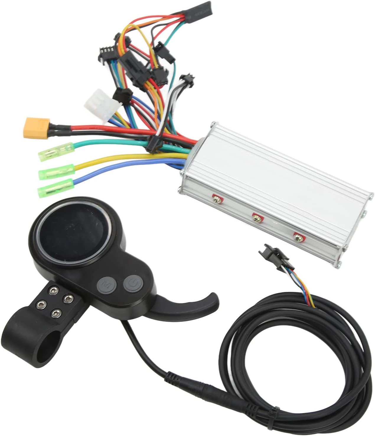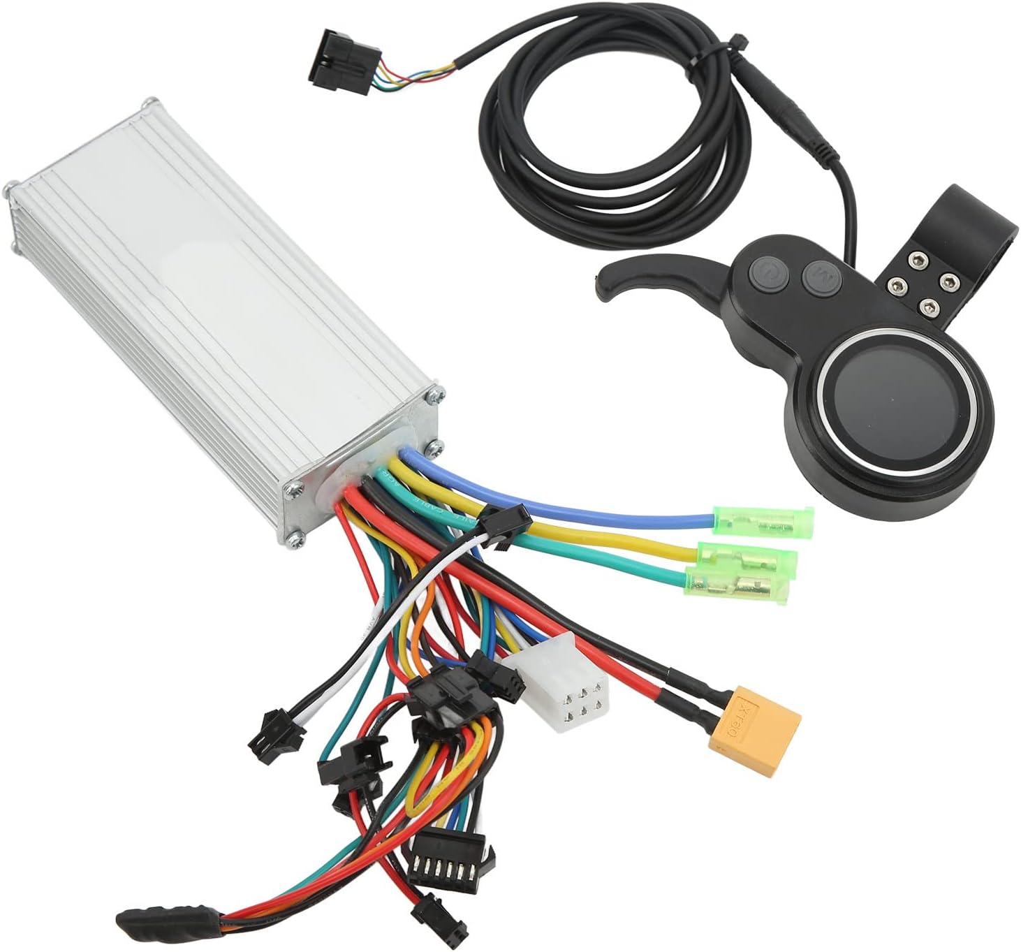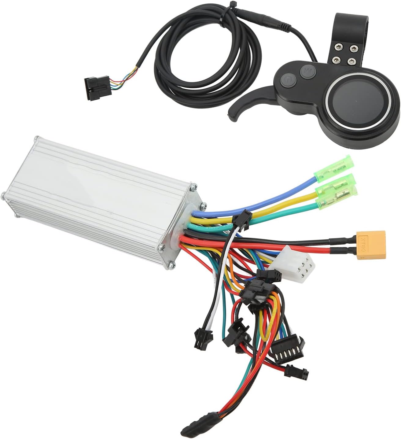 CARATTERISTICHE DEL CONTENUTO DEL DISPLAY: Il controller dello scooter elettrico con display vanta un display completo che mostra informazioni vitali come chilometraggio singolo, velocità in tempo reale, carica e tensione della batteria, indicazione della marcia, chilometraggio totale, codici di errore e stato dei fari, garantendo una chiara visibilità per gli utenti. ECCELLENTE DISSIPAZIONE DEL CALORE: Progettato con impressionanti capacità di dissipazione del calore, il controller del motore brushless protegge efficacemente i circuiti interni dal sovraccarico termico. Questa funzionalità migliora la longevità e mantiene le prestazioni, garantendo un funzionamento affidabile durante l'uso. MATERIALI DI QUALITÀ PREMIUM: Realizzati in ABS di alta qualità e lega di alluminio, i kit controller per scooter 60v 40ah presentano una robusta struttura in metallo con un design scanalato. Questa combinazione garantisce resistenza, durata e prestazioni di prim'ordine, anche in condizioni rigorose. SCENE APPLICABILI: Il controller per bici elettrica 48v è progettato specificamente per l'uso con bici elettriche, scooter e veicoli simili. Il kit controller senza spazzole 48v 60v 500w controller per motore elettrico si adatta facilmente a manubri da 22,5 mm di diametro, rendendo il controller per scooter elettrico 48 v 800 w versatile e compatibile con varie applicazioni e configurazioni di guida. CABLAGGIO COMPLETO DEL CONTROLLER: il controller per scooter da 72 volt con cablaggio LCD include numerose funzioni essenziali: poli di alimentazione positivi e negativi, collegamenti dei cavi del motore trifase, varie interfacce luminose, uscita di potenza della batteria e funzionalità intelligenti come l'assistenza PAS, che ne migliorano la funzionalità.