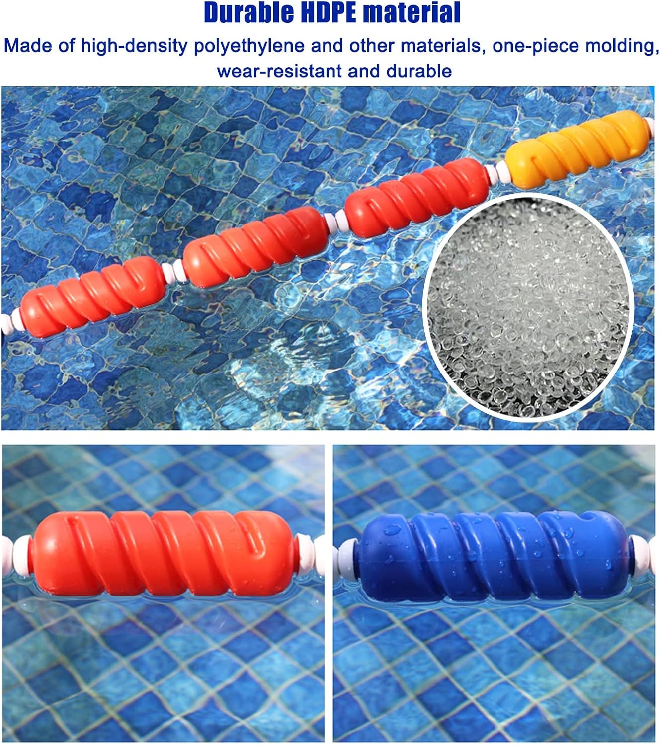 【Visibilità sicura ed efficace】 I colori vivaci delle boe sono facili da identificare nell'acqua e possono distinguere chiaramente le estremità profonde e poco profonde della piscina e le corsie di nuoto. Mantieni tutti al sicuro mentre nuoti. 【Facile da installare】 Fissare entrambe le estremità della linea della boa di sicurezza agli ancoraggi a muro con i nostri ganci. È molto stabile dopo il fissaggio, non si allenta né cade e può essere utilizzato a lungo. 【Specifiche della corda divisoria per piscine】 Dimensioni di ciascuna boa: 20 cm x 9 cm (7 7/8"x3 1/2"). Quantità boa piscina: 5 / m. 【Ampia applicazione】 Utilizzato per separare corsie e aree di nuoto, ampiamente utilizzato in piscine, corsi d'acqua, aree pericolose, spiagge, ostacoli bassi, ecc. 【Divisore per corsia della piscina durevole】 Realizzato con fune in nylon/acciaio di alta qualità + boa in plastica HDPE, resistente e leggero, forte galleggiabilità, protezione ambientale, resistente all'usura, anti-ultravioletto, riutilizzabile.