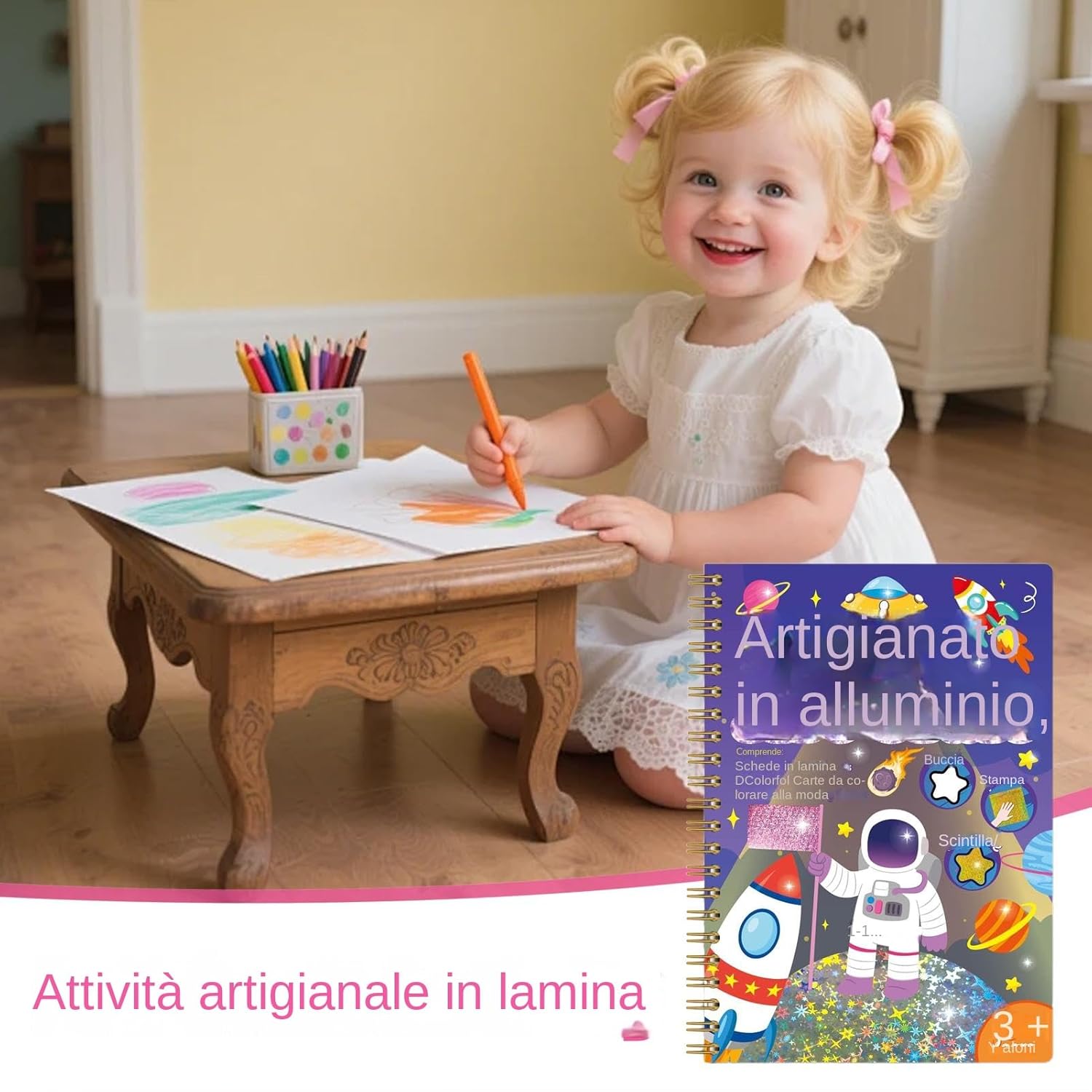 Regalo Divertente: Originale idea per celebrare eventi speciali e occasioni festive. Un modo innovativo per incoraggiare l'espressione artistica dei più piccoli, sviluppando abilità motorie mentre si condividono momenti di allegria familiare Sviluppo Motorio Fine: Kit creativo con fogli metallizzati che stimola l'apprendimento pratico migliorando le capacità motorie fini e alimentando la creatività, permettendo di realizzare progetti luminosi che regalano soddisfazione duratura ad ogni fase del processo creativo Temi artistici vari: Esplora kit creativi con design a tema Halloween, astronauti e Natale che stimolano la fantasia nella realizzazione di personaggi e scenari unici, ideali per sviluppare abilità manuali e creatività attraverso l'arte della lamina Creatività adattabile: Sfruttabile in contesti domestici ed educativi, valorizza feste e vacanze, accompagna piacevolmente gli spostamenti, supporta le attività scolastiche, diverte in spazi interni ed esterni, assicurando un'esperienza di foil crafting flessibile ovunque ci si trovi. Divertimento creativo organizzato: Goditi sessioni creative senza sporcare e senza stress con il kit di arte con laminatura, che include strappa, premi e solleva per creare opere luminose e brillanti in modo pulito e coinvolgente