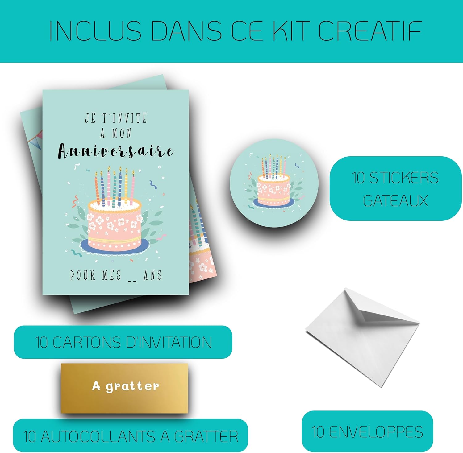 Set completo per una festa perfetta: questo pacchetto contiene 10 biglietti di invito da graffiare, 10 adesivi dorati e 10 buste bianche. Ideale per una preparazione semplice e veloce dell'evento, questi inviti renderanno la festa un momento memorabile per tutti gli ospiti Inviti a tema torta per piccoli gourmet: prepara una festa indimenticabile con i nostri biglietti di invito da grattare a tema torta. Ogni biglietto contiene un adesivo dorato da graffiare, promettendo una sorpresa golosa che susciterà interesse e curiosità di tutti i bambini Qualità superiore e design originale: i nostri biglietti d'invito sono progettati in Francia con carta di alta qualità. Ogni busta bianca inclusa completa perfettamente il design del biglietto, aggiungendo un tocco magico ed elegante per una festa di successo e ricordi garantiti Eco-Responsabile e Made in Francia: i nostri inviti sono realizzati con materiali ecologici e certificati Print Verde. Scegliendo questi prodotti, sostieni un concetto familiare e responsabile per feste eco-friendly. Personalizzazione Facile e Creativa: Ogni carta può essere personalizzata con le informazioni dell'evento utilizzando una penna o un pennarello. Un gioco divertente che incoraggerà i bambini a partecipare attivamente alla preparazione della loro festa!