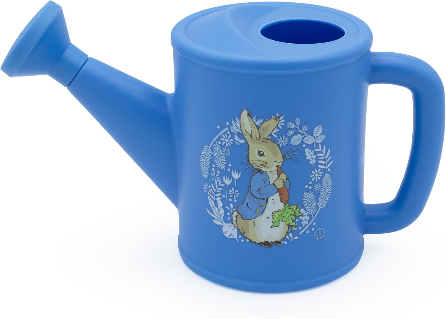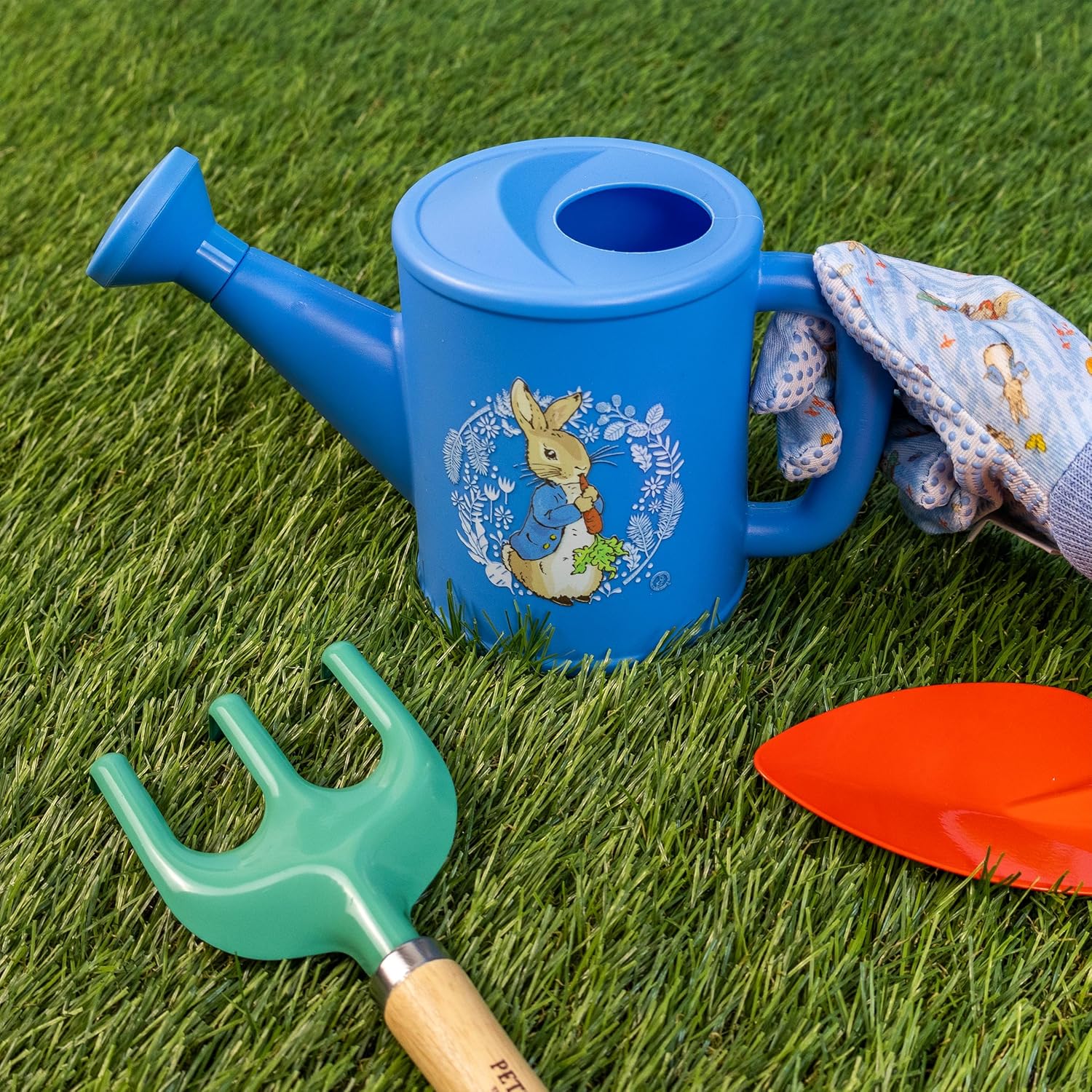 PERFETTO PER I BAMBINI PIÙ PICCOLI: questo set da giardinaggio da 5 pezzi luminoso e allegro è della dimensione perfetta per i bambini piccoli. Il set include un mini rastrello, una vanga, un annaffiatoio e guanti forniti in una robusta borsa per il trasporto che include numerose tasche per riporre gli attrezzi da giardino e i tesori. Costruito per durare: questo set di strumenti di alta qualità è realizzato in legno e metallo resistenti e robusti ed è stato progettato per durare e essere utilizzato all'aperto in giardino. I graziosi guanti da giardinaggio per bambini sono realizzati in resistente misto cotone e nylon e hanno impugnature imbottite antiscivolo sul palmo e sulle dita, nonché comodi polsini elastici per tenere sporco e detriti fuori dal guanto. I guanti possono essere facilmente lavati dopo l'uso per mantenerli puliti. GRANDE ATTIVITÀ IN GIARDINO: questo set di attrezzi da giardino è perfetto per tenere occupate le piccole mani in giardino. I manici in legno liscio sugli strumenti sono comodi da tenere in mano per i bambini piccoli e l'annaffiatoio è realizzato in plastica robusta ma leggera ed è della misura giusta per le mani dei più piccoli. La borsa per il trasporto è realizzata in nylon resistente ed è dotata di sette tasche portaoggetti e maniglie. Divertimento all'aria aperta: incoraggiare i bambini a trascorrere il tempo libero promuovendo le attività all'aria aperta e l'interesse per il giardinaggio e la natura. Questo set da giardinaggio è perfetto per far divertire i bambini a scavare, piantare e giocare all'aperto. REGALO CON LICENZA UFFICIALE: la grafica dei personaggi su questo set da giardinaggio per bambini luminoso e allegro lo rende un regalo perfetto per i fan di Peter Rabbit. Il set è un regalo di Beatrix Potter con licenza ufficiale.
