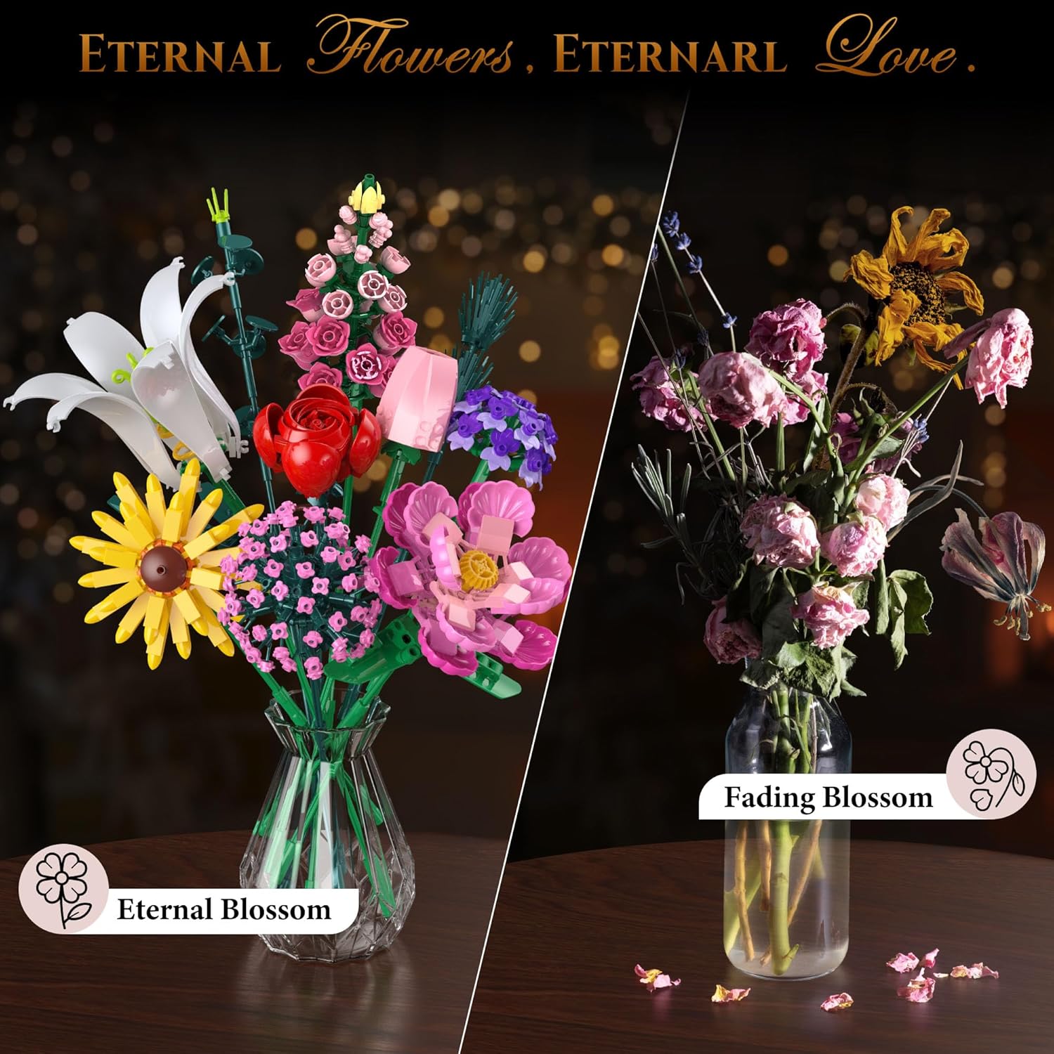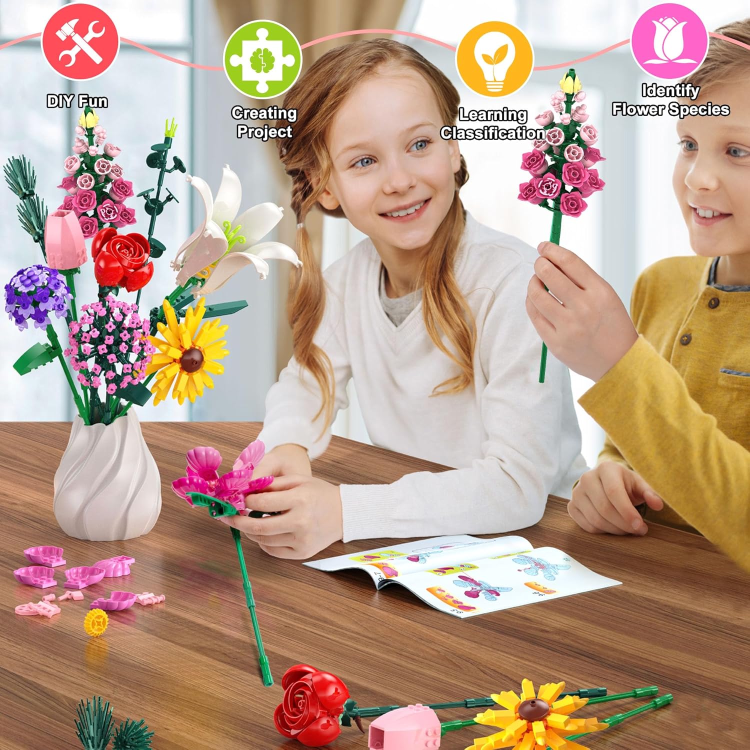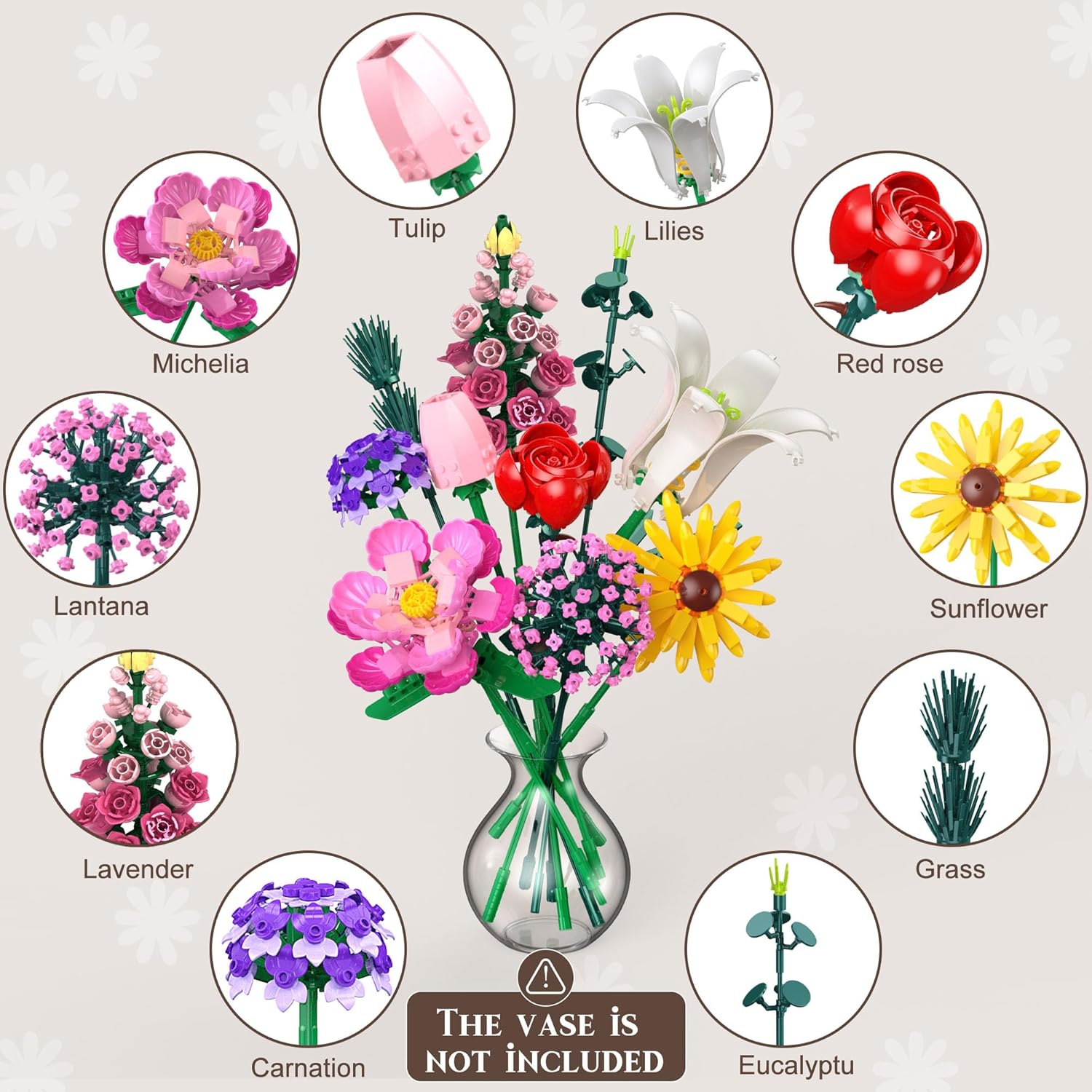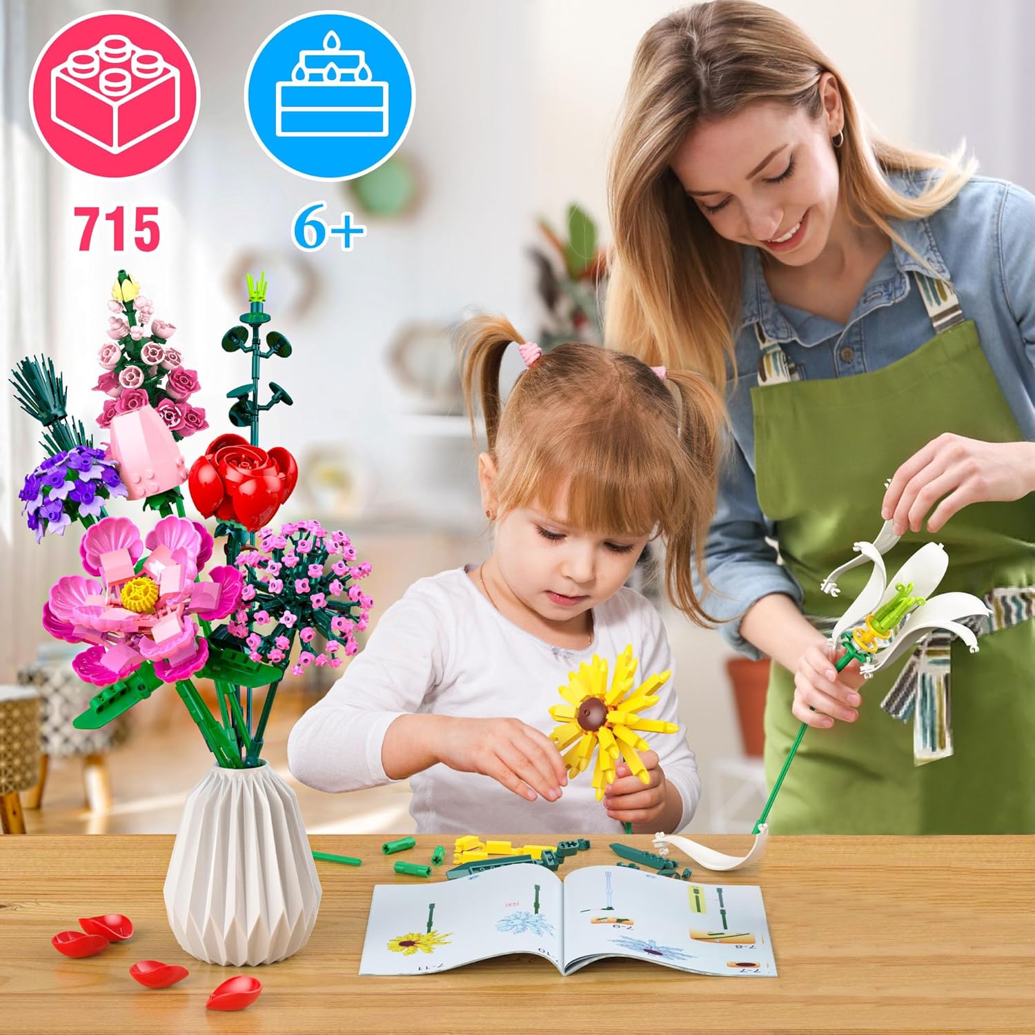 【Esperienza Educativa e Divertente di Costruzione】Questo set di bouquet, con 721 pezzi, è progettato per bambini di 6 anni e più. Include dieci tipi di fiori (gigli, garofani, girasoli, rose, ecc.). I bambini si divertono a creare e migliorano la coordinazione mano-occhio, la consapevolezza spaziale e il pensiero logico. Ogni pezzo è come un puzzle, stimolando l'interesse per il design strutturale 【Dieci Fiori, Creatività Infinita】Il set include dieci fiori realistici, dalla lavanda alle rose rosse. I bambini possono combinare colori e forme per creare un bouquet unico. Questa varietà stimola l'espressione estetica e la creatività, come nel design floreale reale 【Un regalo Senza Tempo Ricco di Significato】Questo bouquet eterno, ideale per la Festa della Mamma, San Valentino o la laurea, simboleggia amore e crescita. Può essere esposto su una scrivania o nel soggiorno, diventando un punto focale decorativo e conservando bei ricordi. Rispetto ai fiori freschi, è più ecologico 【Strumento Divertente che Integra l'educazione STEM】Durante la costruzione, i bambini imparano la struttura delle piante, la disposizione dei petali simmetrici e altri dettagli. Apprendono la crescita delle piante, come la germinazione e i bisogni di luce. È anche un'opportunità per ampliare le lezioni di scienze naturali, includendo giochi sul giardinaggio 【Dettagli di Progettazione Sicuri e Riflessivi】I mattoncini sono lisci, senza angoli appuntiti, e rispettano gli standard di sicurezza per bambini. Il set è fornito con istruzioni chiare che permettono ai bambini di 6 anni e più di costruire in modo autonomo. I più piccoli possono costruire insieme ai genitori, creando momenti familiari interattivi