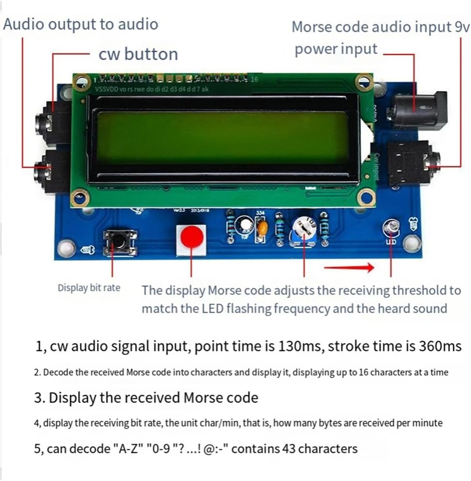 2. Può riconoscere i punti (.), i trattini (-) e gli intervalli del codice Morse e convertirli nei caratteri o numeri corrispondenti. 1. Questo kit fai-da-te per decodificatore di codice Morse CW è utile per studenti e appassionati di elettronica per apprendere, comprendere e praticare il codice Morse. 4. Può decodificare il tono del codice Morse ricevuto in caratteri e visualizzare il bit rate ricevuto. 3. Supporta l'ingresso del segnale audio CW e visualizza il codice Morse ricevuto. 5. Il codice Morse era ampiamente utilizzato nelle prime comunicazioni wireless e non era solo un metodo di comunicazione, ma anche un hobby e una sfida, un modo per comprendere e apprendere la tecnologia delle telecomunicazioni.