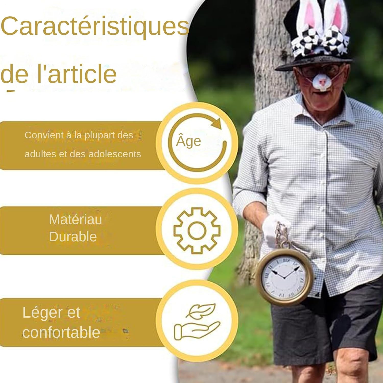 Descrizione prodotto Composto da quattro pezzi, questo set di accessori per costume da coniglietto bianco è perfetto per Pasqua, feste di Halloween, accessori cosplay per la danza del tè e molto altro. Progettato per adulti, donne, uomini e adulti, aggiunge fascino agli eventi di gioco di ruolo, alle riunioni e alle celebrazioni pasquali. La sua versatilità lo rende un must per le feste creative e a tema. Specifiche: Nome del prodotto: set di accessori per costume da coniglio bianco Materiale: tessuto, ABS Dimensioni del prodotto: come mostrato nell'immagine La confezione include: set da 4 pezzi (1 cappello con orecchie di coniglio, 1 paio di guanti bianchi, 1 orologio, 1 naso di coniglio) Lista di imballaggio: set da 4 pezzi (1 cappello con orecchie di coniglio, 1 paio di guanti bianchi, 1 orologio, 1 naso di coniglio) Nota: A causa delle diverse impostazioni di illuminazione e schermo, il colore dell'articolo potrebbe essere leggermente diverso dall'immagine. A causa delle diverse misurazioni manuali, si prega di consentire una differenza di 1-2 cm. Avviso di sicurezza Non applicabile