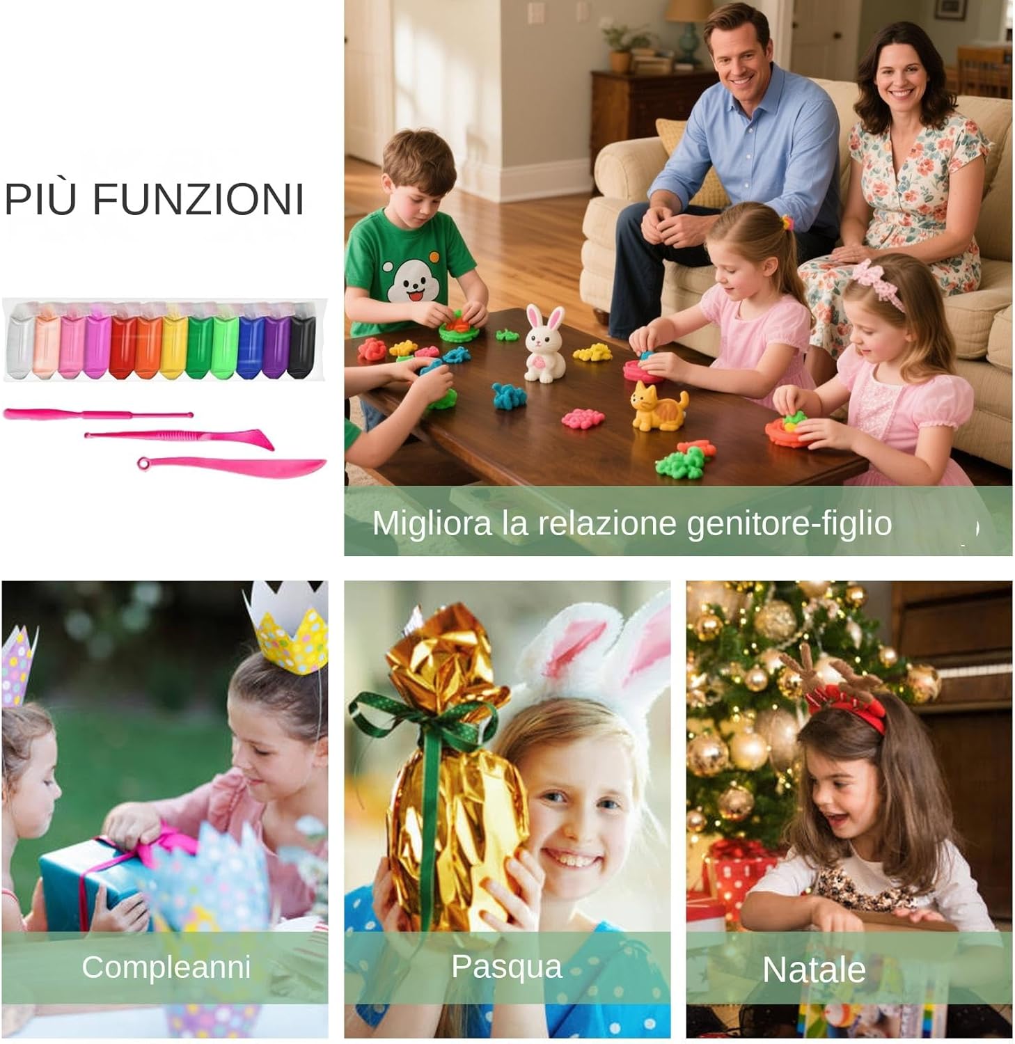 Versatilità Artistica: vivaci con tecnologia di stratificazione cromatica che stimola la percezione visiva, offrendo soluzioni creative diversificate per adattarsi a differenti livelli di abilità e preferenze stilistiche Flessibilità Senza Limiti: Maggiore malleabilità con ogni impasto - la consistenza ultra leggera e non appicciosa si adatta naturalmente a ogni forma creativa Motricità fine e cognitivo: La manipolazione della pasta modellabile stimola la risoluzione creativa di problemi e rafforza i muscoli delle mani, incoraggiando l'interesse per esperienze di apprendimento pratico in totale sicurezza favorendo lo sviluppo cognitivo attraverso attività tattili coinvolgenti Creazioni Cosmiche Uniche: Combinazione innovativa di tracce stellari, frammenti meteoritici e plastilina spaziale per progettare scenari tematici dettagliati. Le particelle integrate favoriscono la realizzazione di texture cosmiche realistiche, potenziando l'immaginazione esplorativa. Separazione Efficiente: La struttura compartimentata mantiene i colori distinti durante l'uso collettivo, offrendo maneggevolezza ottimale grazie agli strumenti ergonomici inclusi per manipolazione precisa e senza sforzo