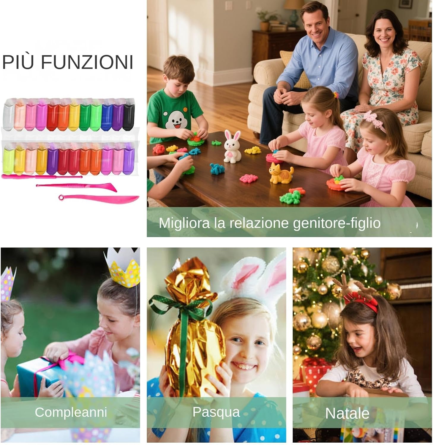 Fusione Creativa: Sperimenta l'effetto sovrapposizione con creta miscelabile che genera infinite combinazioni, alimentando l'immaginazione e rafforzando la consapevolezza delle armonie cromatiche durante il gioco educativo Materiale Leggero per Dettagli: La texture ultra leggera permette di modellare con precisione, mantenendo flessibilità e morbidezza ottimale senza sbavature o residui Motricità fine e cognitivo: La manipolazione della pasta modellabile stimola la risoluzione creativa di problemi e rafforza i muscoli delle mani, incoraggiando l'interesse per esperienze di apprendimento pratico in totale sicurezza favorendo lo sviluppo cognitivo attraverso attività tattili coinvolgenti Creazioni Cosmiche Uniche: Combinazione innovativa di tracce stellari, frammenti meteoritici e plastilina spaziale per progettare scenari tematici dettagliati. Le particelle integrate favoriscono la realizzazione di texture cosmiche realistiche, potenziando l'immaginazione esplorativa. Separazione Efficiente: La struttura compartimentata mantiene i colori distinti durante l'uso collettivo, offrendo maneggevolezza ottimale grazie agli strumenti ergonomici inclusi per manipolazione precisa e senza sforzo